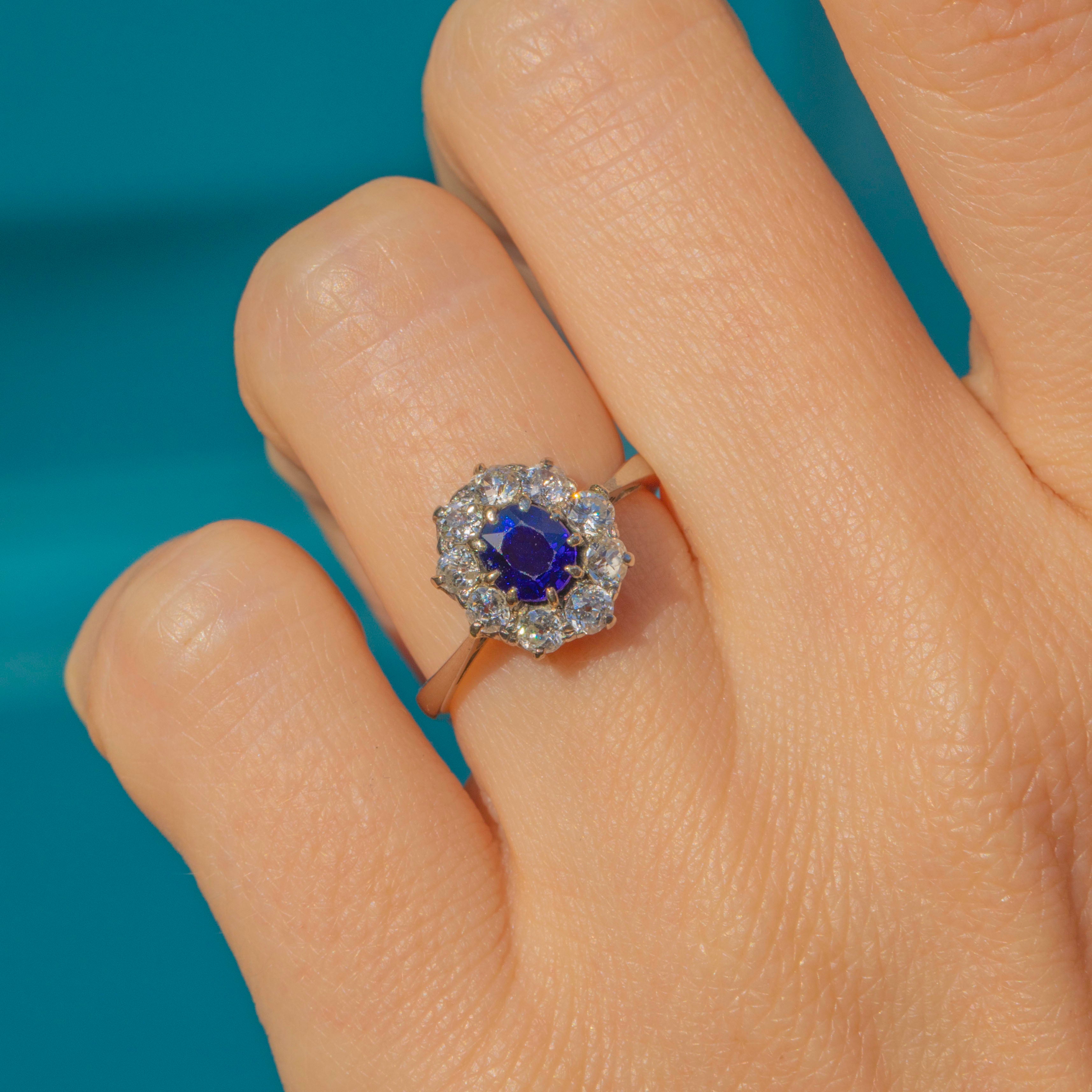Antique 18ct Gold Royal Blue Natural Sapphire Diamond Cluster Ring