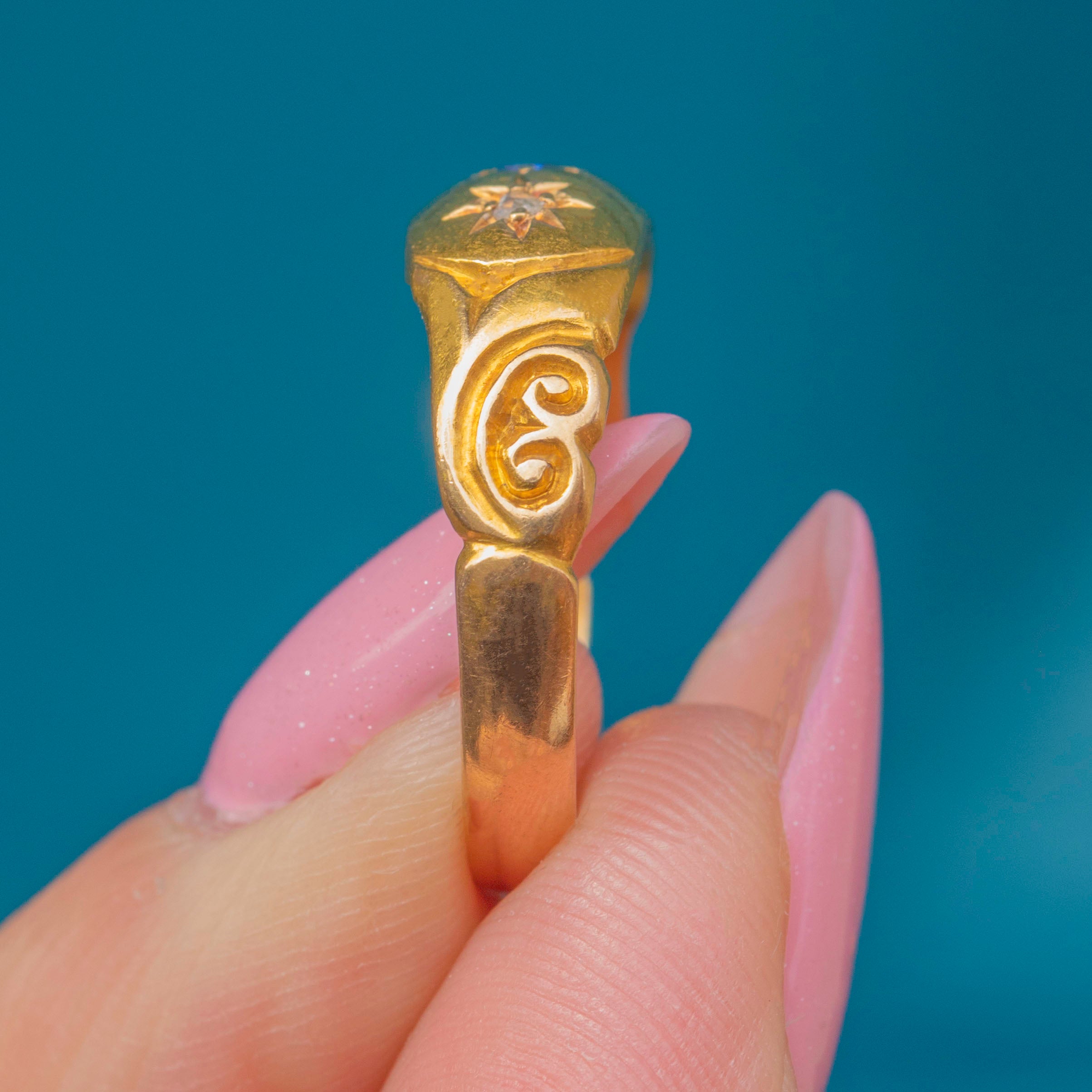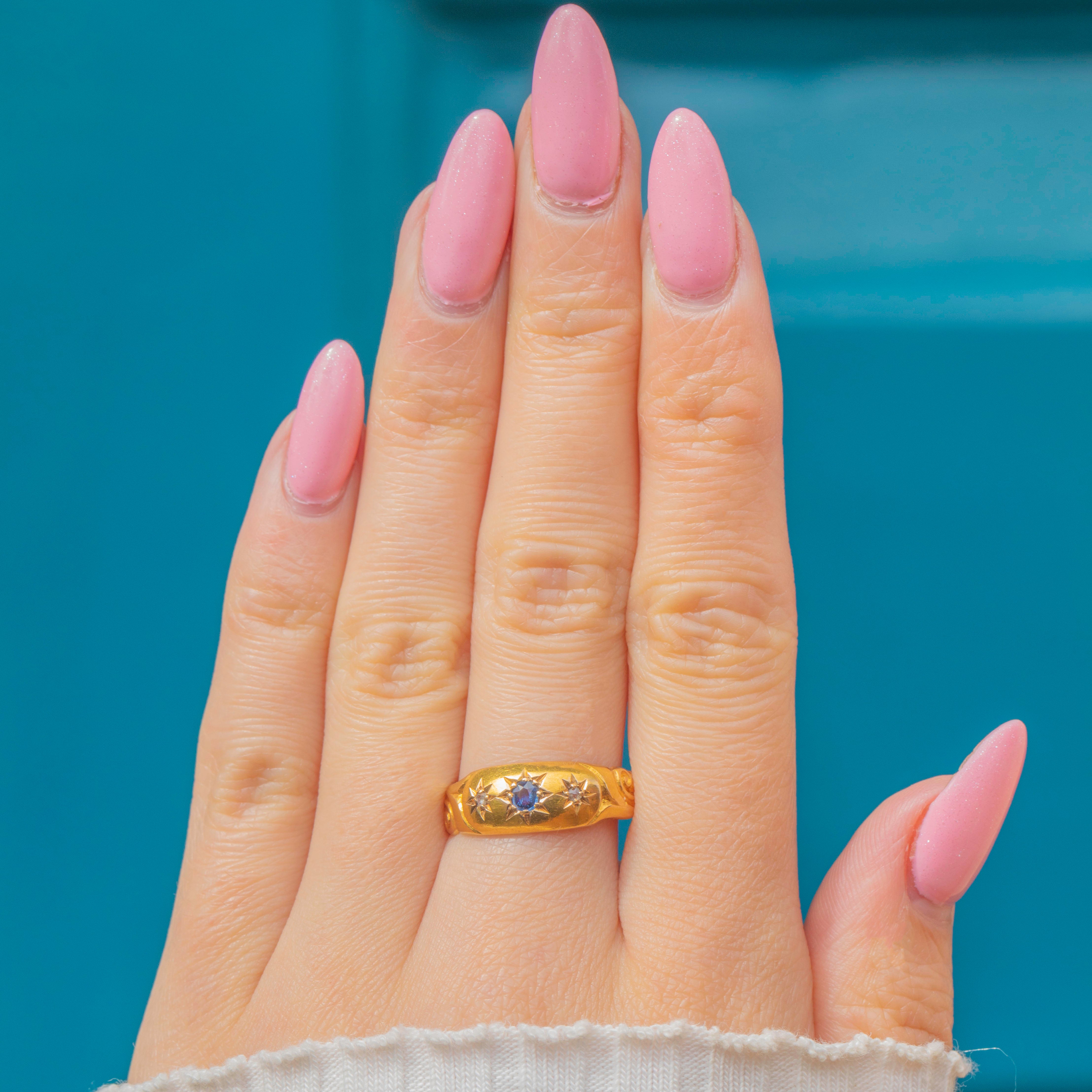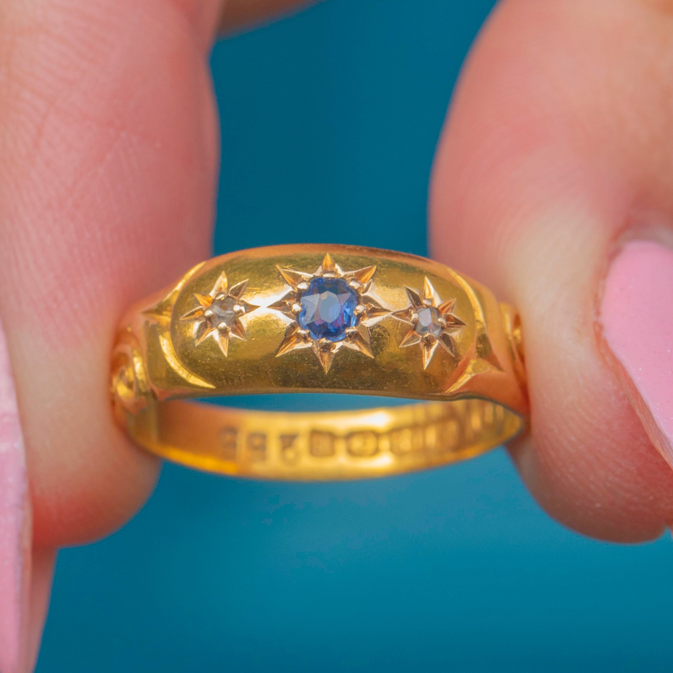 This Edwardian 18ct Gold Sapphire Diamond gypsy ring is a celestial dream! Crafted from brightly saturated 18ct Gold, this Edwardian ring boasts a vibrant Sapphire flanked by dainty Diamonds, all displayed within bold star settings and framed by intricate, swirling details.