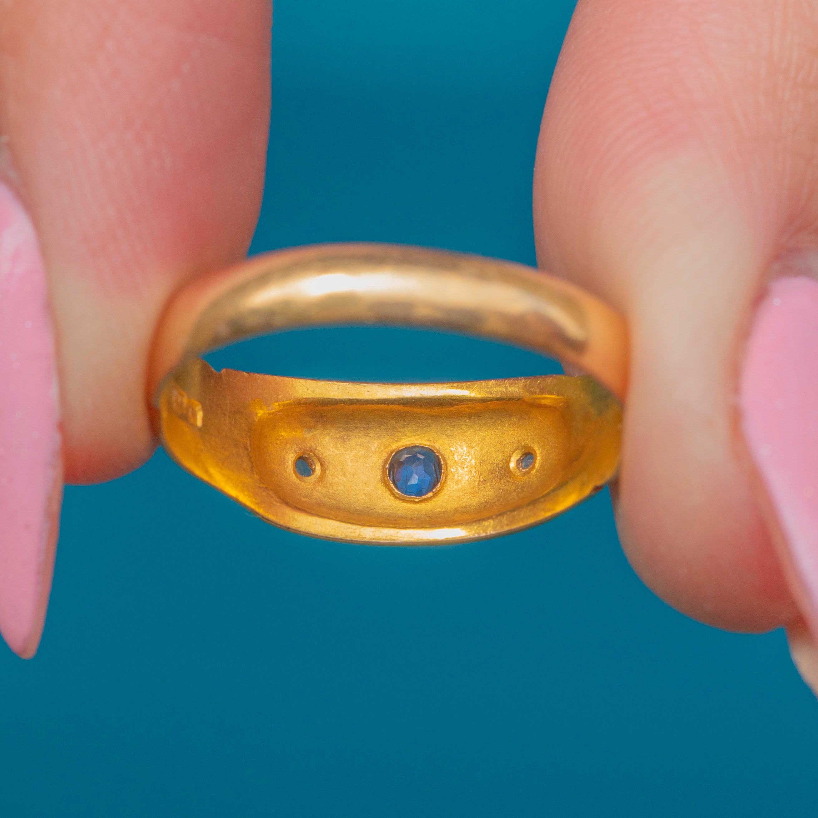 VERY GOOD-EXCELLENT: This Edwardian 18ct Gold Sapphire Diamond gypsy ring is in lovely condition. The Gold has a sumptuous hue and is bright and glossy. The gemstones are all securely set and free from chips or surface wear. There is some mild age-related wear to the band, but it remains smooth and comfortable to wear. The hallmarks are crisp and fully legible, allowing us to accurately date it to 1905!
