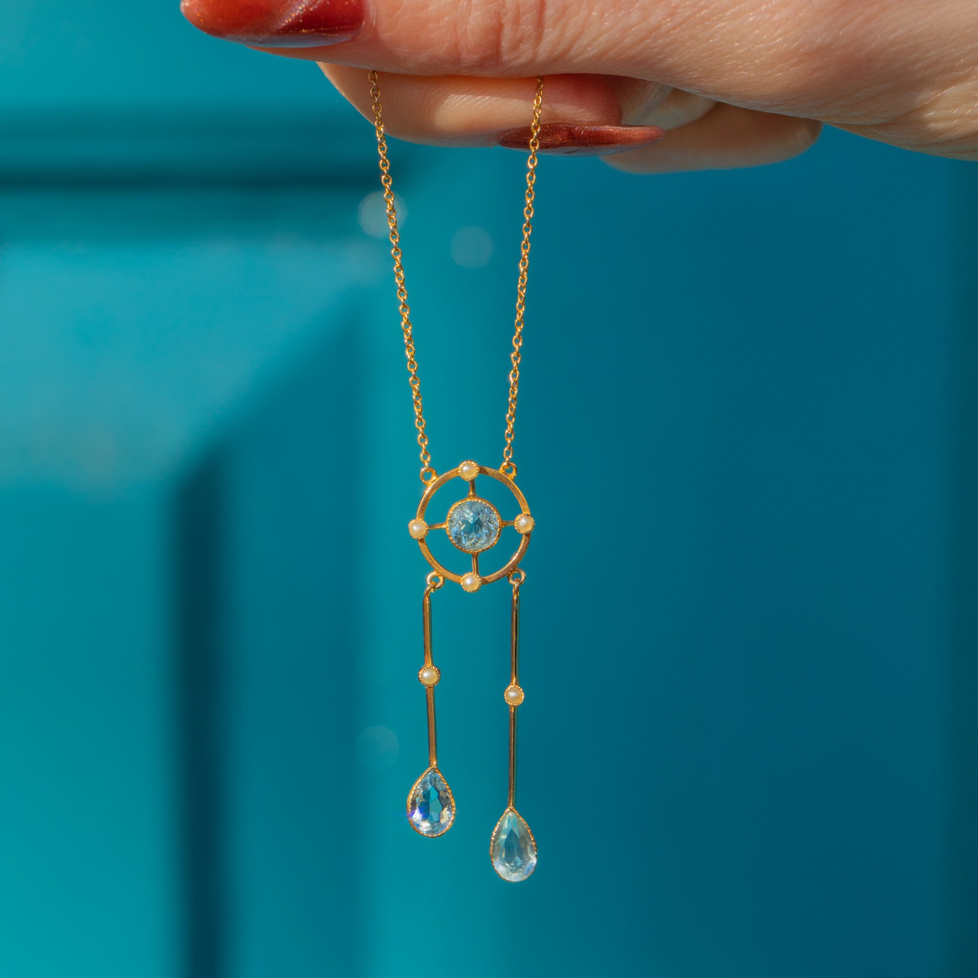 Add antique elegance to your collection with this Edwardian 9ct Gold Aquamarine Pearl negligee necklace!