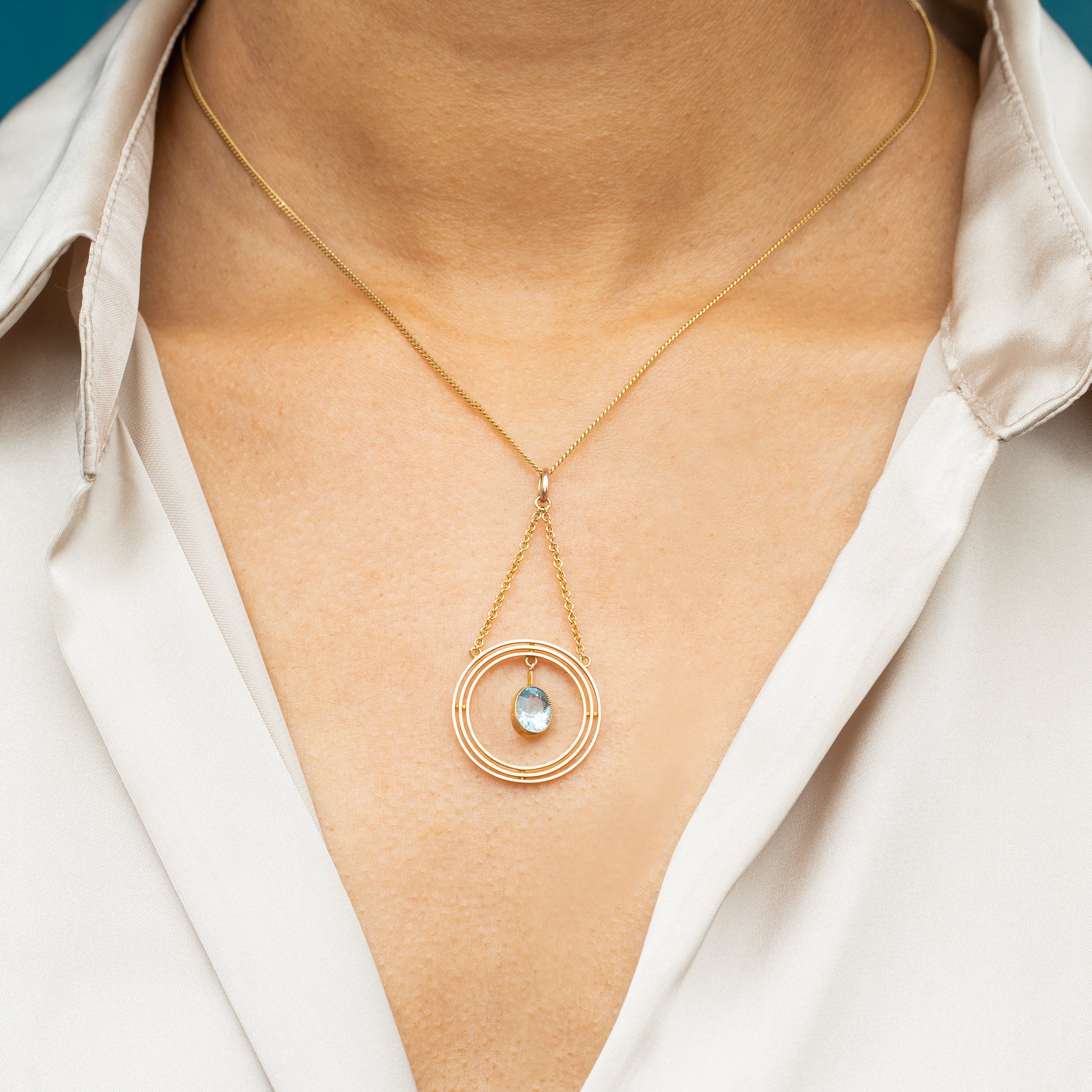 Plucked from the prettiest era, this Edwardian 9ct Gold Aquamarine pendant is heavenly! This antique pendant provides plentiful movement, with her arctic blue Aquamarine swinging in the centre of her perfectly formed 9ct Gold rings.