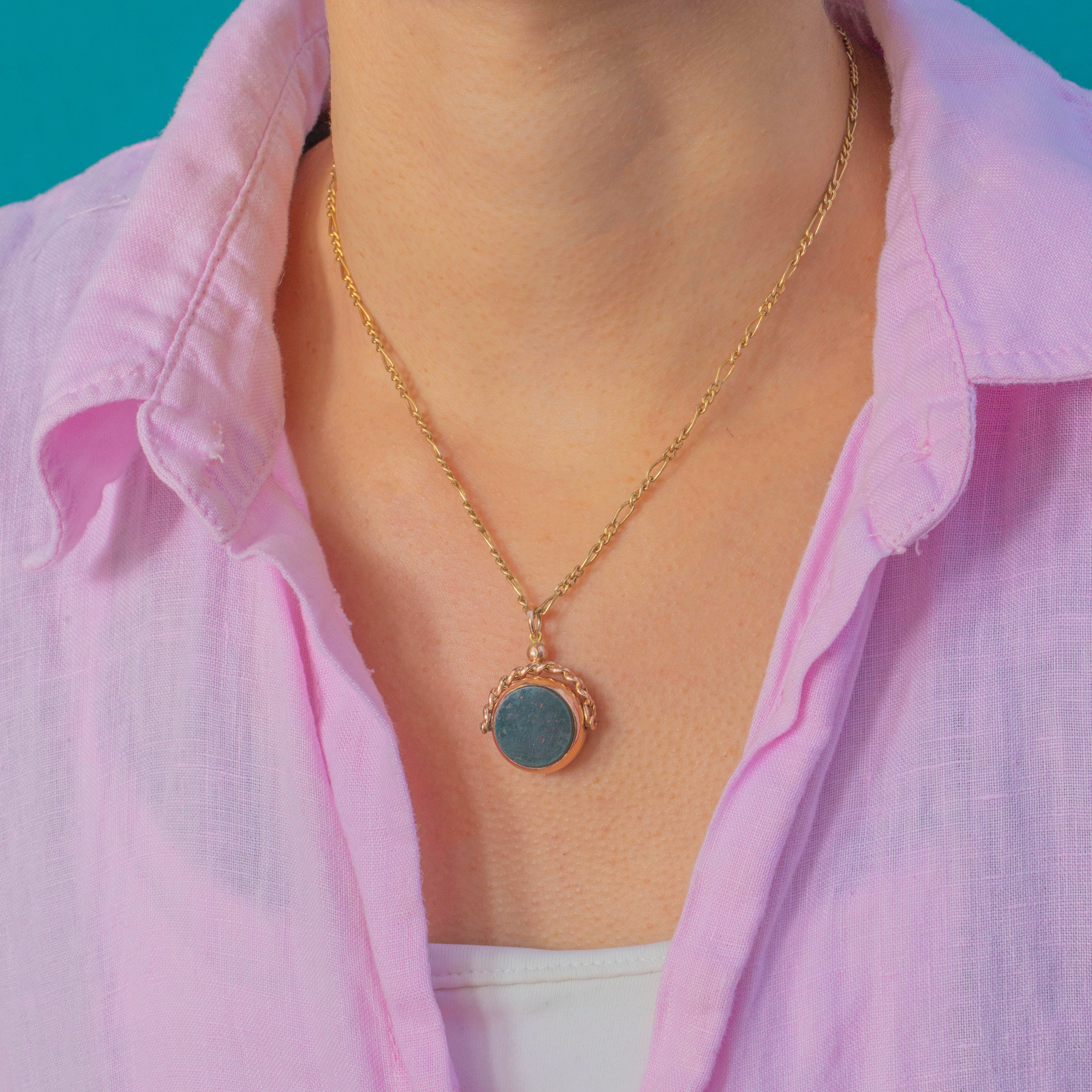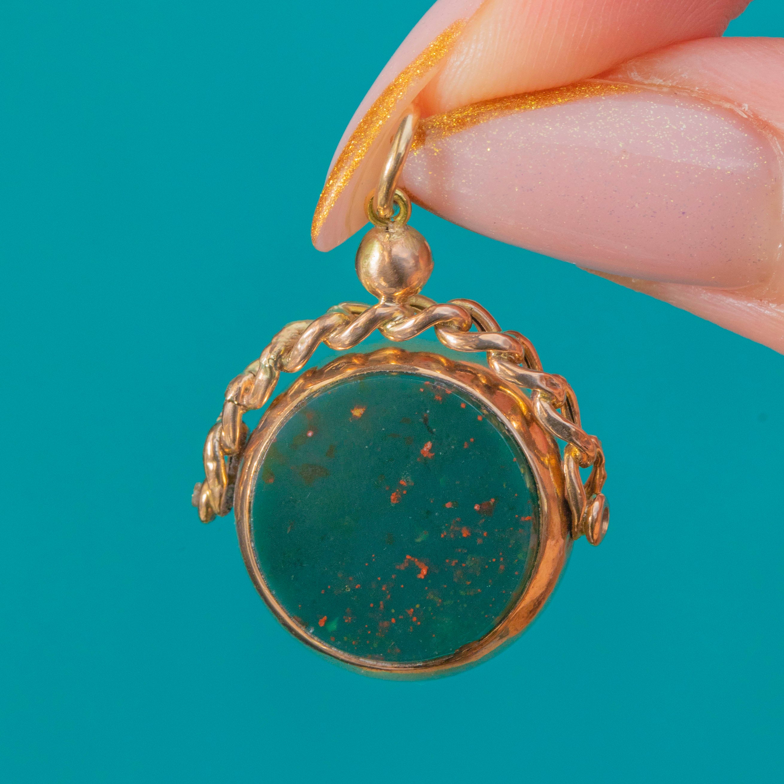 This Edwardian 9ct Gold spinner fob, dated 1912, features a classic combination of deep green Bloodstone on one side and warm orange Carnelian on the other. The rotating design allows it to be worn showing either gemstone, making it a versatile and timeless antique accessory.