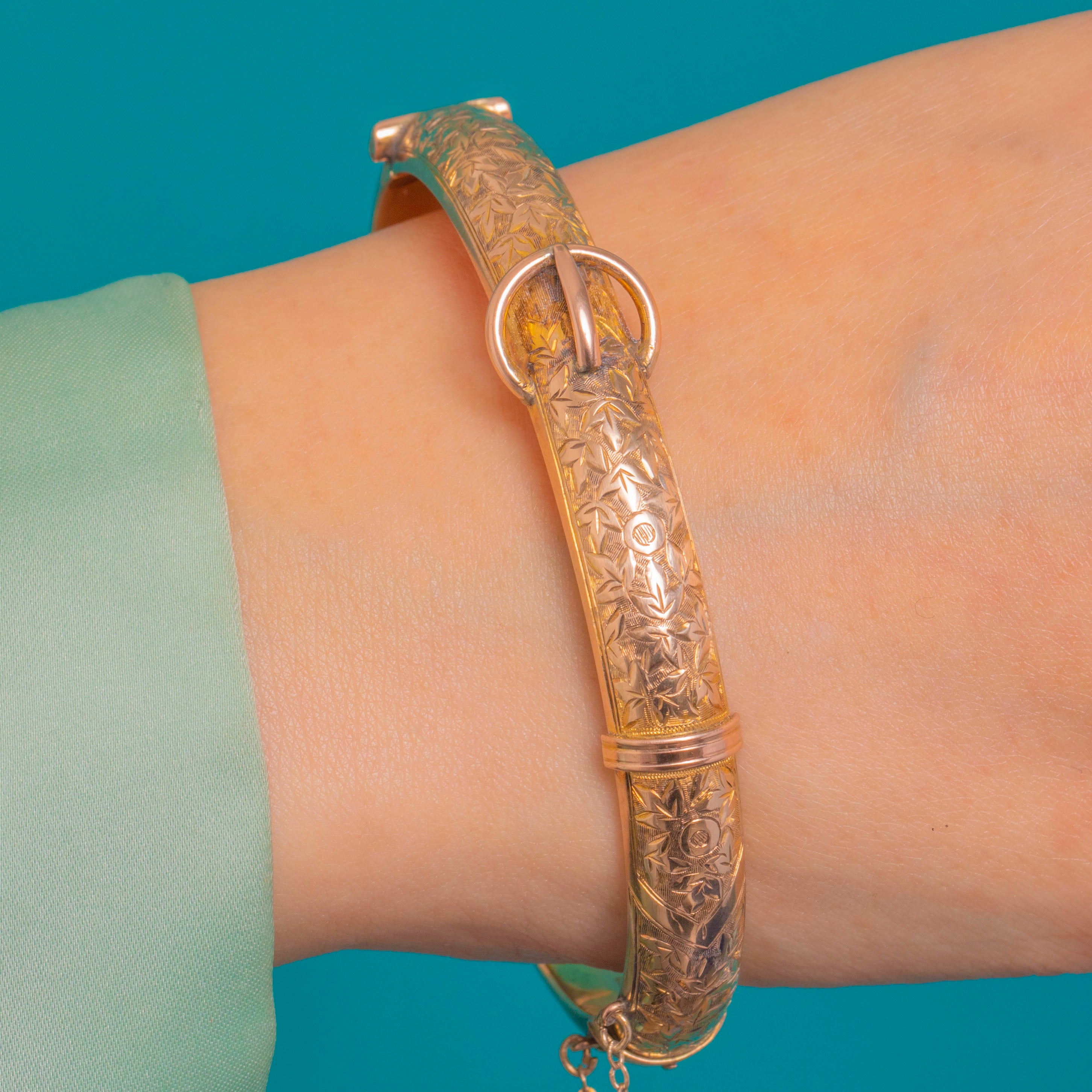 A classic Edwardian buckle bangle in 9ct Gold, hallmarked for Chester 1902. The front is beautifully adorned with a raised belt-and-buckle motif over dense bright-cut foliate engravings, contrasted with a sleek polished section. Its warm rosy hue and domed profile create a refined, elegant presence on the wrist.