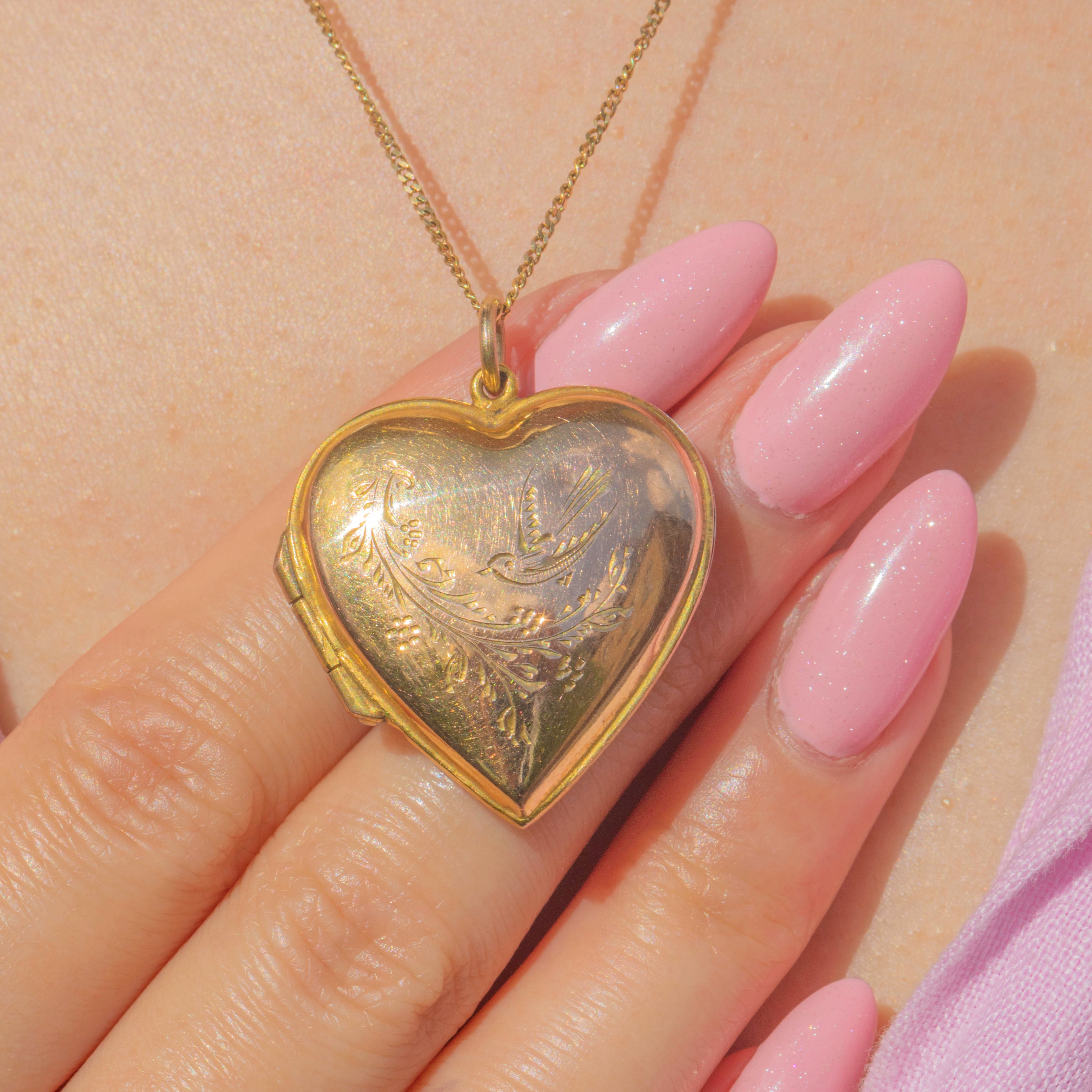 This Edwardian 9ct Gold engraved heart locket exudes romantic charm! The silky 9ct Gold has been formed into a smooth heart form, displaying finely engraved florals curving around the edge with a bird in flight swooping across its centre.