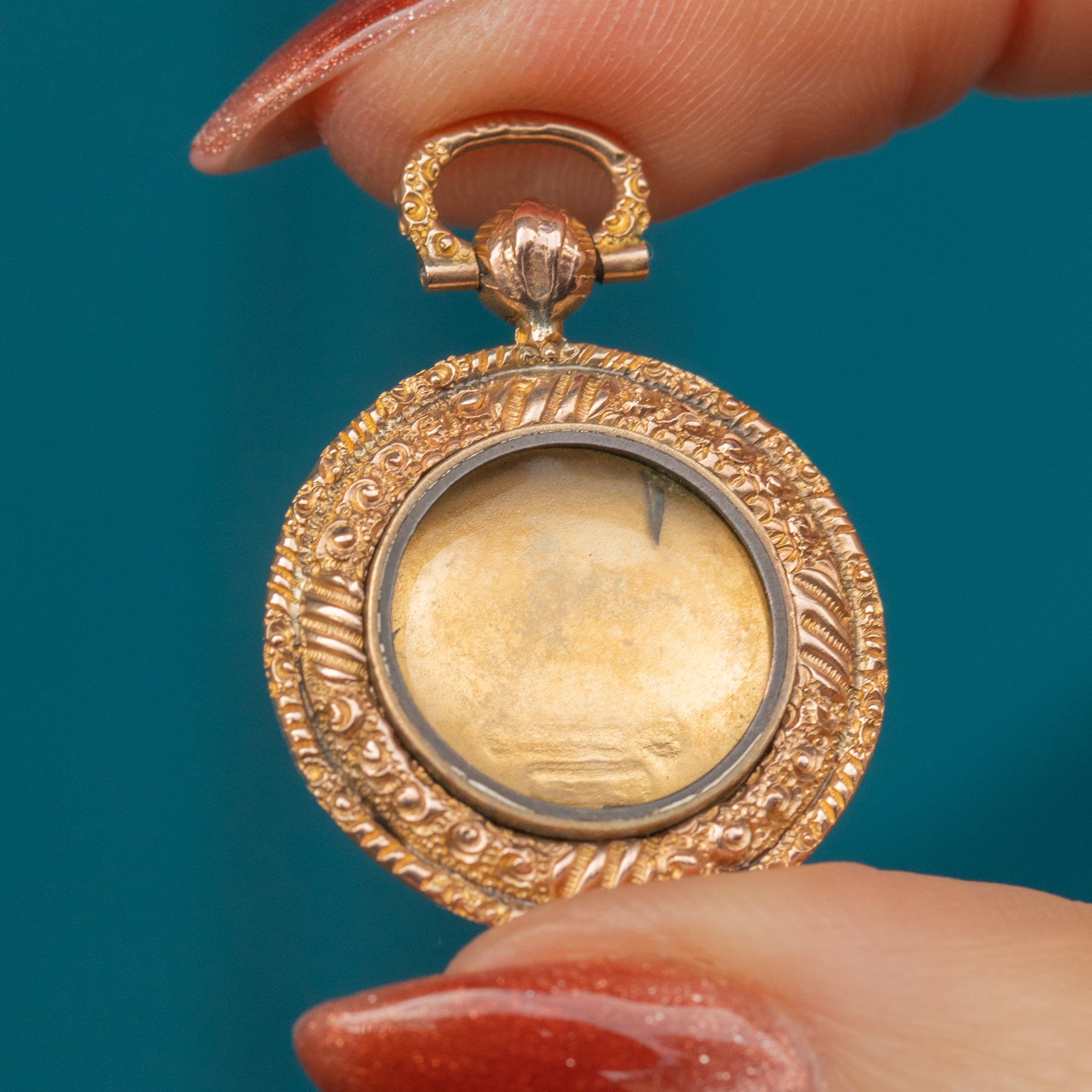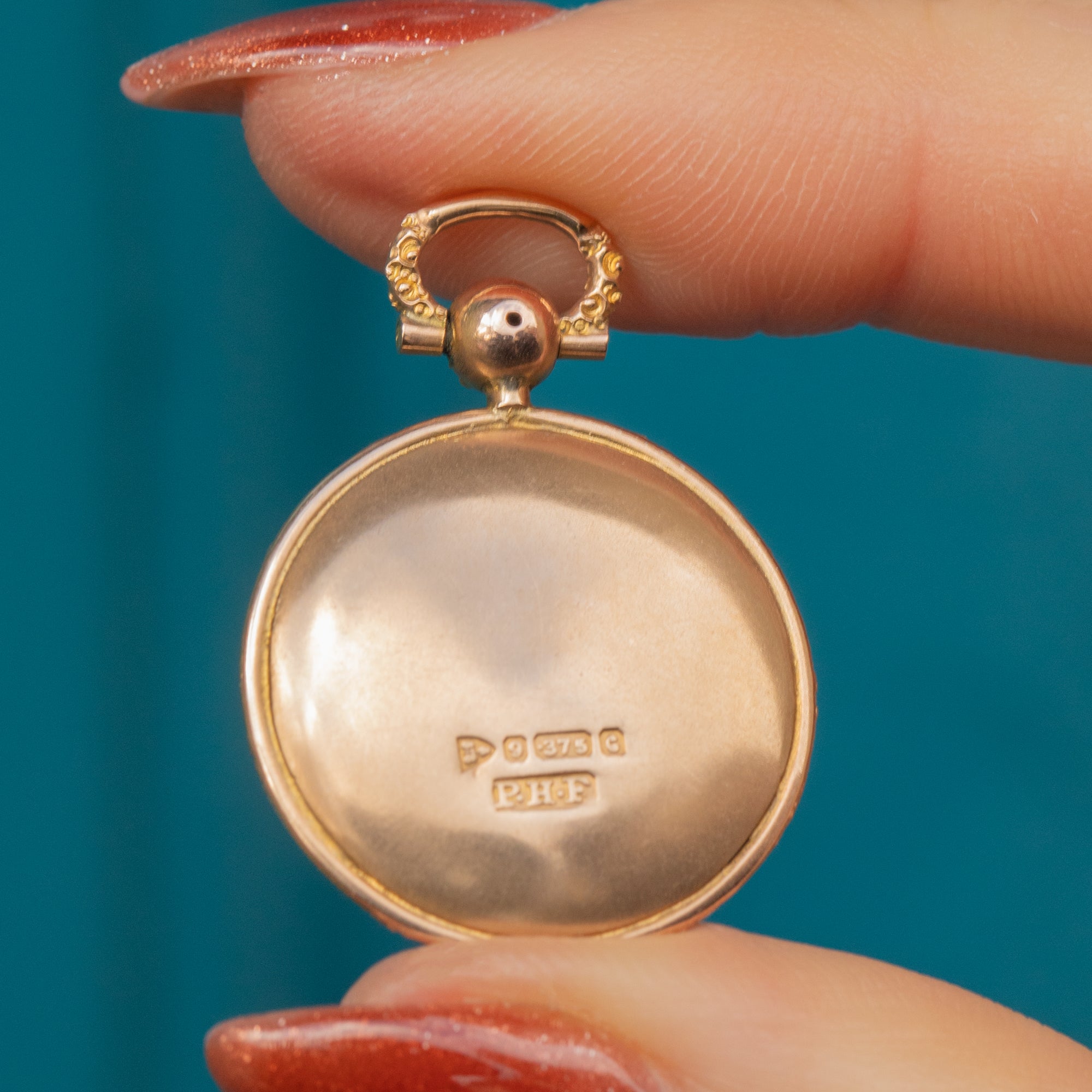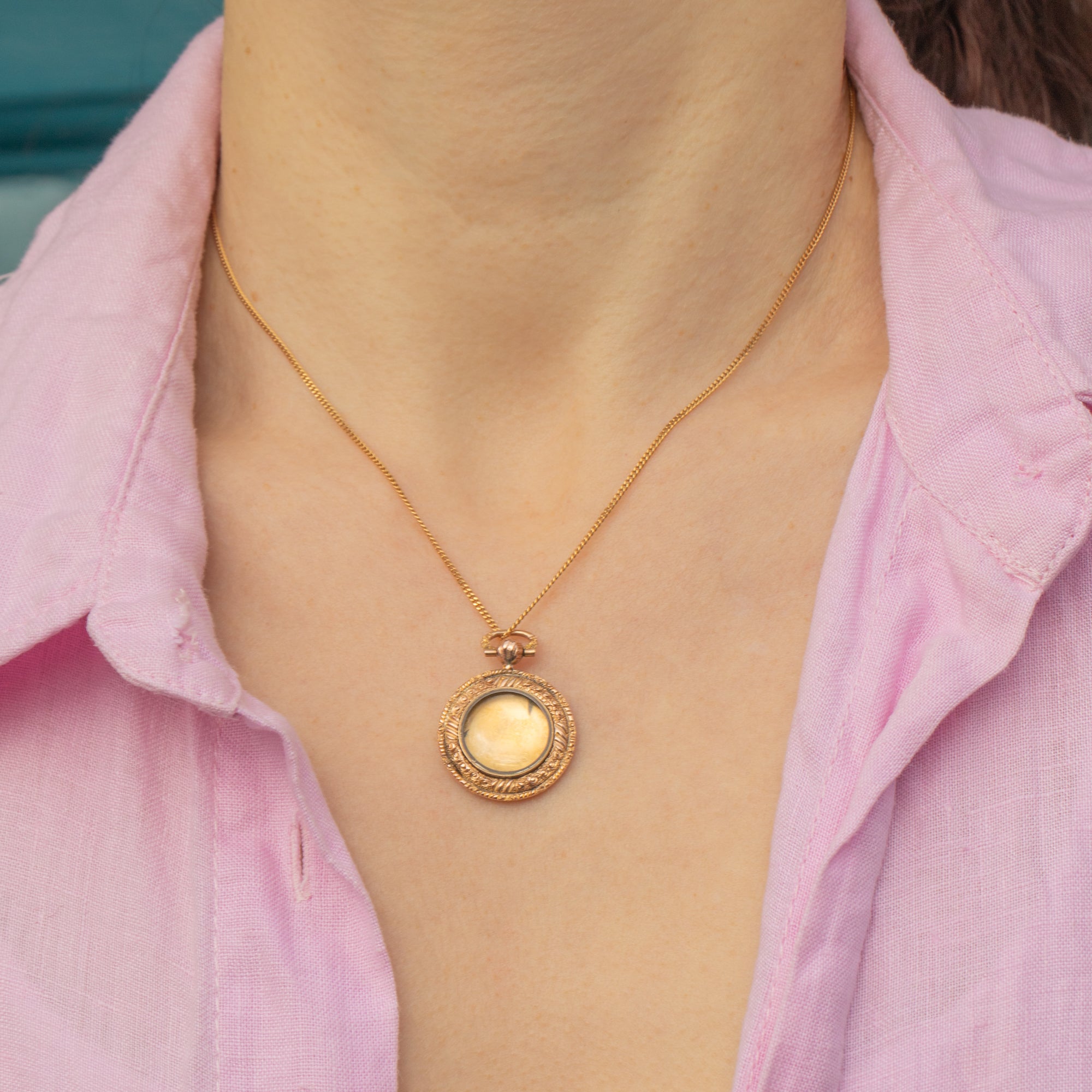 Encased in warm 9ct Gold, her outer edge is delicately engraved adding an extra touch of antique charm. Her elegant form and timeless beauty make her the perfect piece to adorn your décolletage, suspended from your favourite Gold chain. A sentimental keepsake or a luxurious treat, she’s a true Edwardian dream!