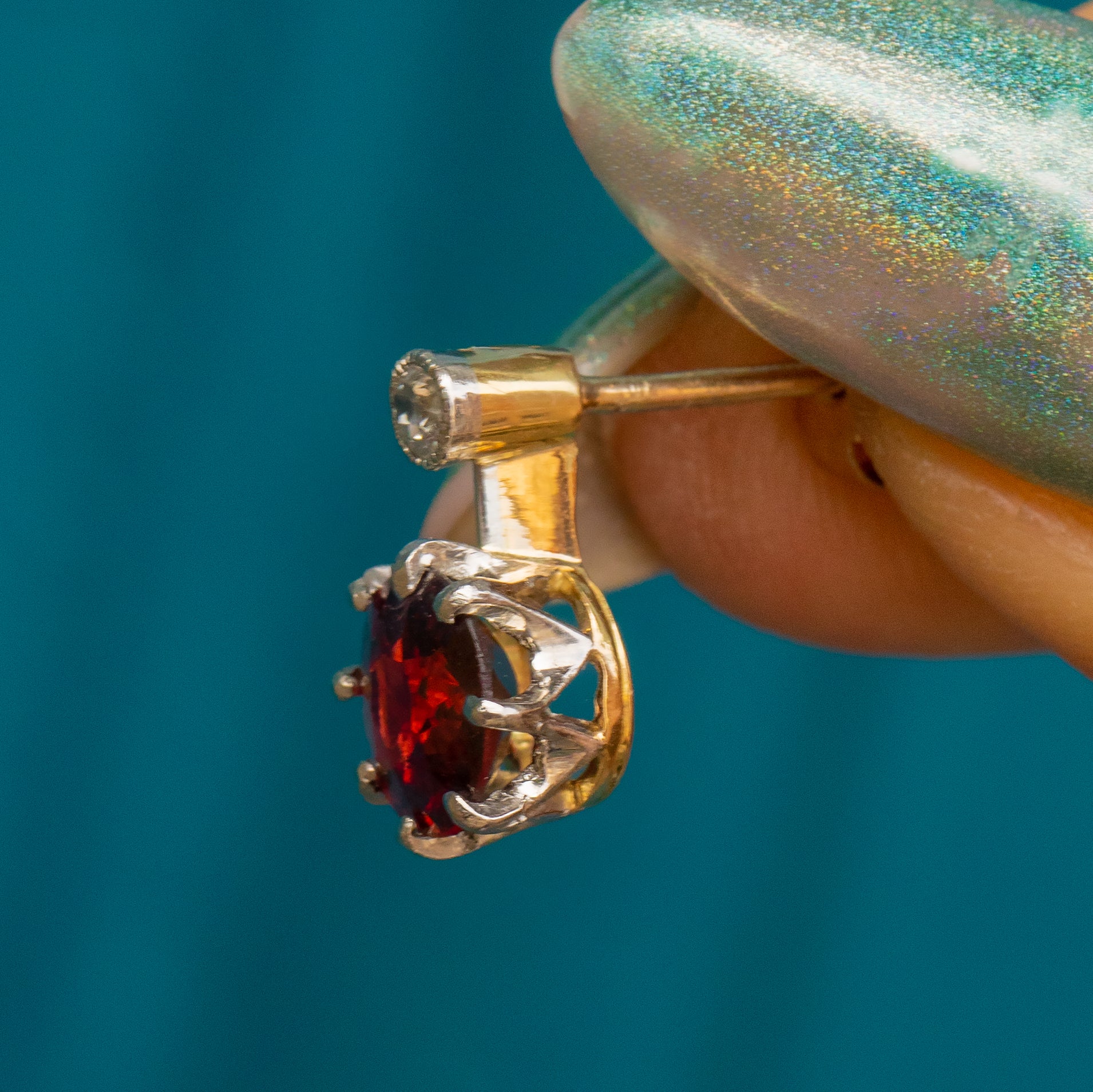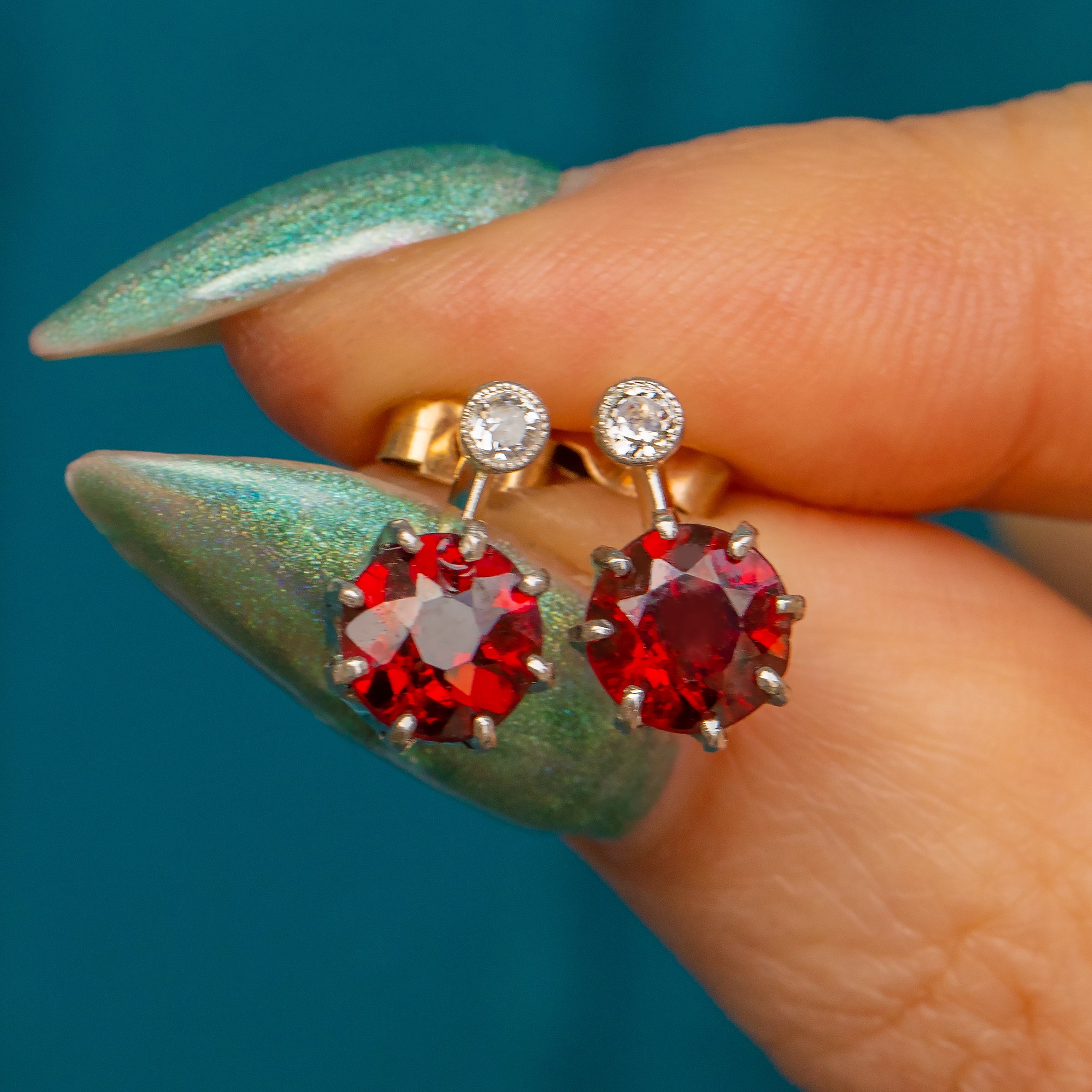 VERY GOOD-EXCELLENT. These Edwardian 9ct Gold Garnet Diamond earrings are in wonderful condition. The Garnets and Diamonds are secure with a lovely contrasting glisten. One of the Garnets has a small nibble mark, but this can't be seen as it is nestled amongst the claws. The Gold and Platinum have retained good form and make for a comfortable pair to adorn your lobes.