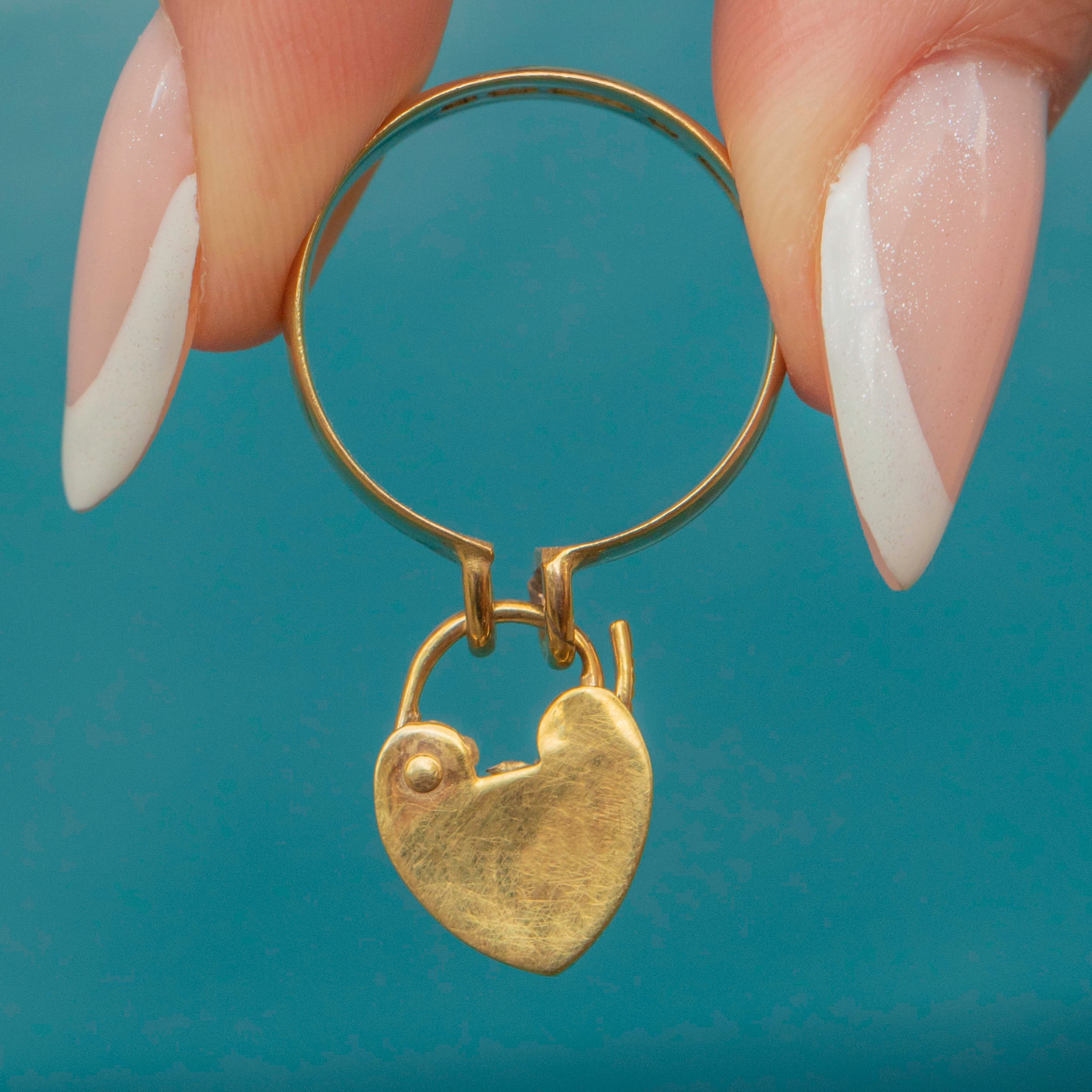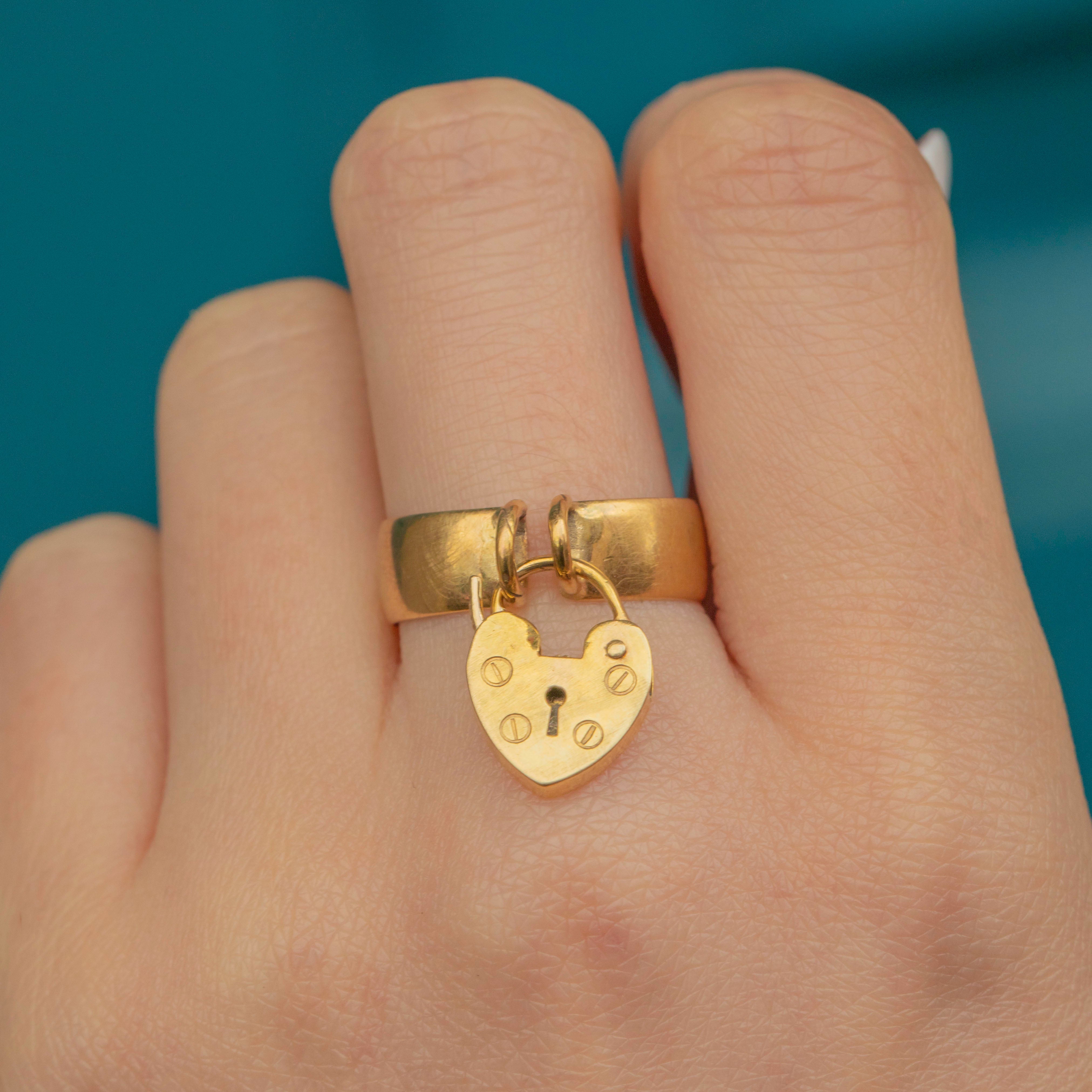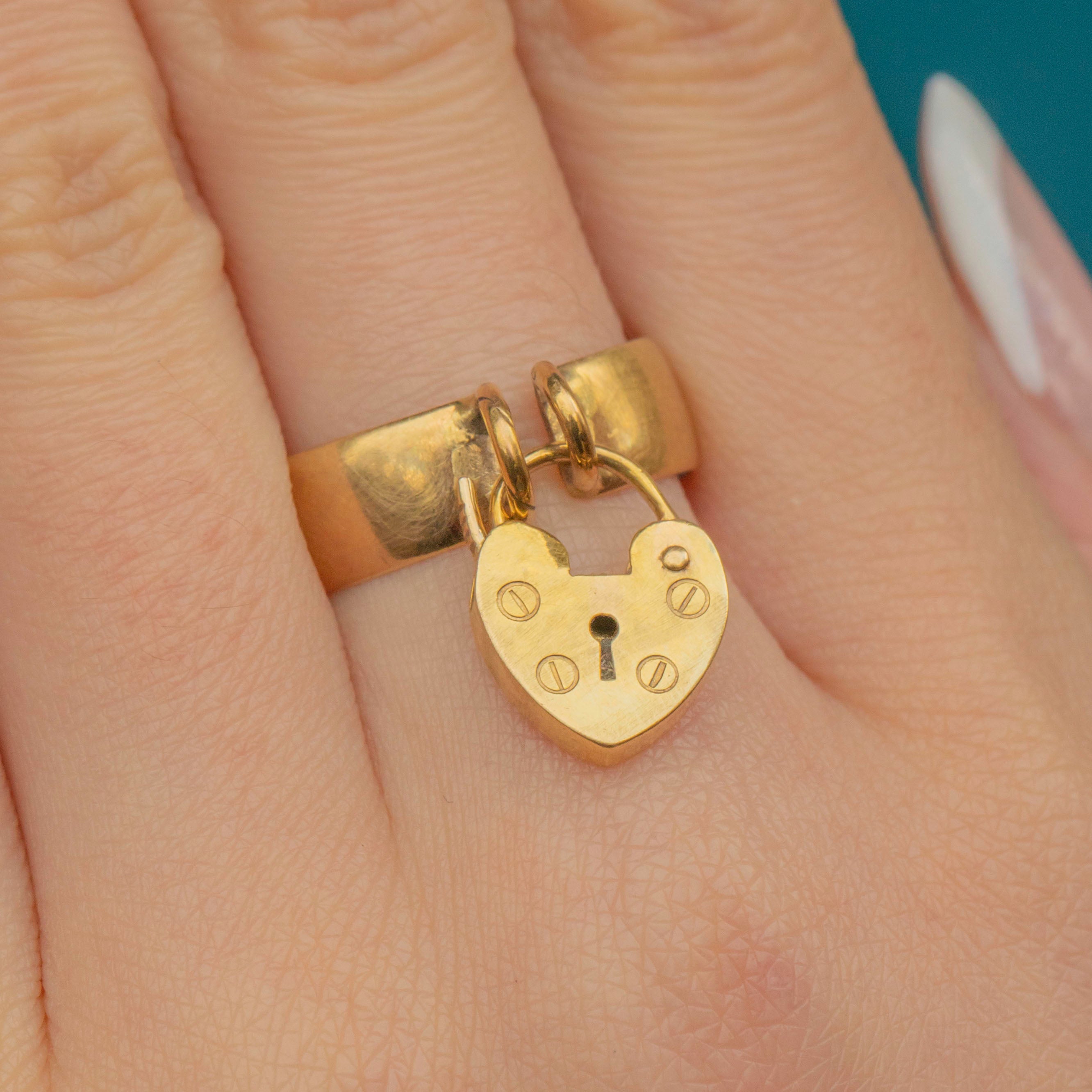 This Edwardian 9ct Gold ring exudes antique charm! The chubby 9ct Gold band gives this antique ring a robust and expensive feel, fastened around your finger with a cute heart padlock.
