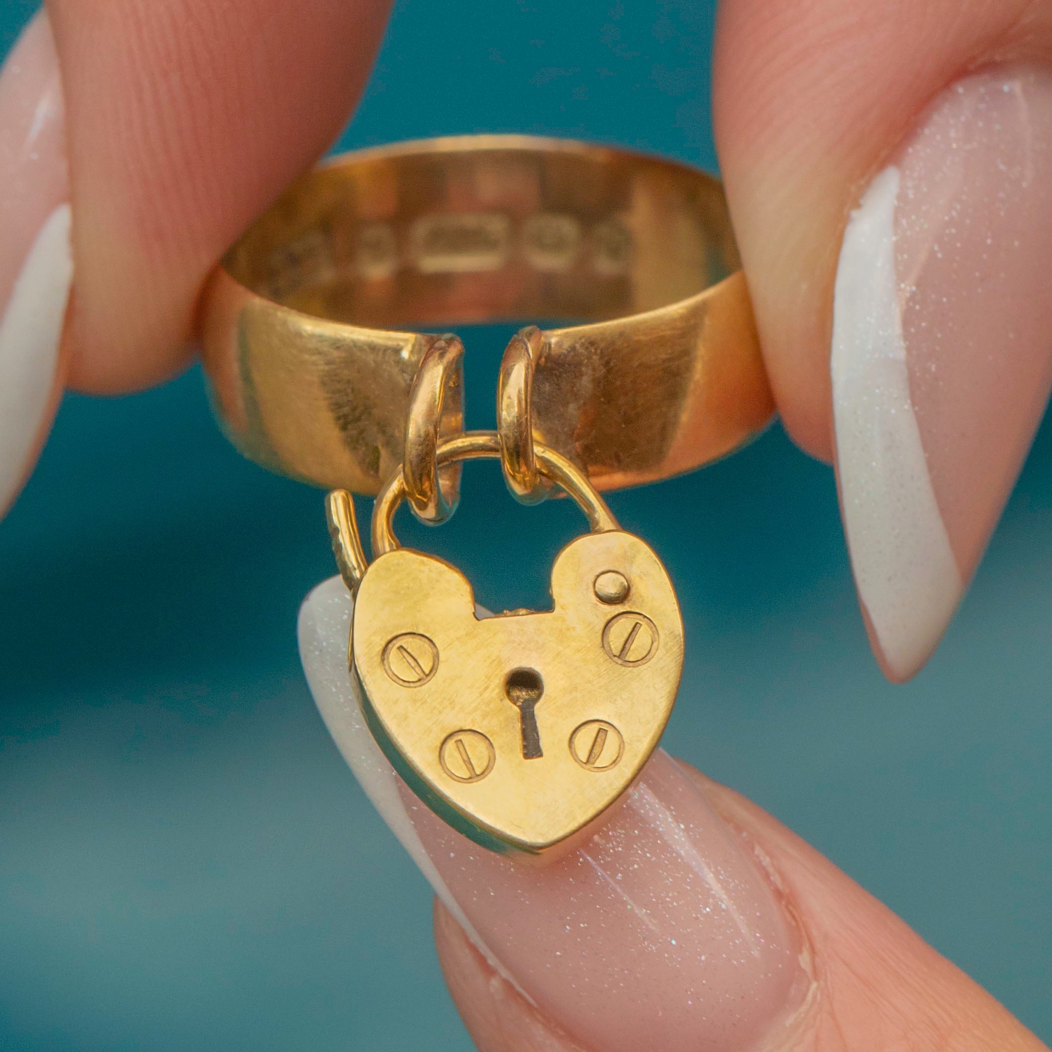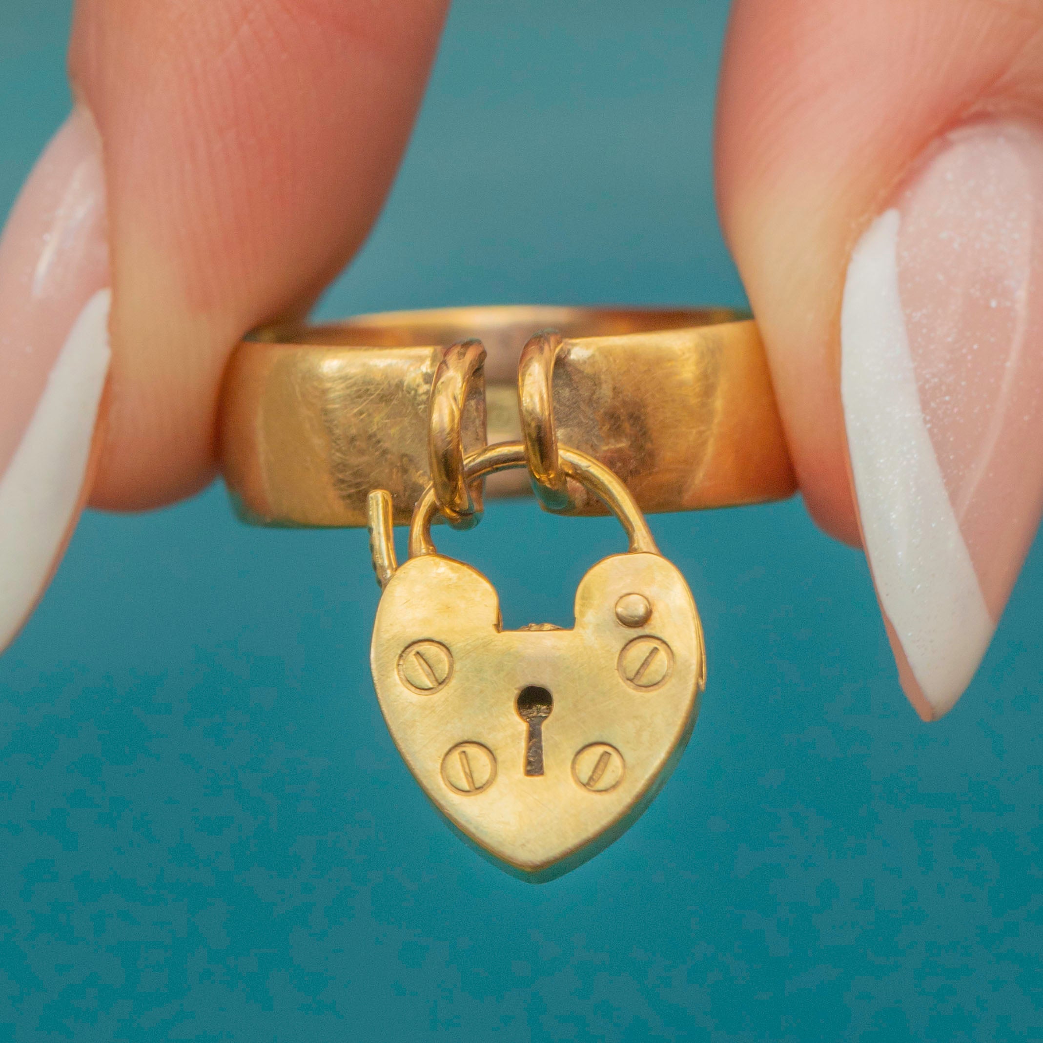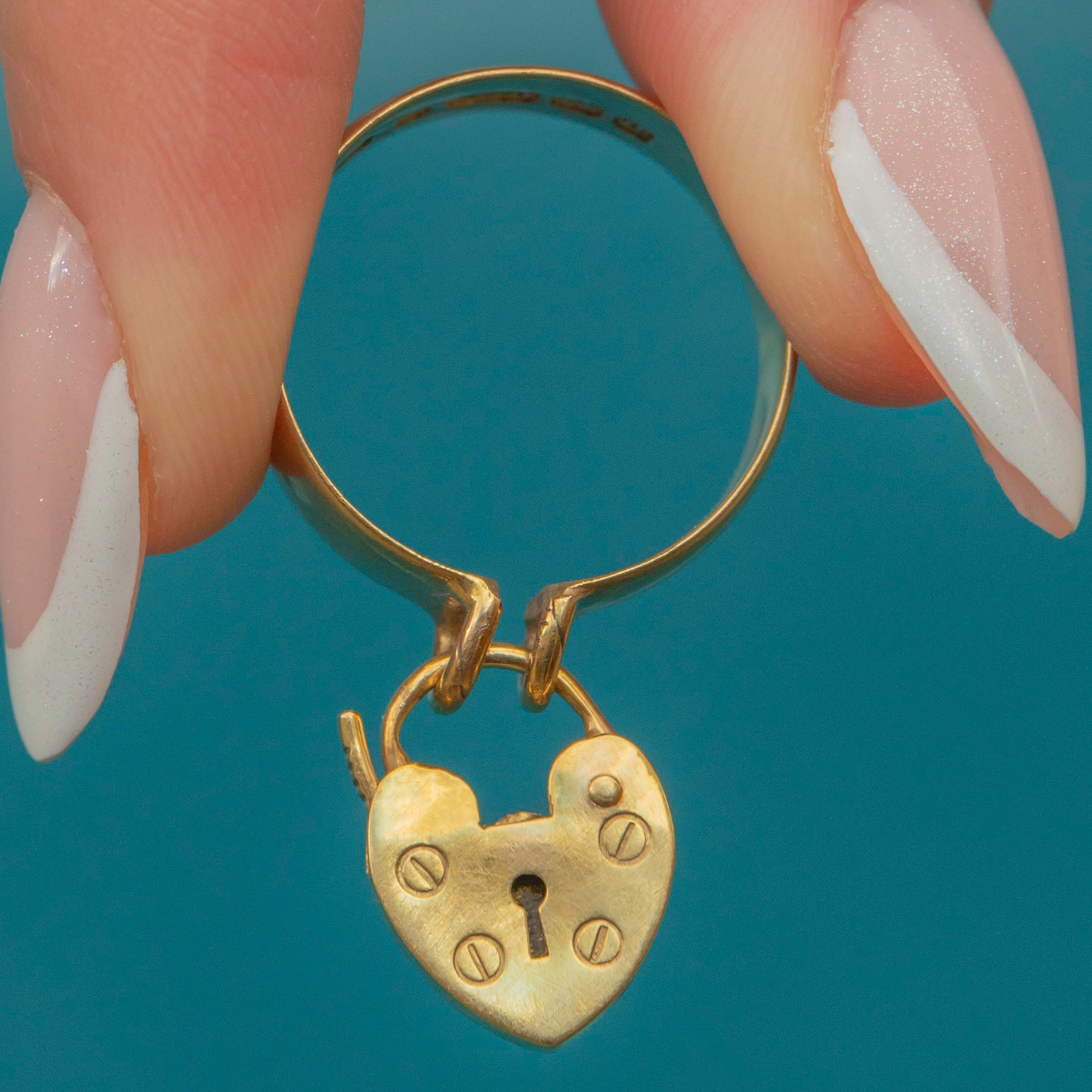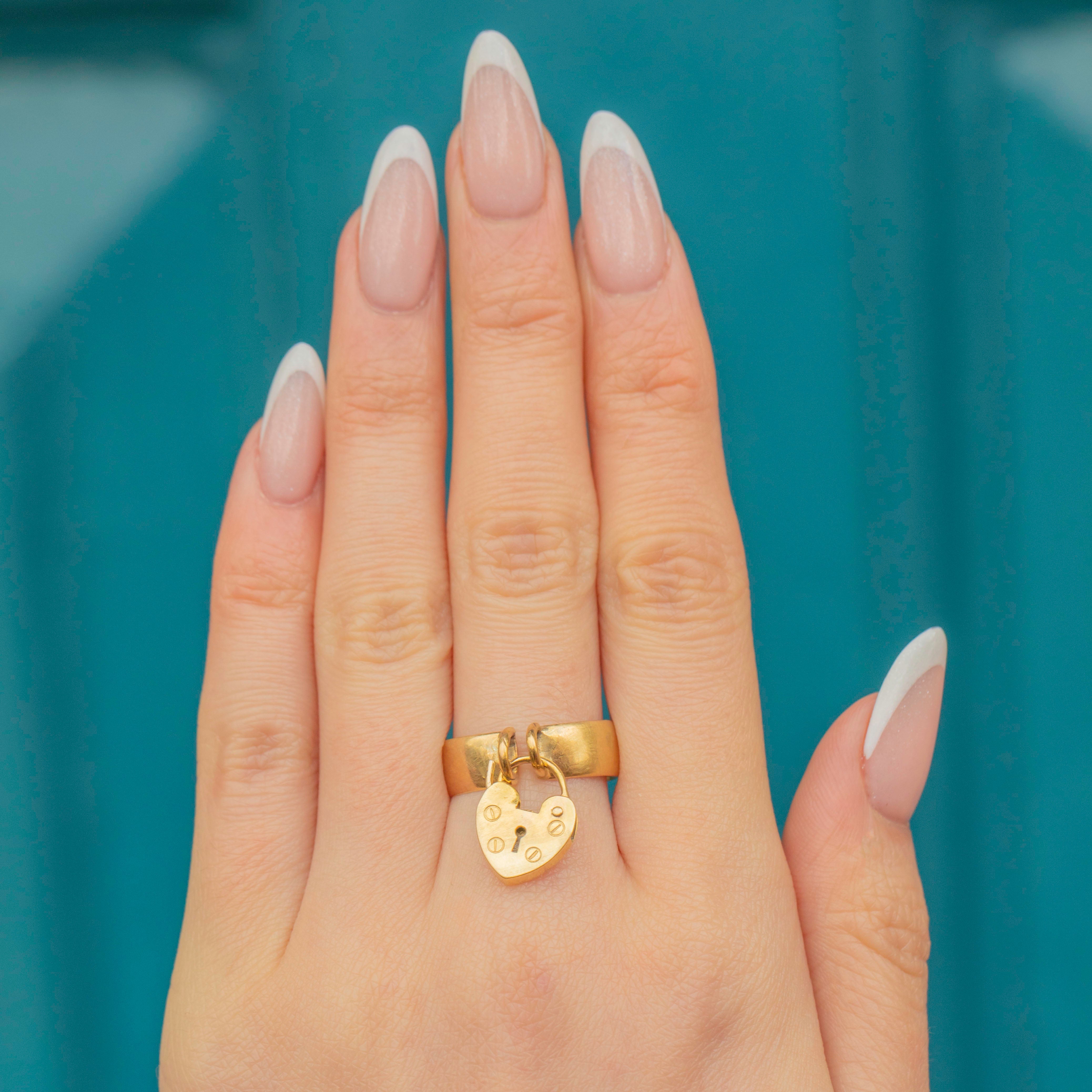 This Edwardian 9ct Gold ring exudes antique charm! The chubby 9ct Gold band gives this antique ring a robust and expensive feel, fastened around your finger with a cute heart padlock.