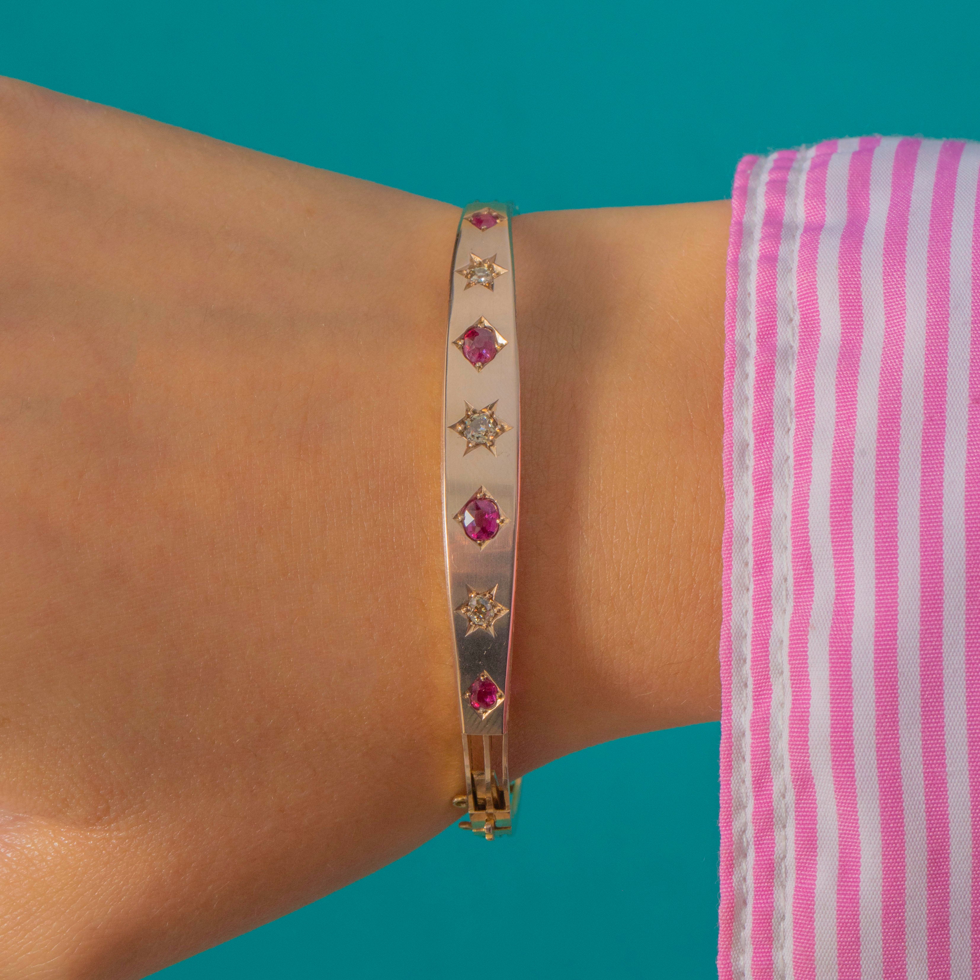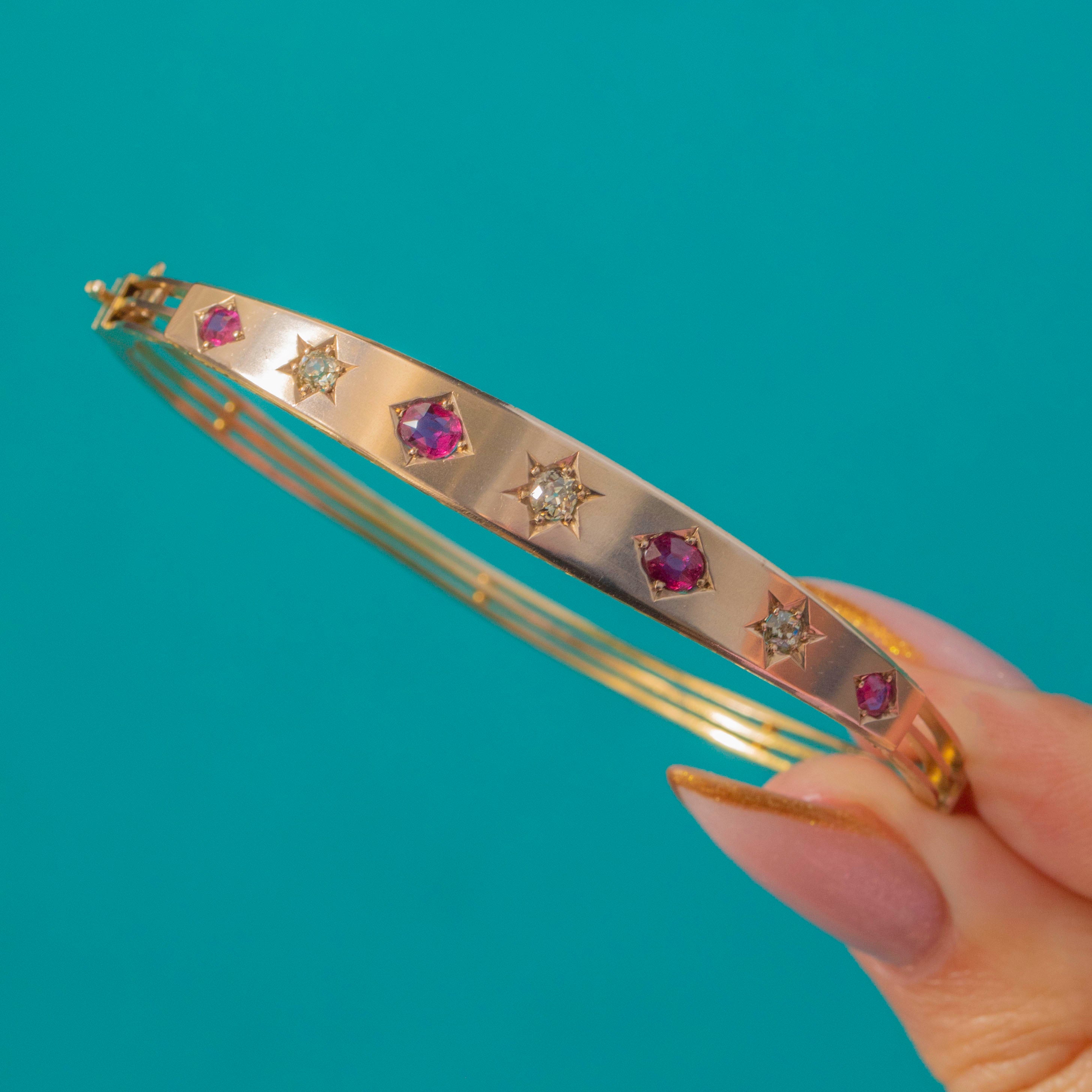 Oh, how we love the crisp star settings!! This elegant celestial Edwardian bangle is a timeless treasure, crafted in warm 9ct Gold and displaying vivid, lively Rubies alternating with impressively sized sparkling antique Diamonds!