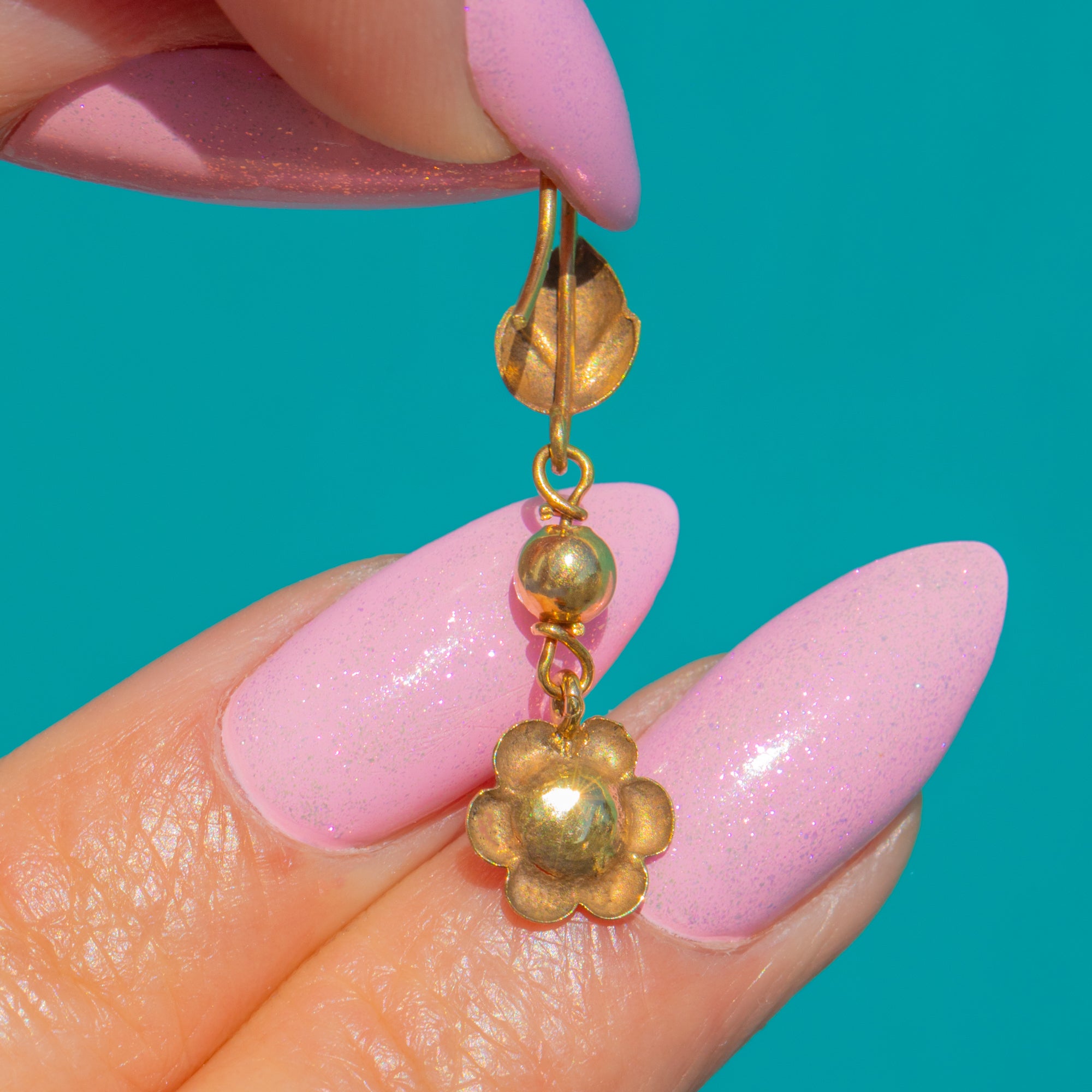 These antique Edwardian drop earrings are a charmingly delicate pair, crafted in rich 9ct Gold and set with vivid blue Sapphires. Each earring is formed with a graceful hooked top, a polished Gold bead, and a sweet flower-shaped drop centred with a sparkling Sapphire.