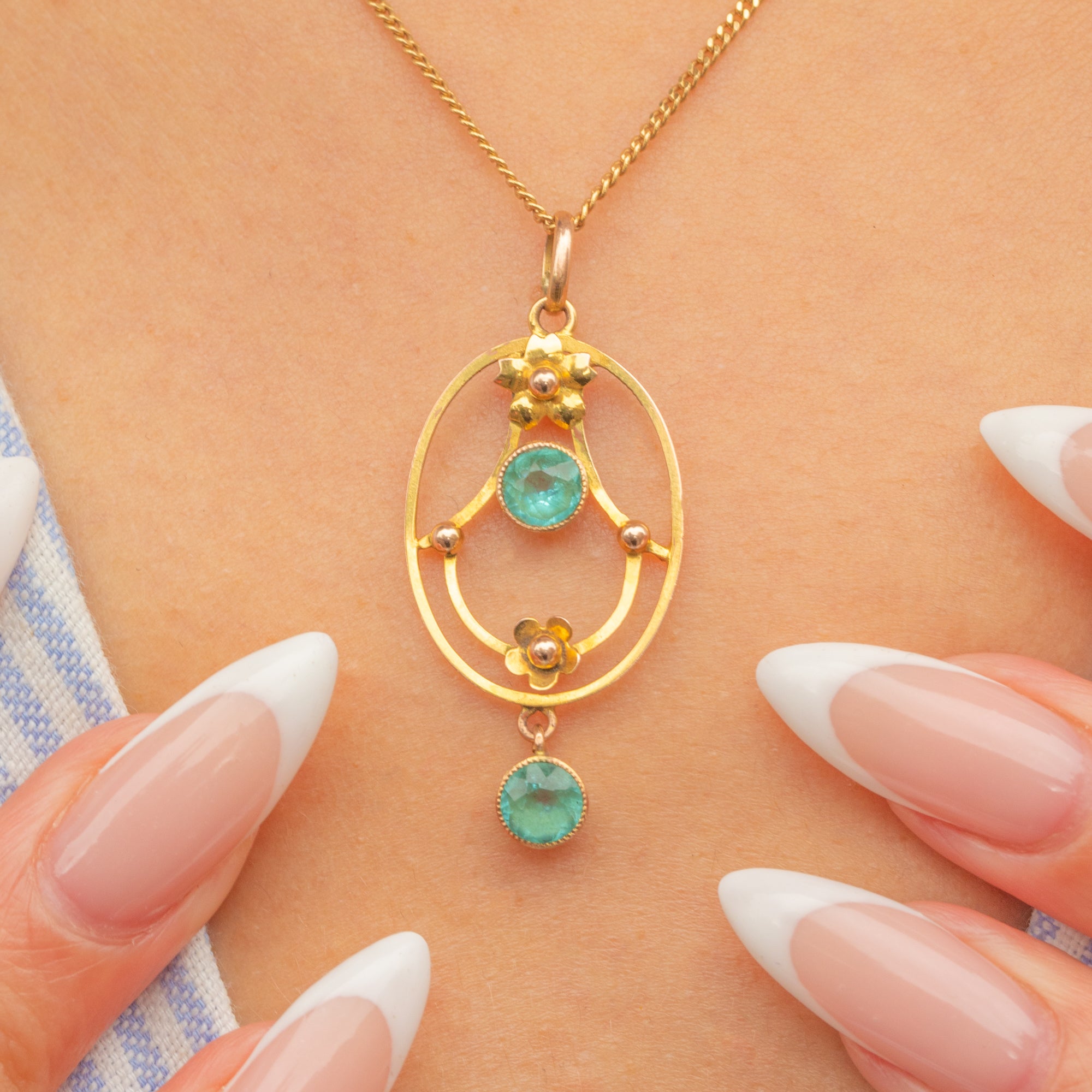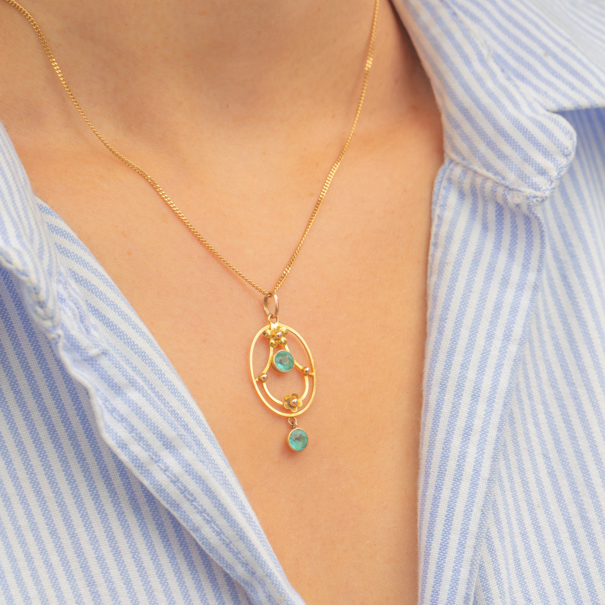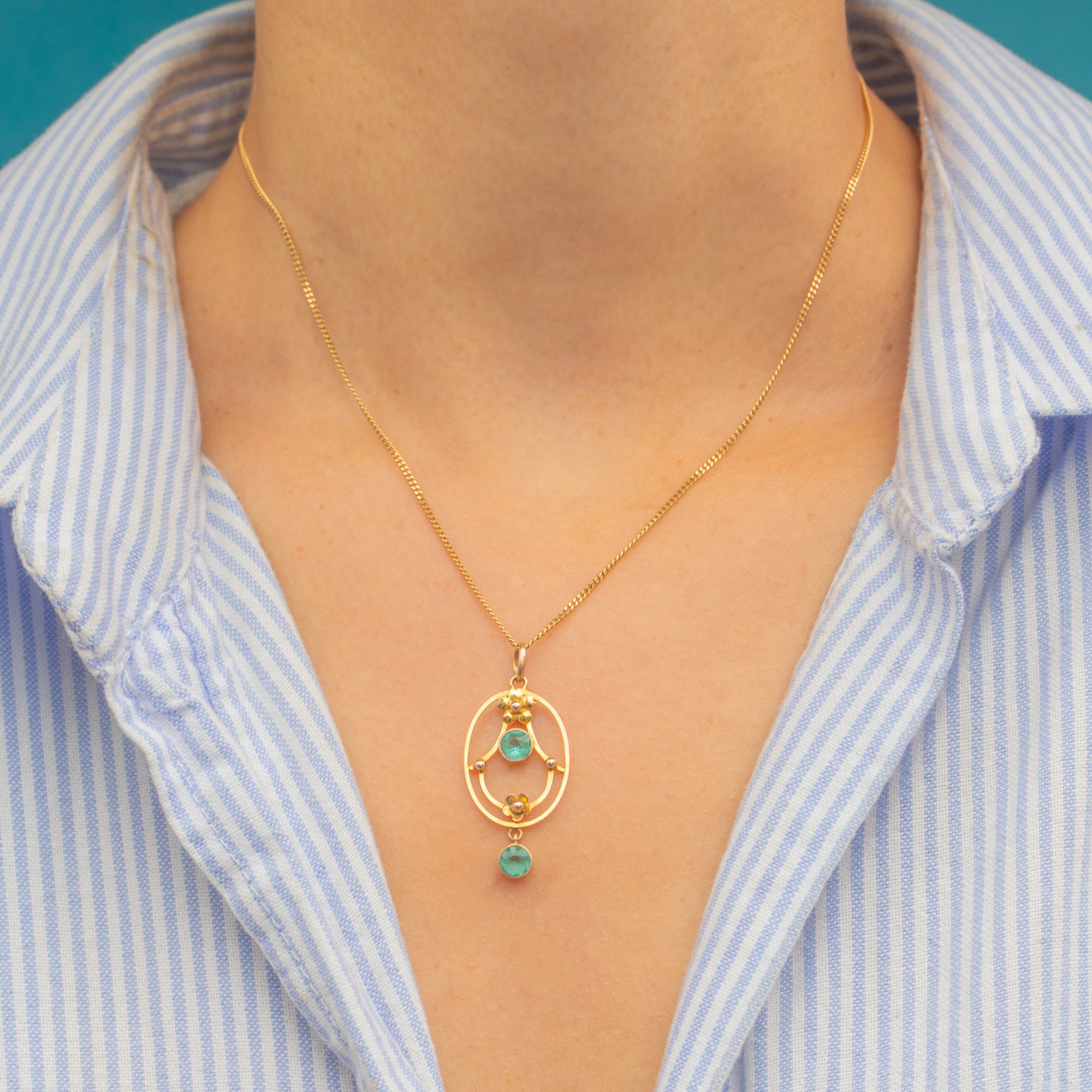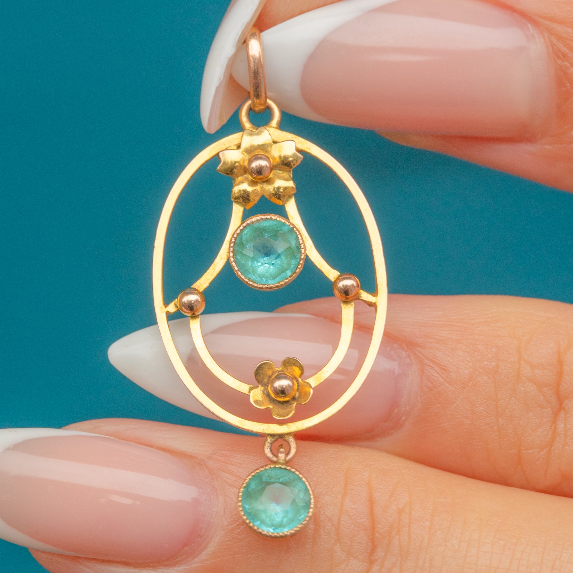 An elegant Edwardian pendant crafted in 9ct Gold, featuring two round teal-blue Paste gemstones set within a delicate openwork frame.