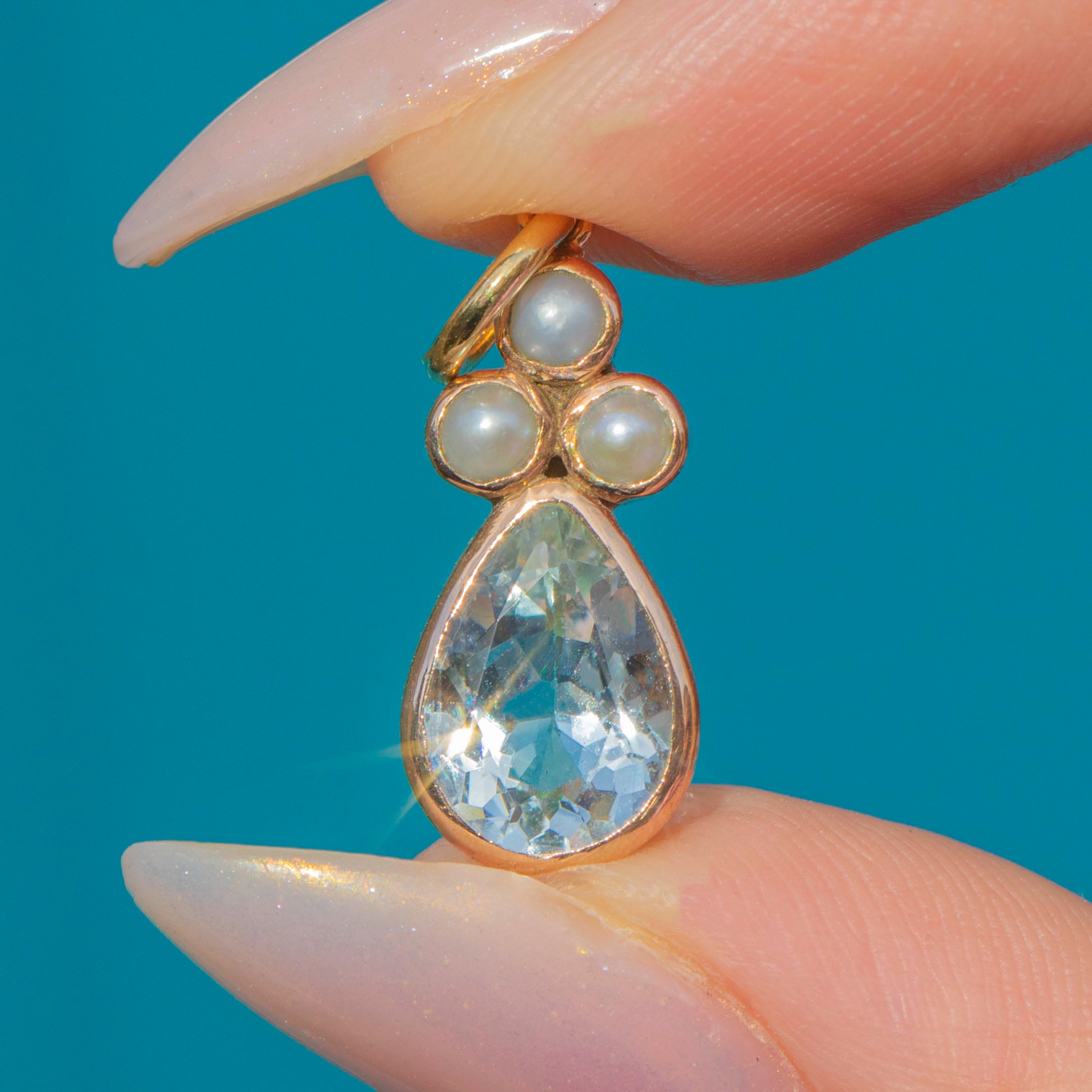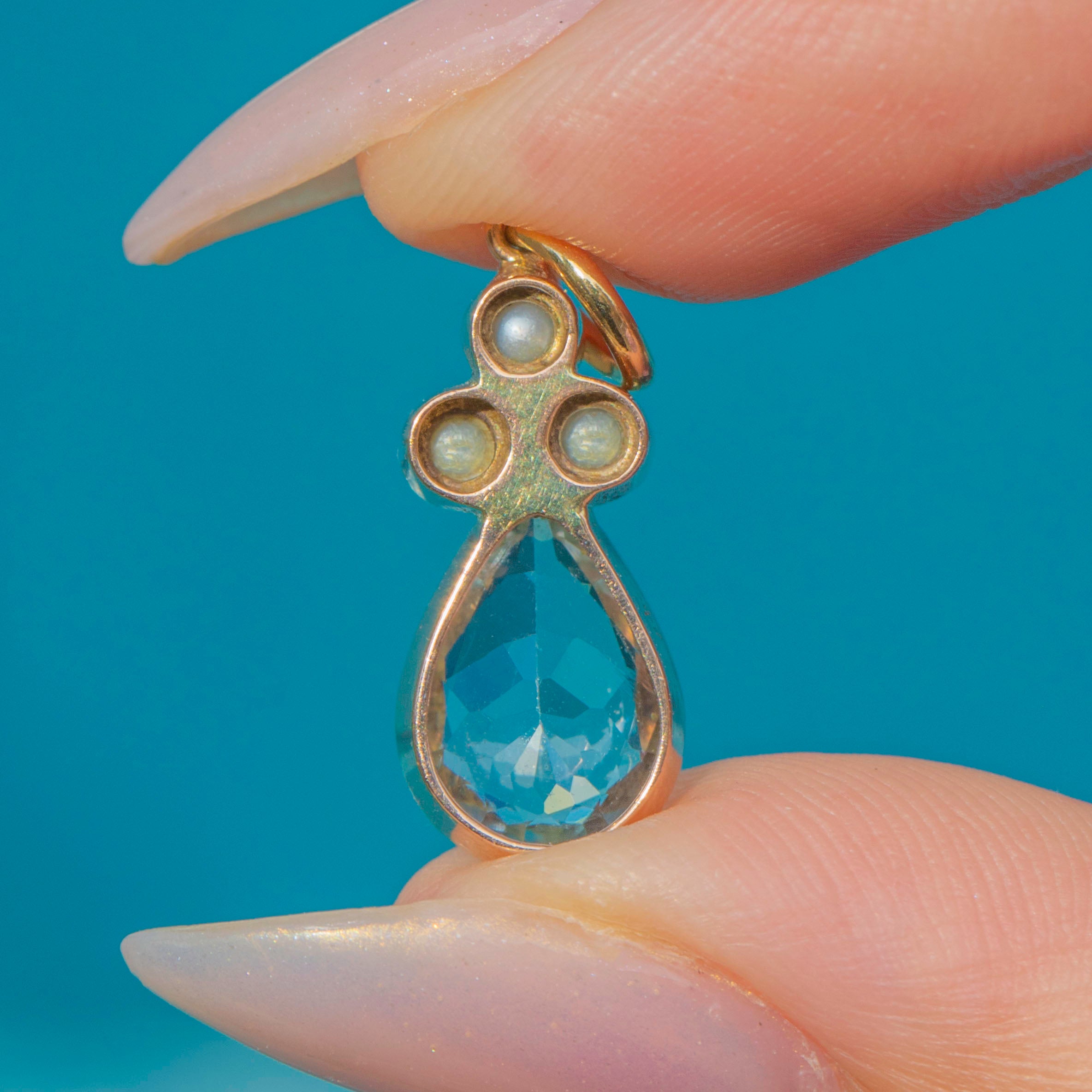 Edwardian 9ct Rosy Gold Aquamarine Pearl Pear Drop Charm
