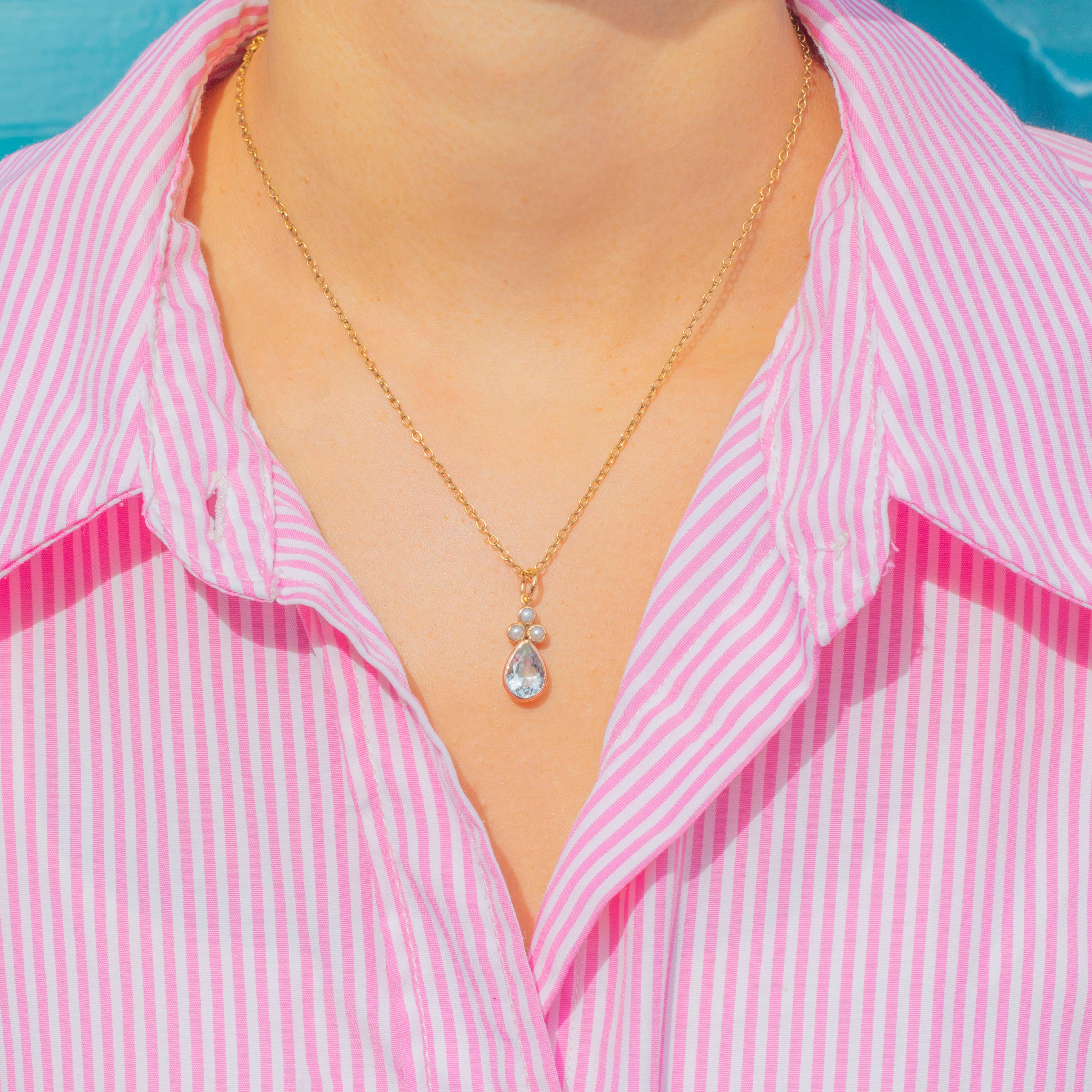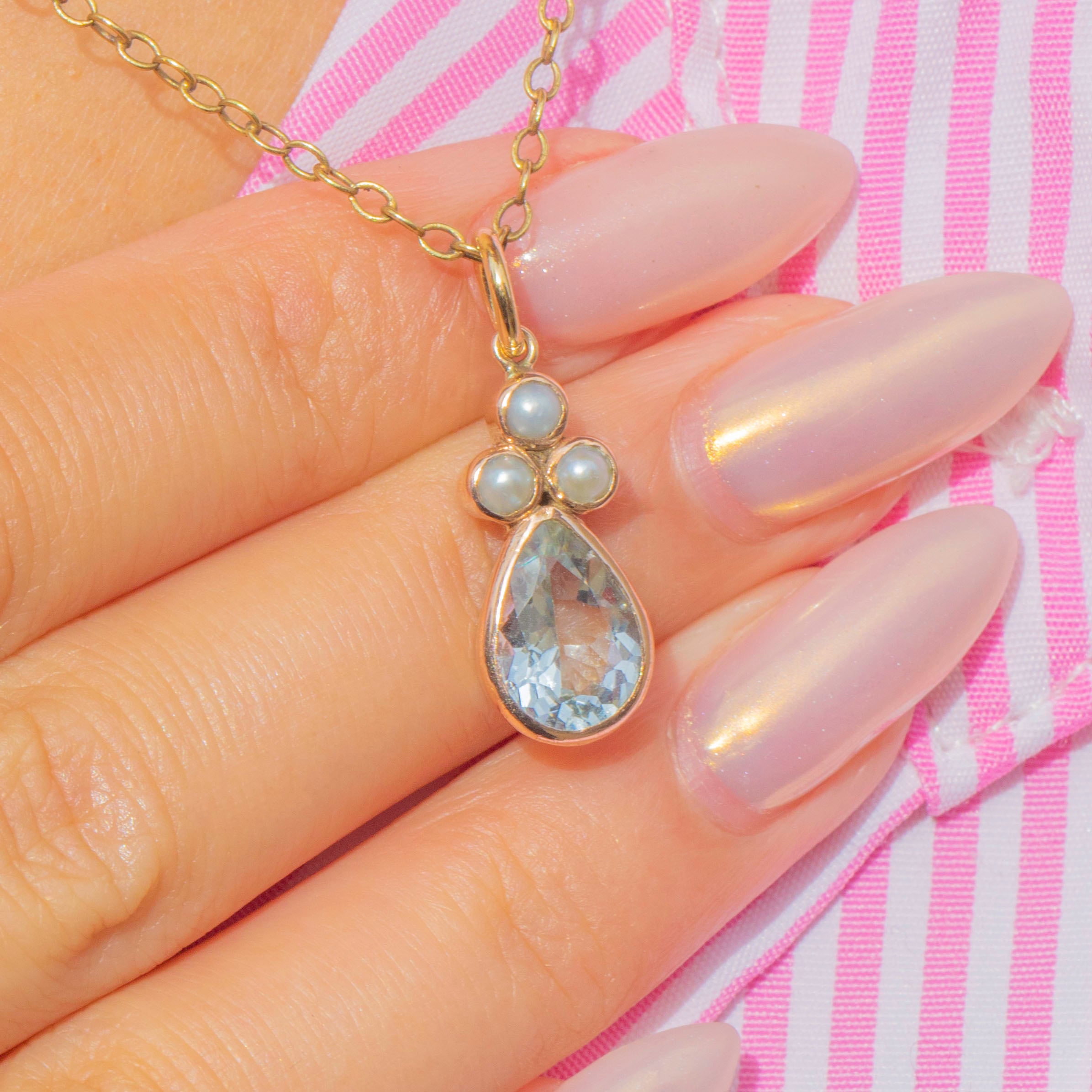 The mellow rosy-hued Gold contrasts beautifully with the soft blue of the Aquamarine and the creamy shimmer of the Pearls. Each gem is securely set in smooth bezels, showcasing refined Edwardian craftsmanship. This charming drop is perfect as a standalone pendant or for adding to a vintage charm collection.