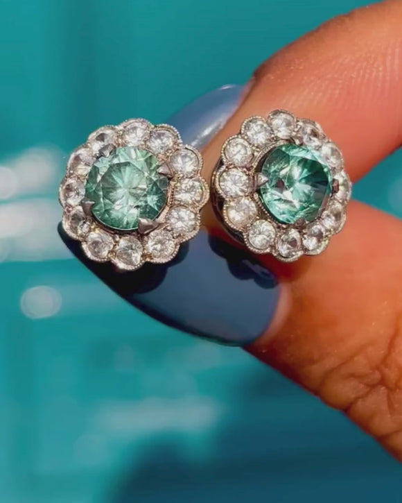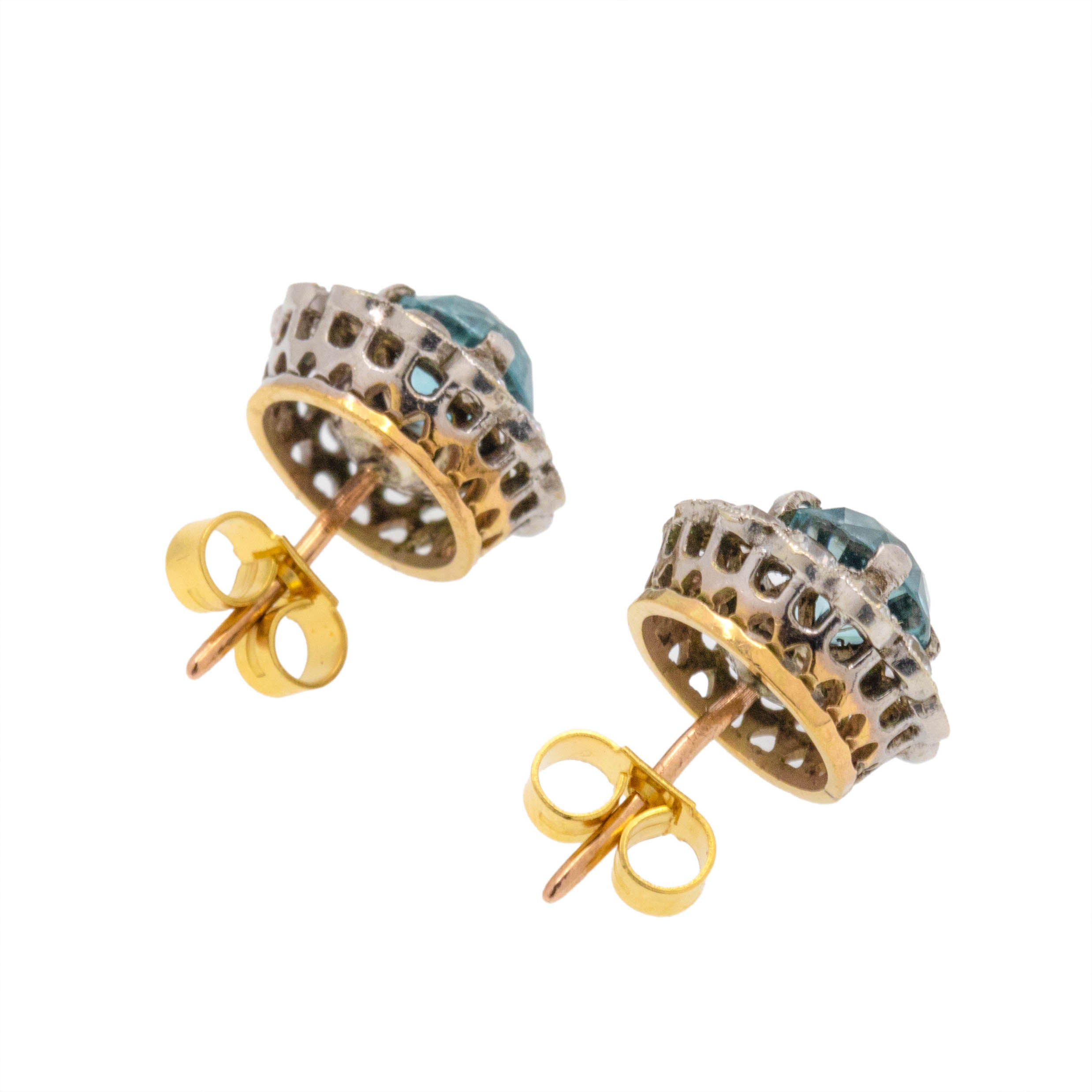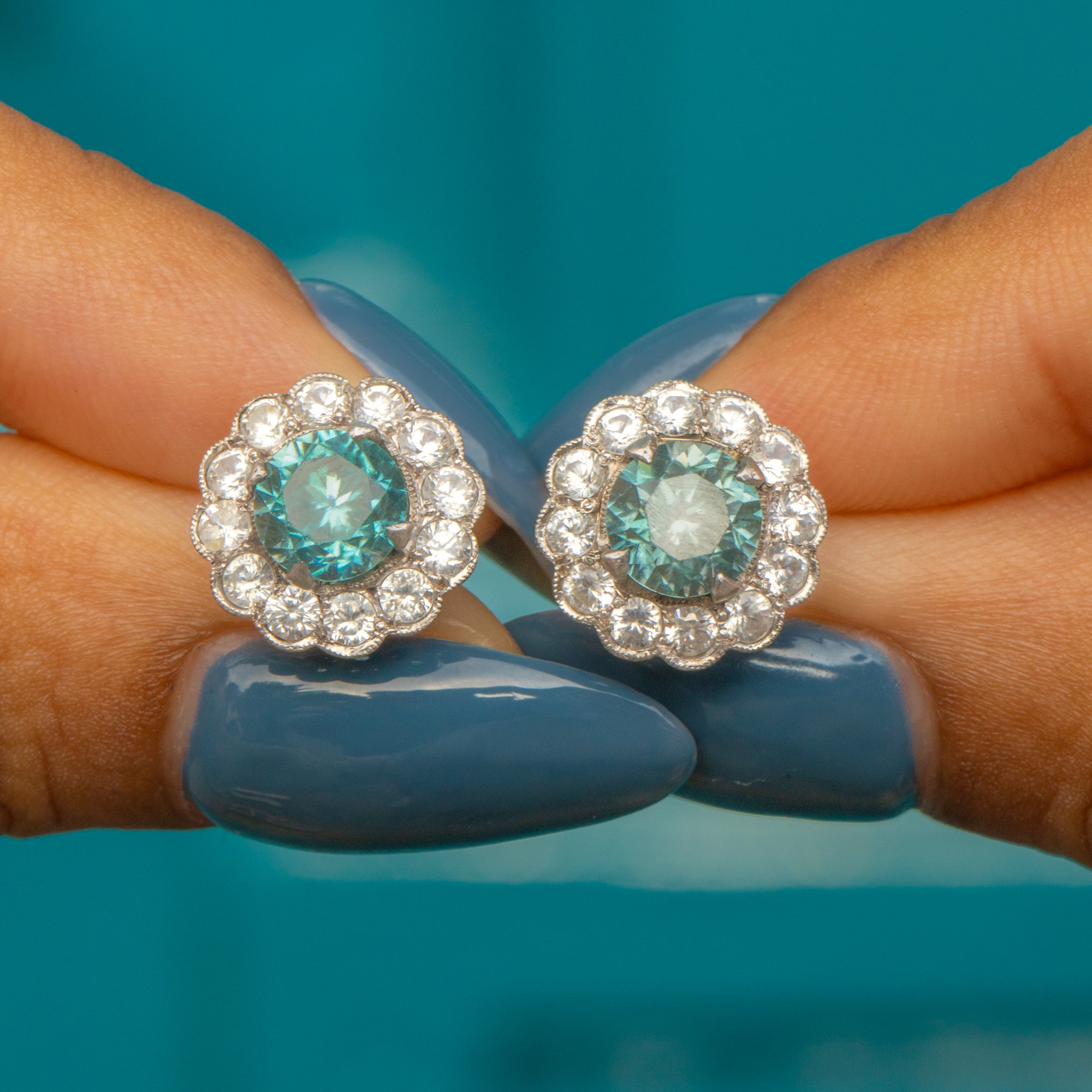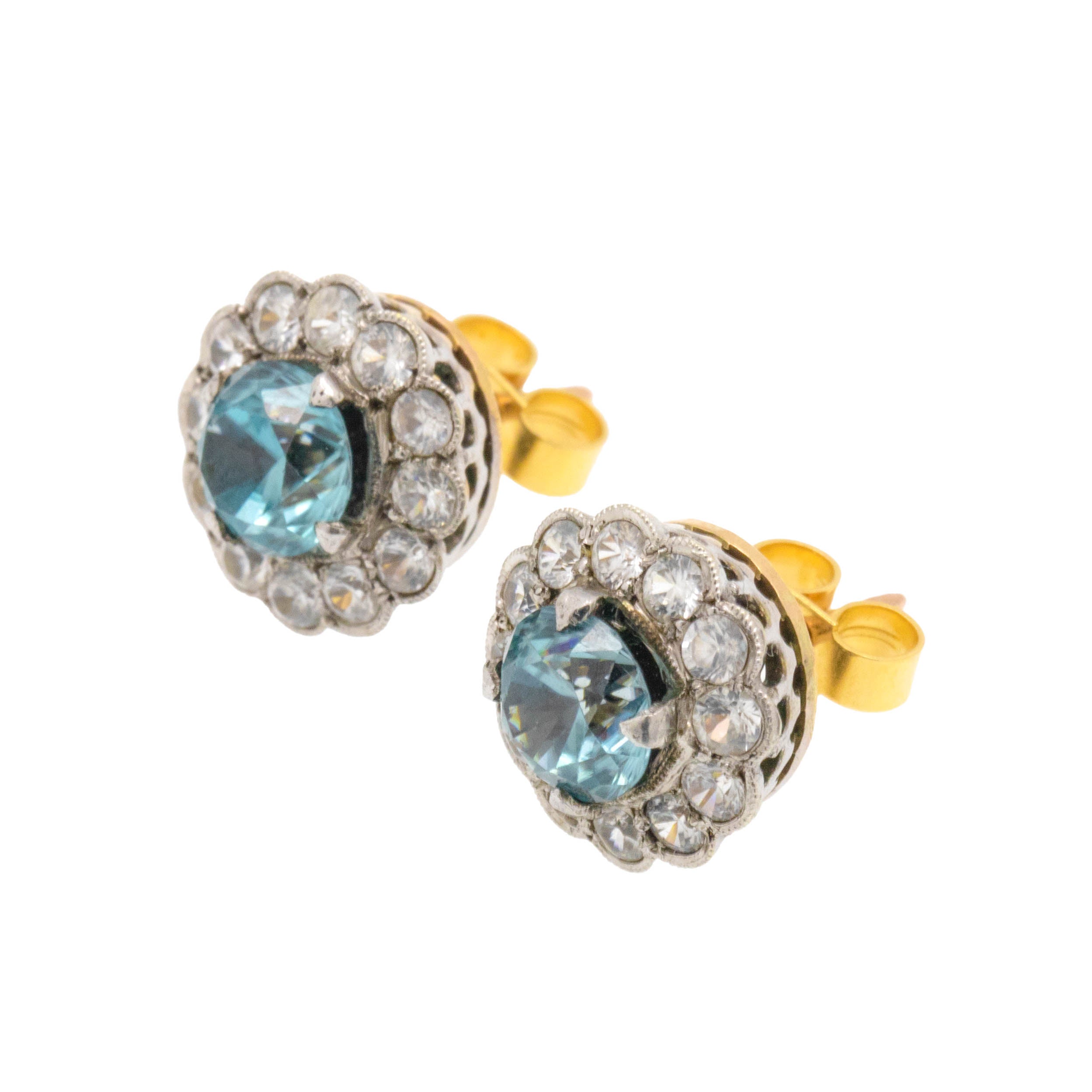 These Edwardian 9ct Gold & Platinum blue Zircon cluster earrings are the perfect pair for glamorous occasions! Each cluster has a glorious display of scintillating white Zircon haloing a bright icy blue Zircon, with a combined weight of 2.42ct, that will catch the attention of any onlooker.