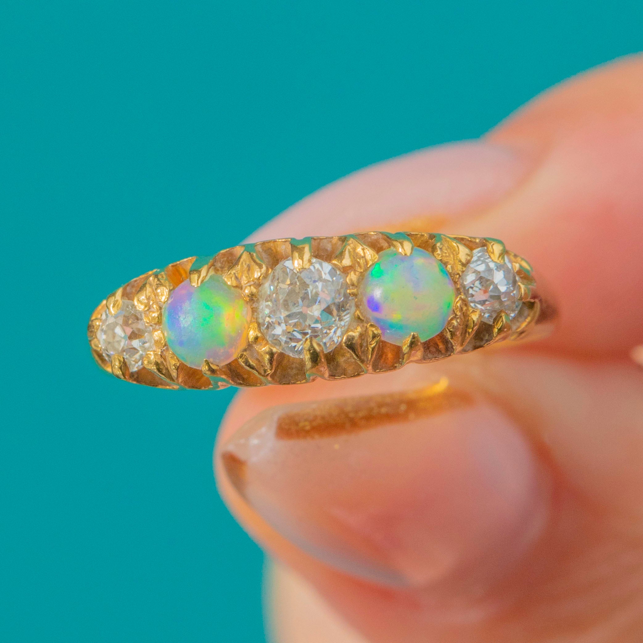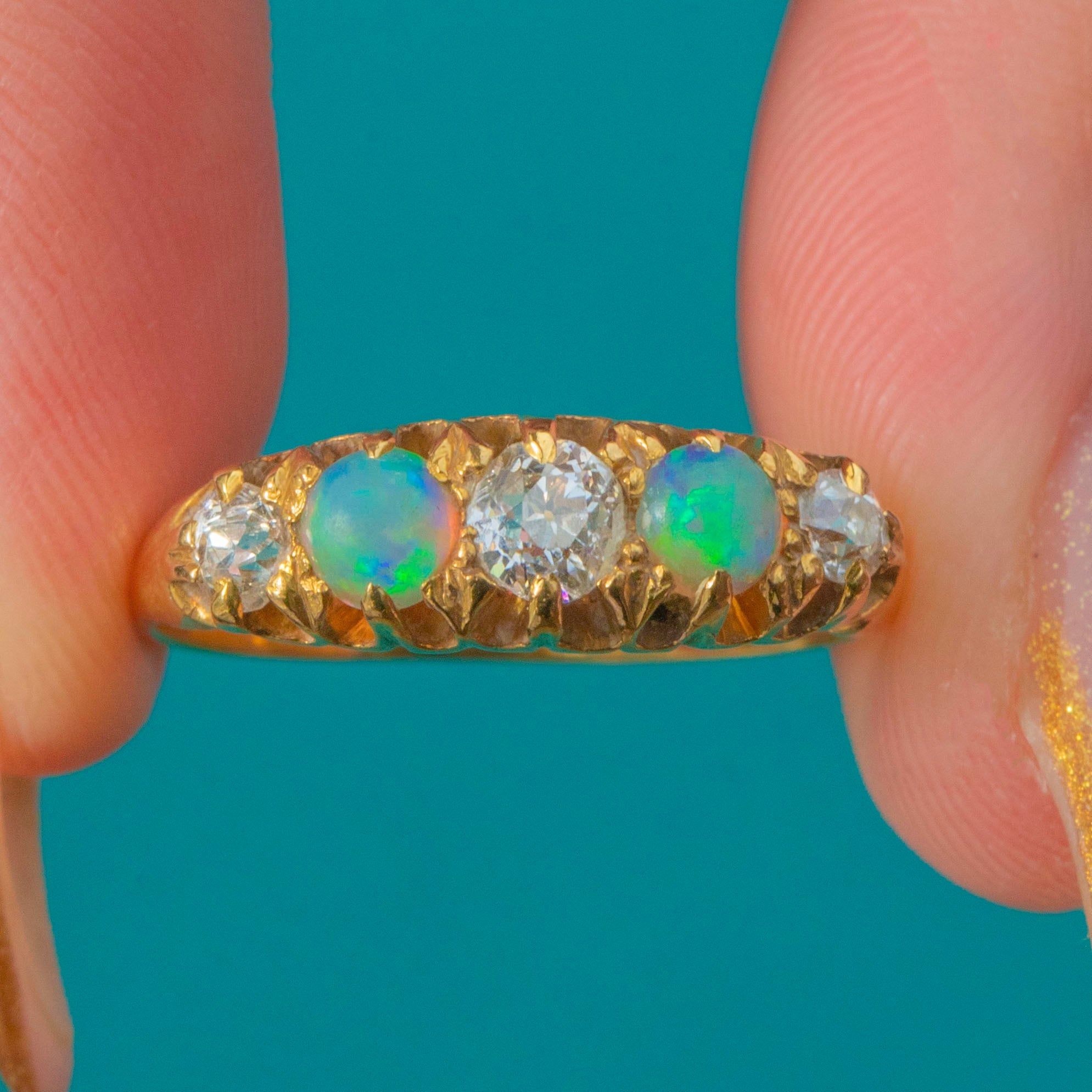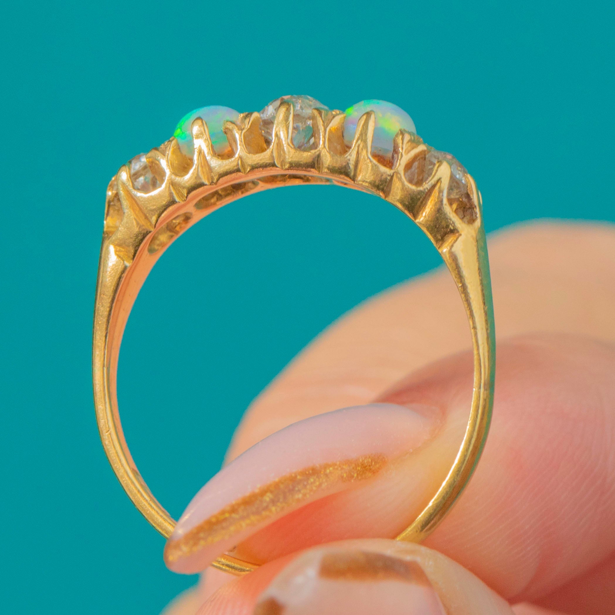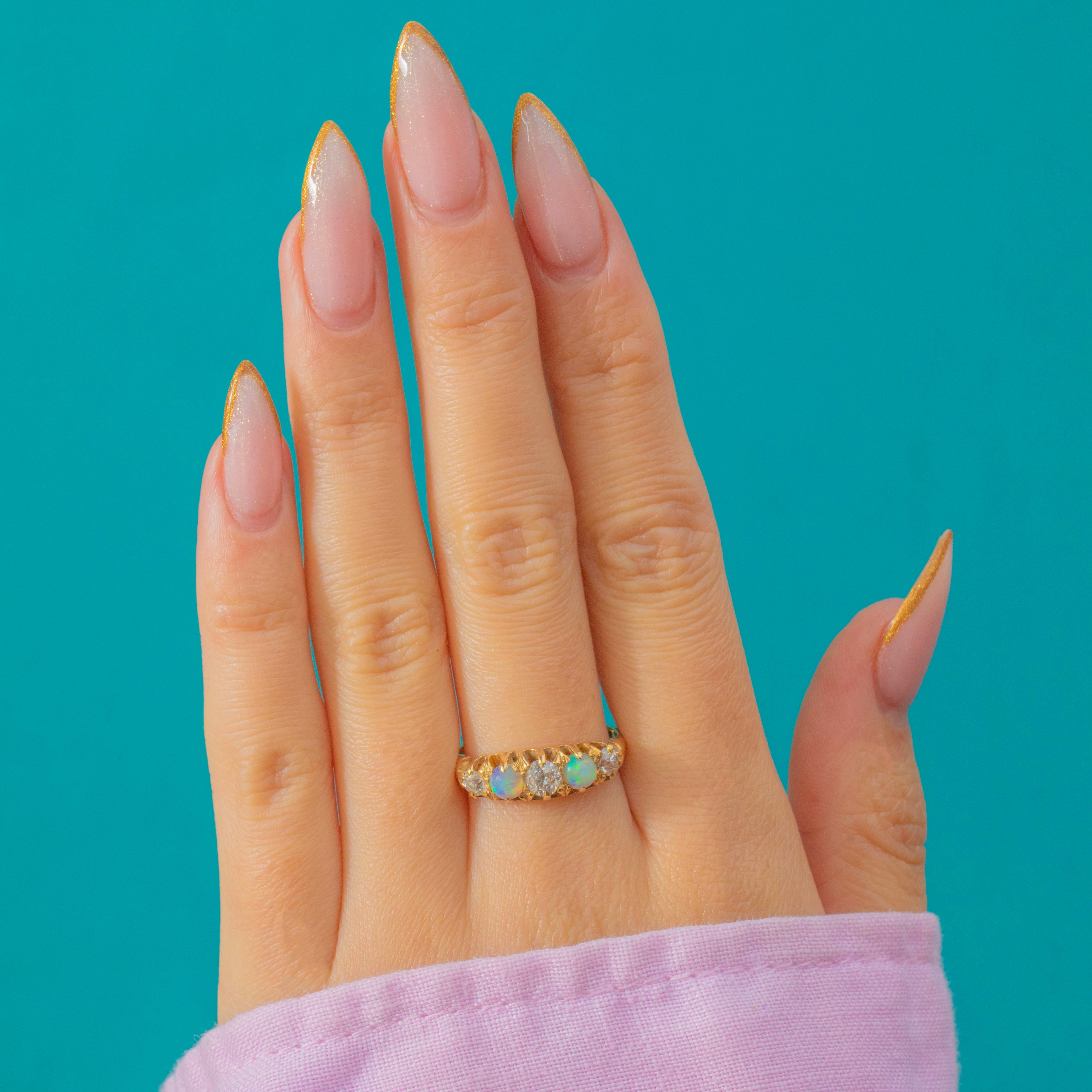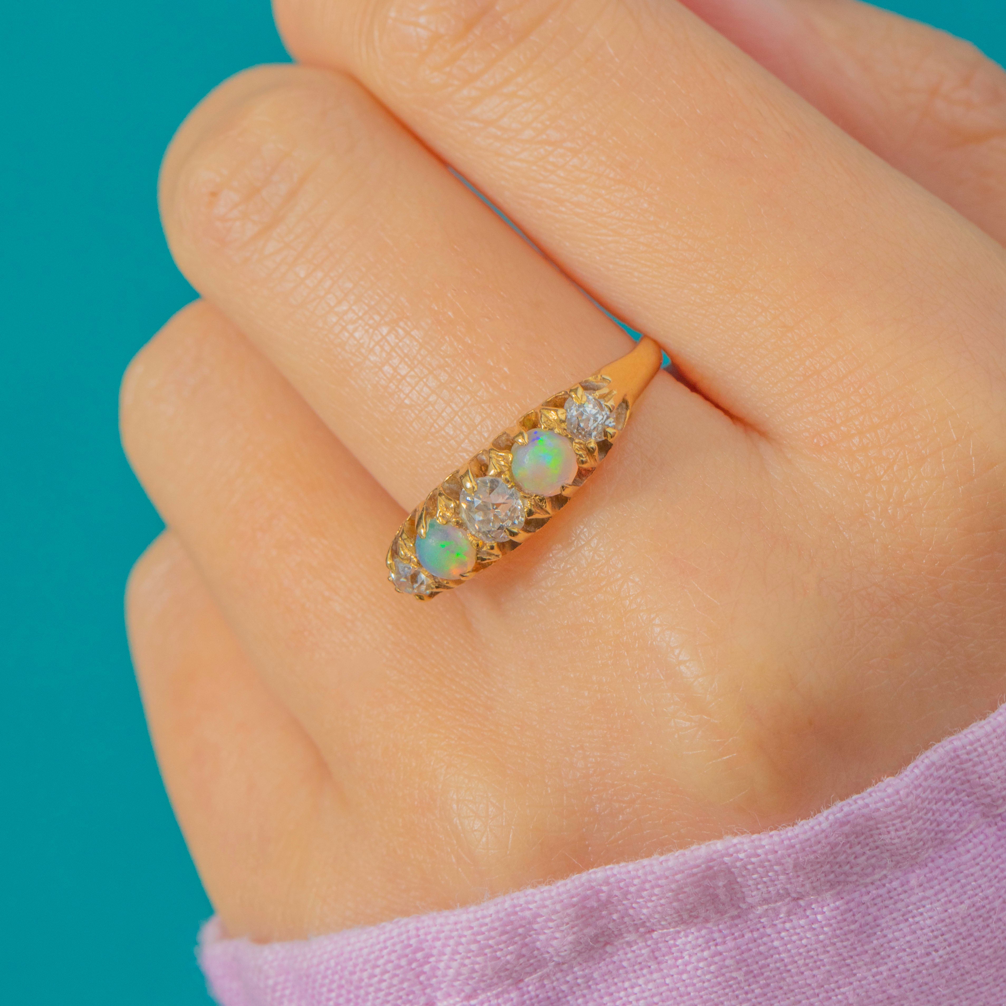 This beautiful Edwardian five-stone ring is set with a glowing trio of Opals accented by 0.20ct of two bright Diamonds, all nestled within a classic carved boat setting. The Opals display flashes of green, yellow and soft pink, creating a gorgeous contrast against the antique 18ct Gold.