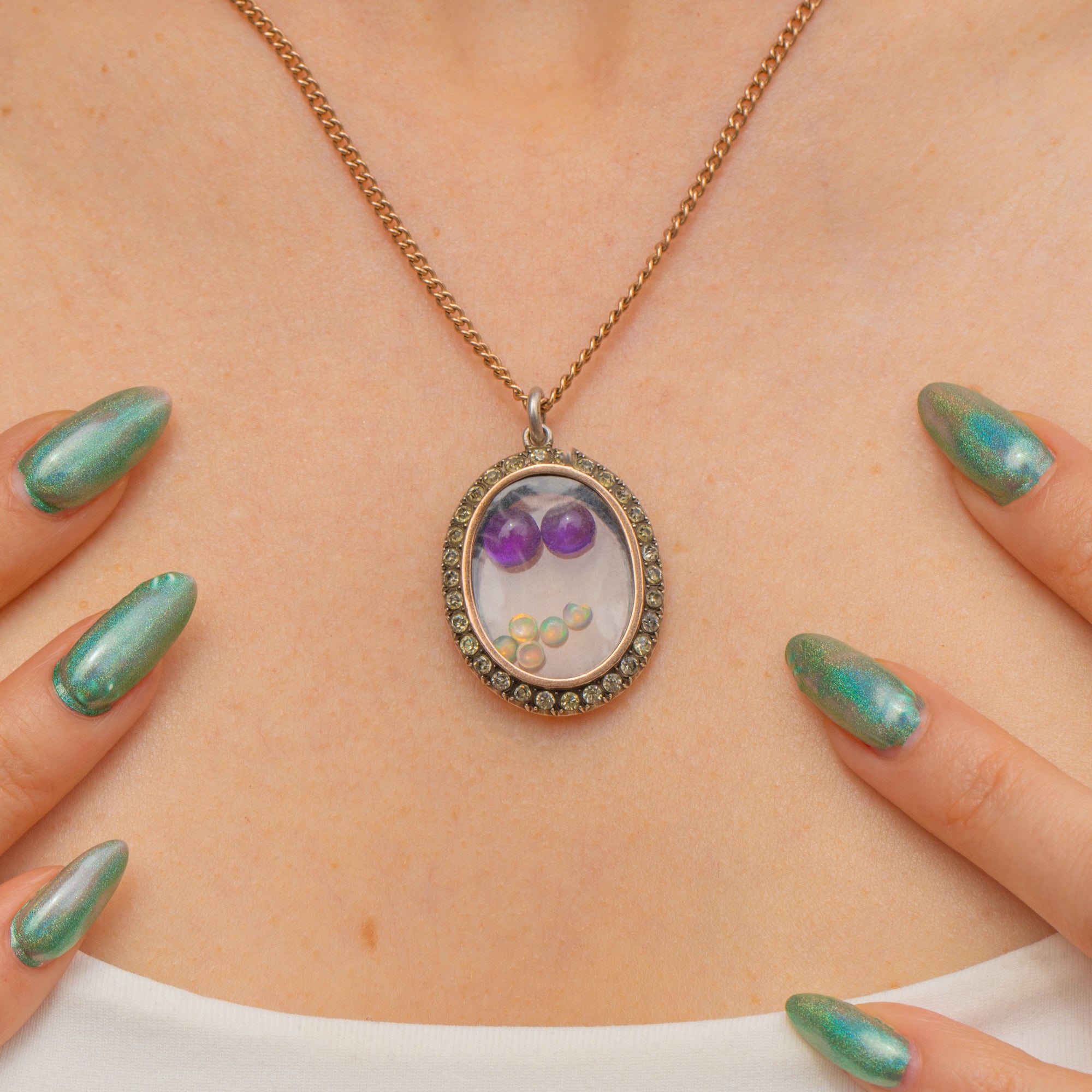 Feast your eyes on this exquisite Edwardian Paste oval shaker locket! Crafted from Sterling Silver inlaid with fine quality Paste gems and home to five otherworldly Opals and two juicy Amethysts, this timeless Edwardian beauty is breathtaking.