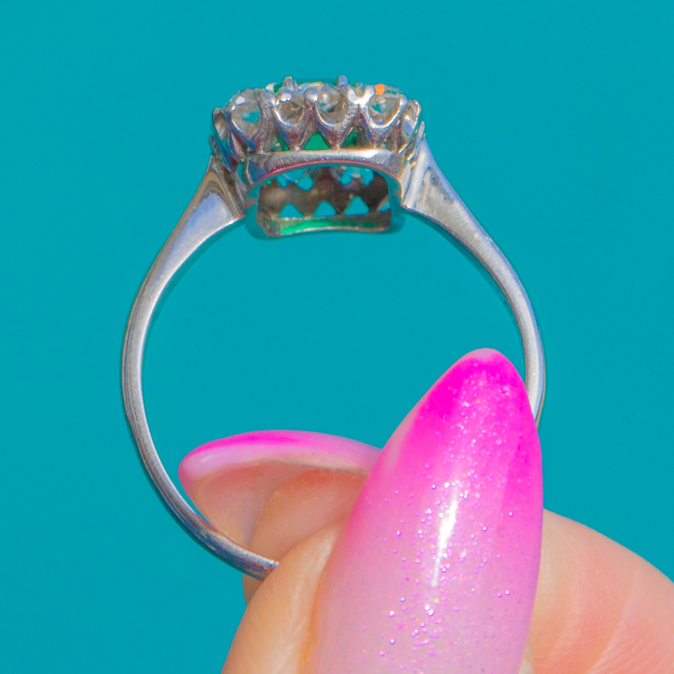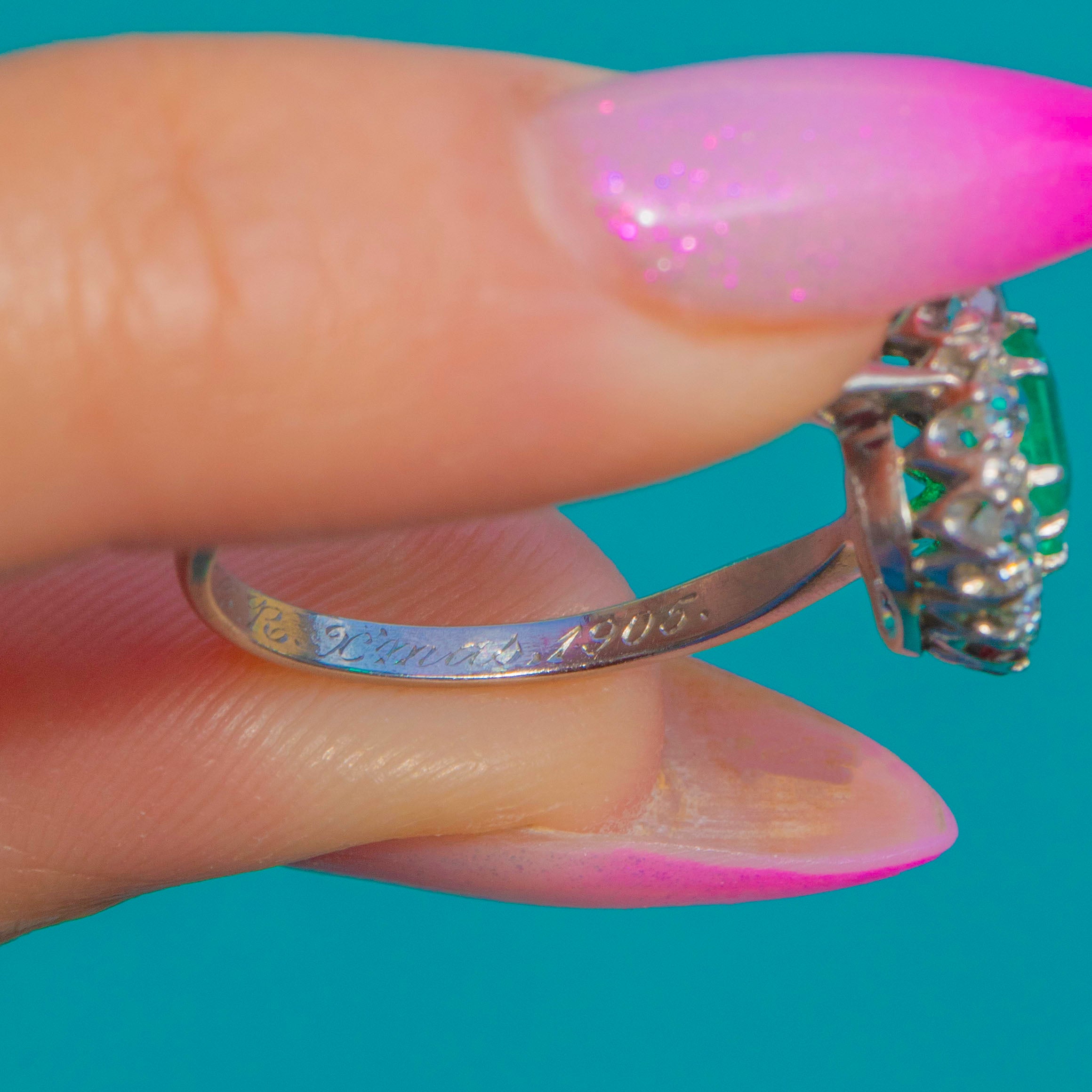 Engraved “MGR Xmas 1905” inside the band, this ring carries all the graceful poise of the period. The slender shank draws the eye to the structured cluster, with the rich green Emerald at its heart and a scalloped, elevated basket adding a delicate touch of ornament to the silhouette.