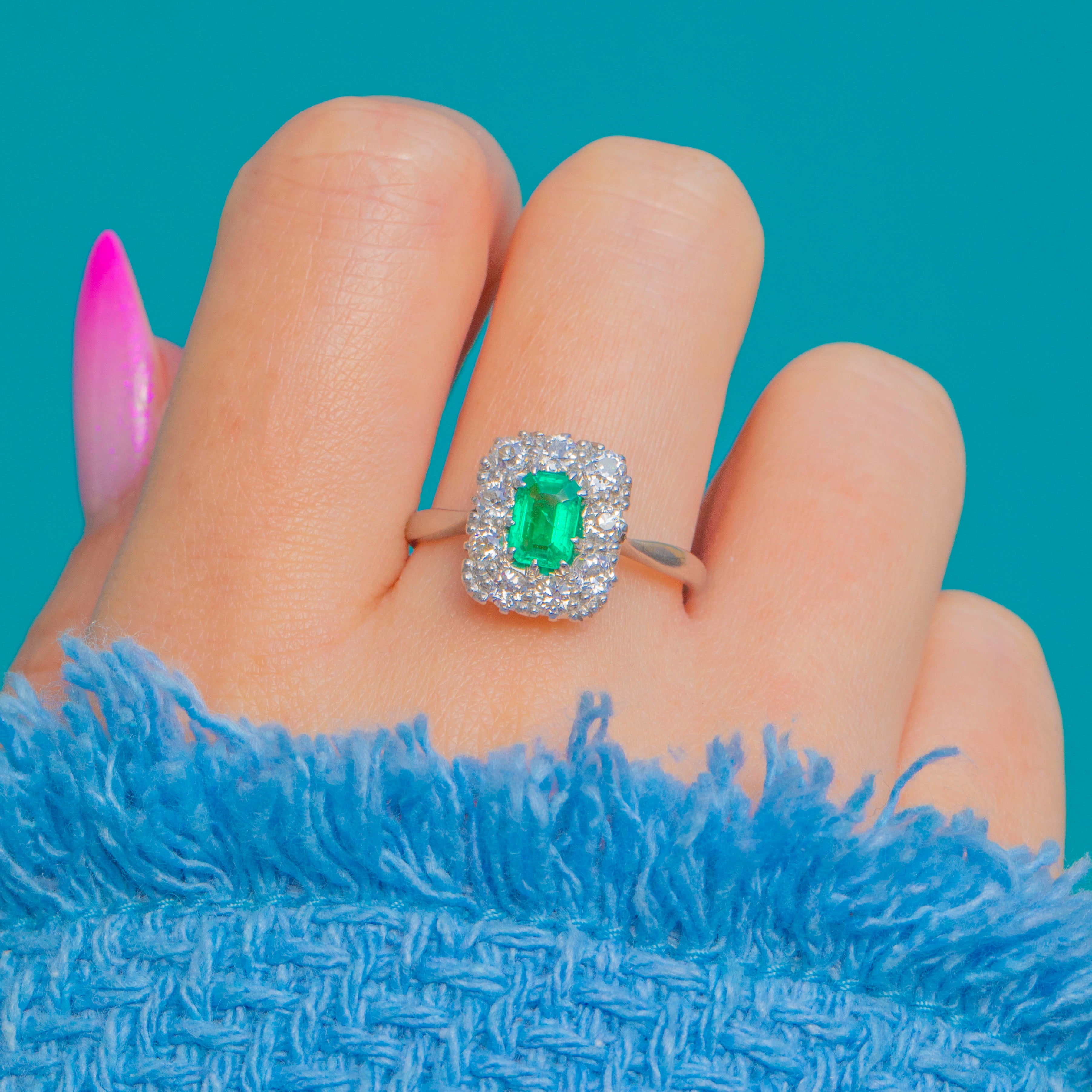 A luminous Edwardian Platinum cluster ring centred by a vivid rectangular step-cut Emerald, framed by a sparkling halo of bright, white Diamonds. The geometric halo and beautifully pierced openwork gallery bring a refined elegance to the piece, while the cool sheen of Platinum accentuates the crisp lines and scintillation of the Diamonds (approx. 0.70ct total).