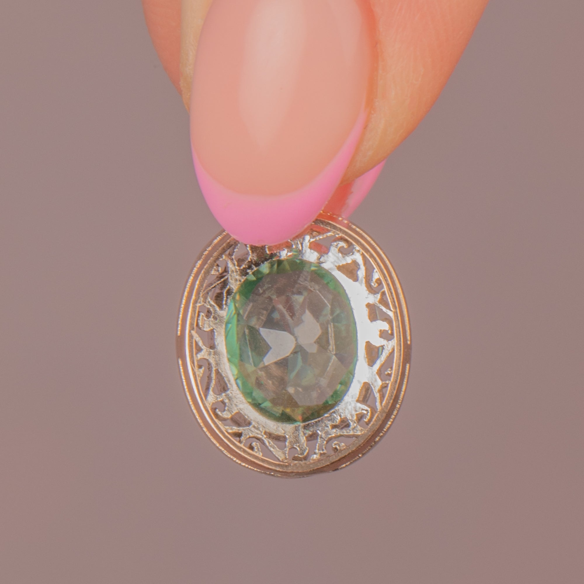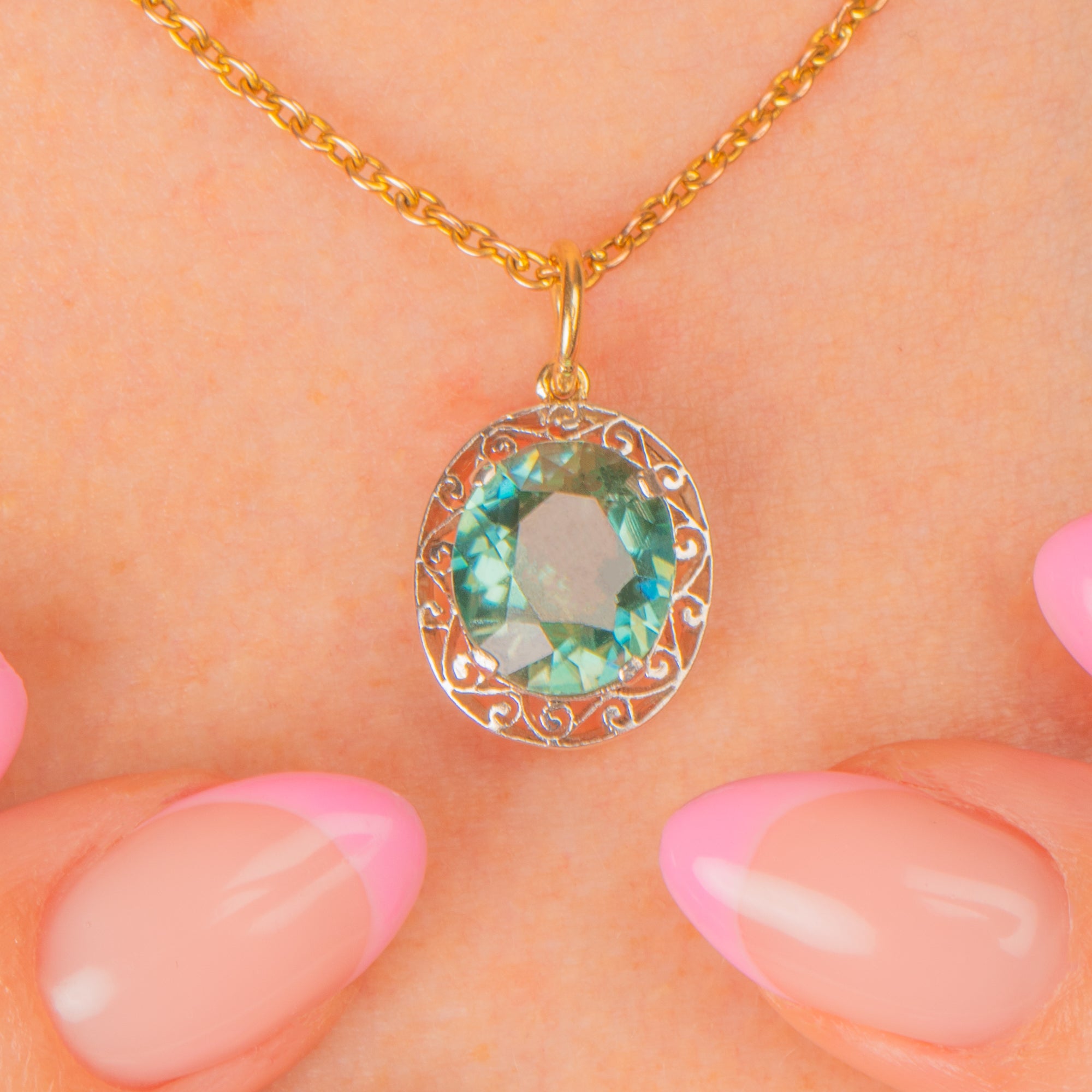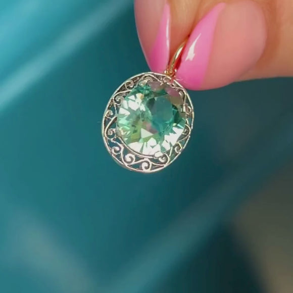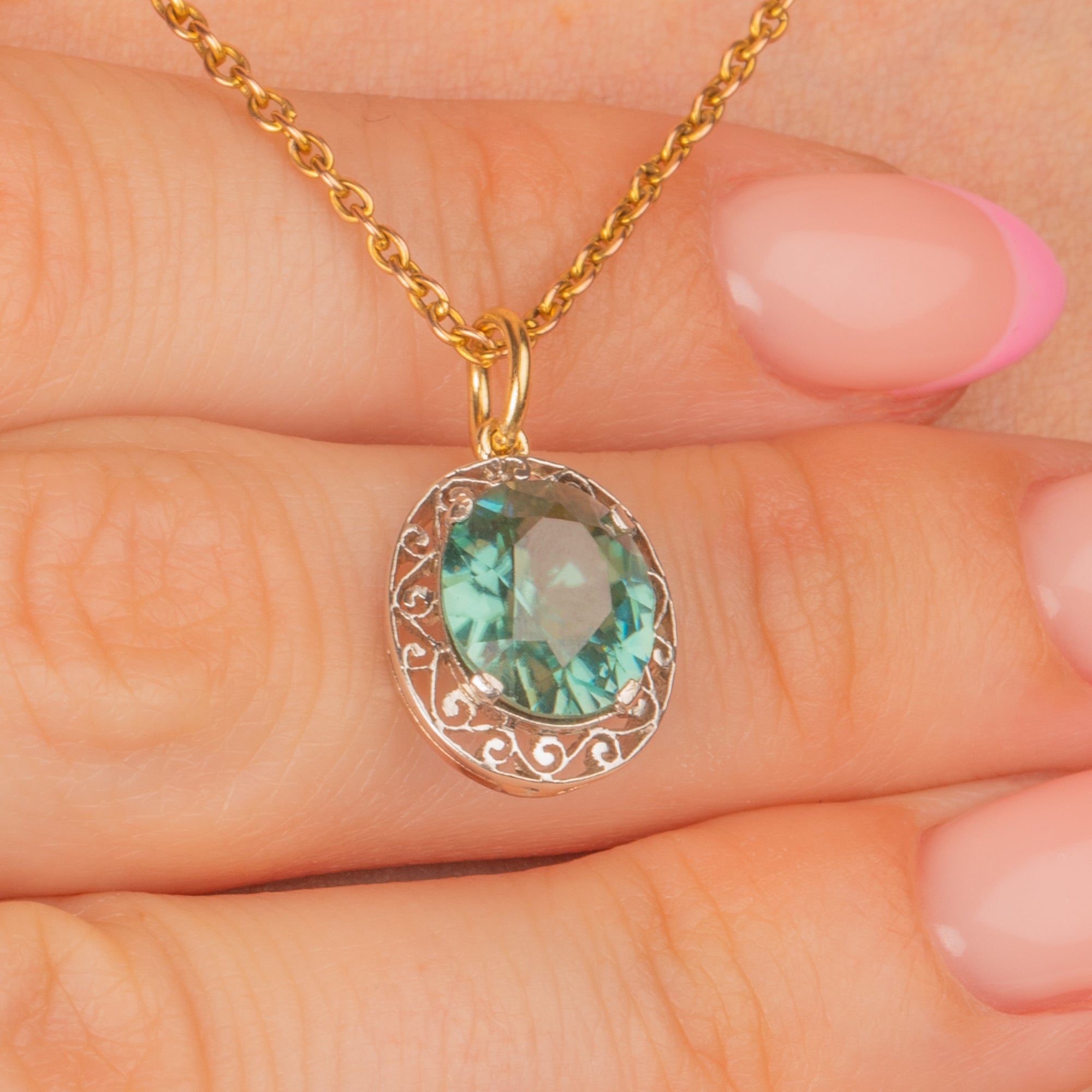 The blue Zircon is the most ravishing cyan blue colour, and with her entire circumference surrounded by Silver ornate scrollwork, this Edwardian pendant is a must-have. Imagine her with a skinny Gold chain and a buttoned-down white shirt!