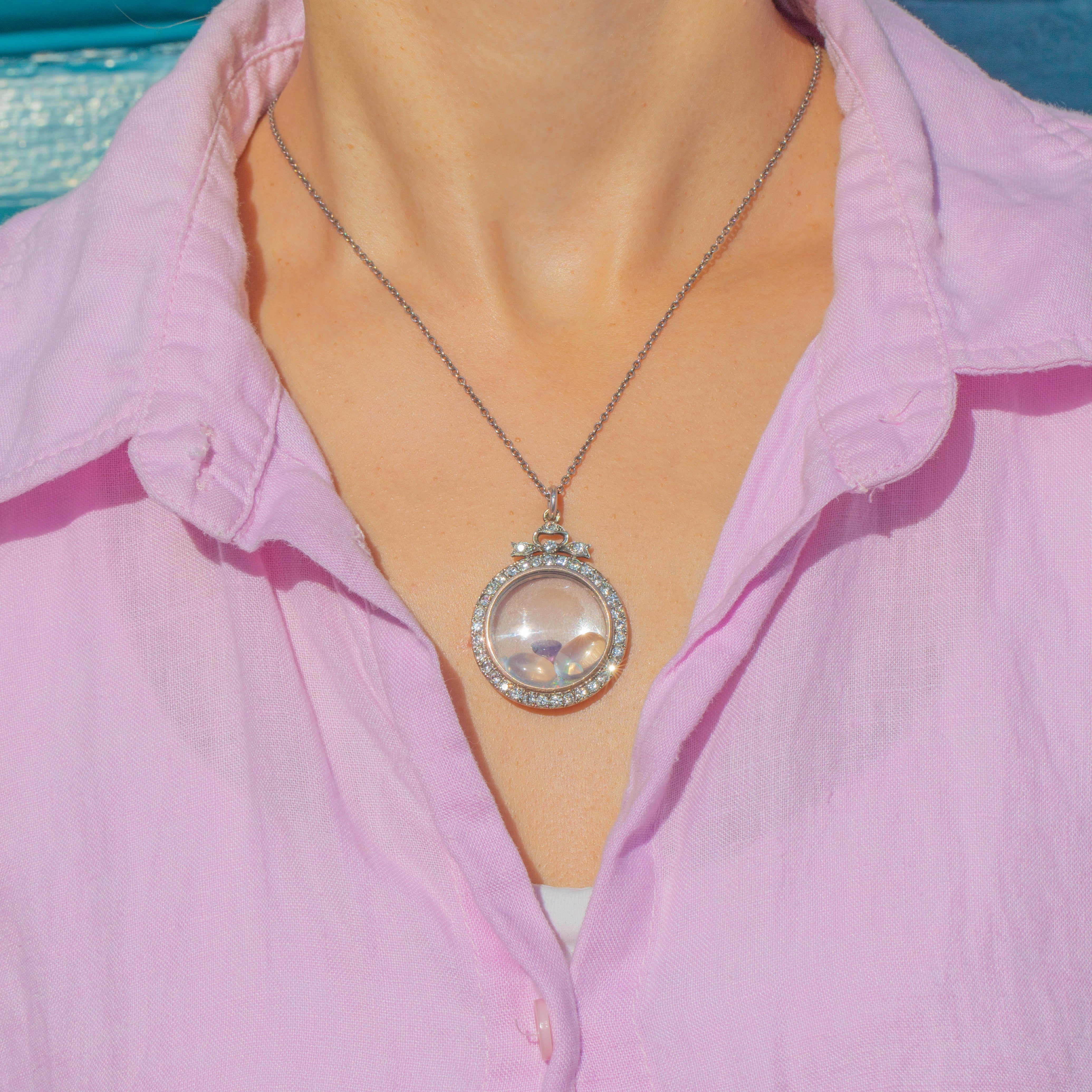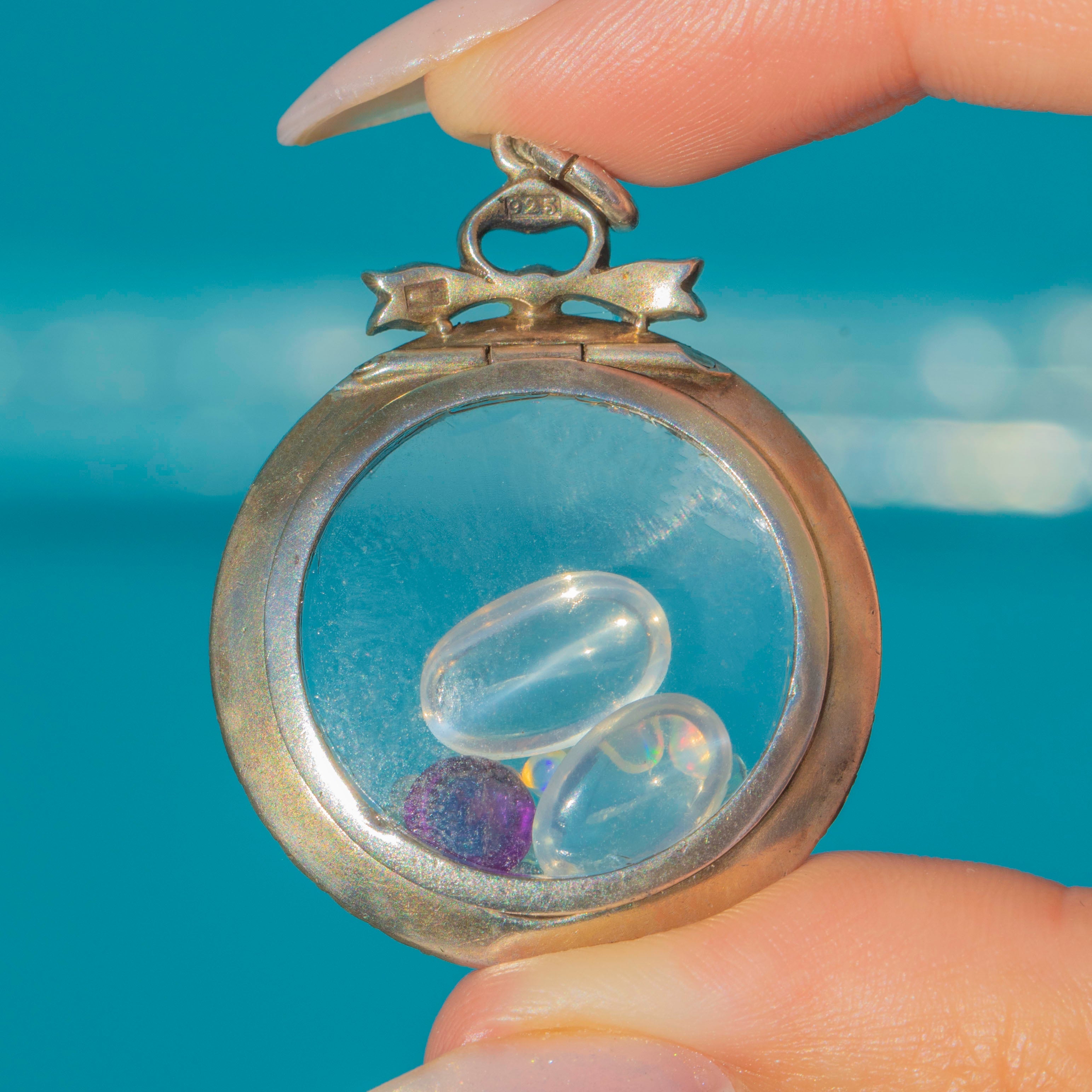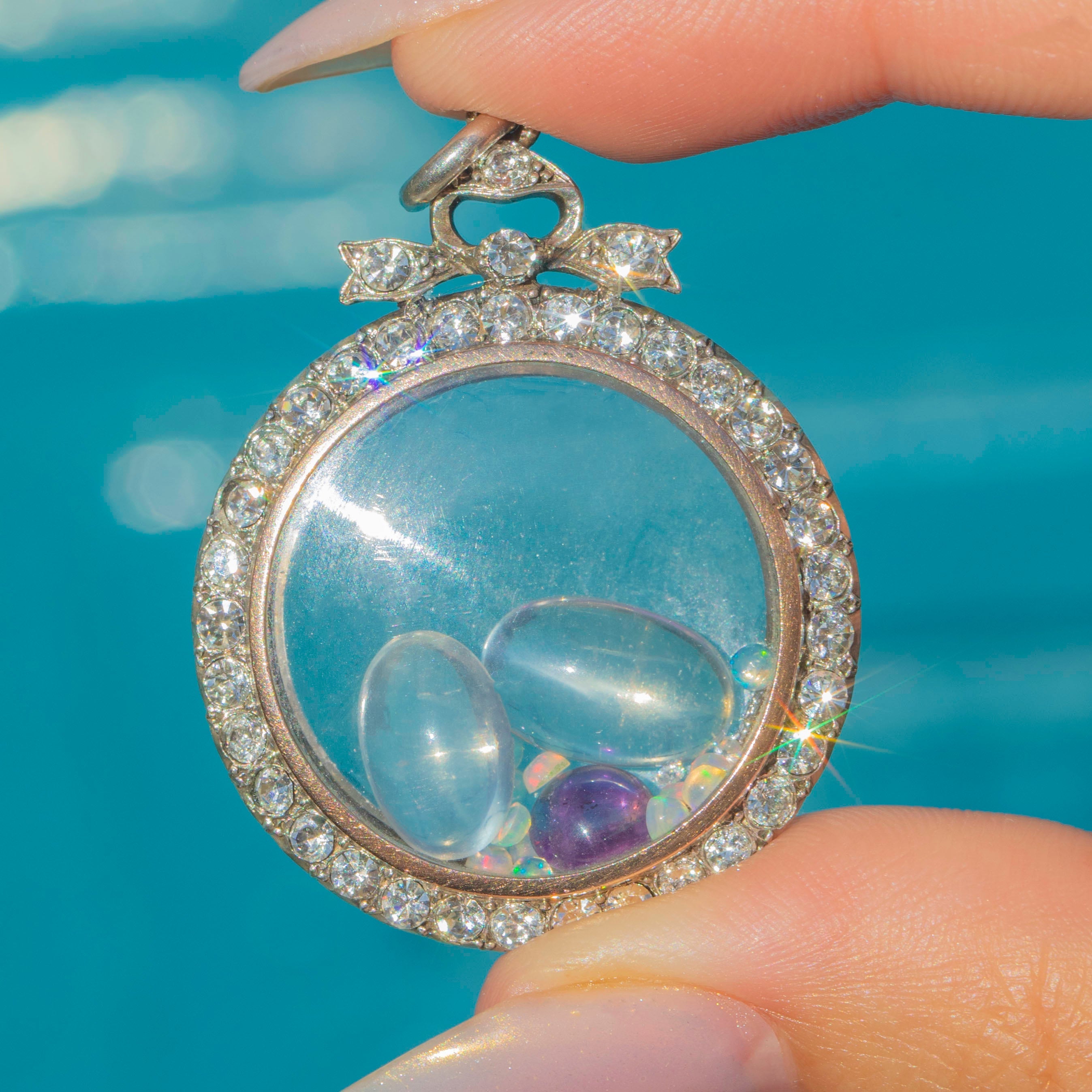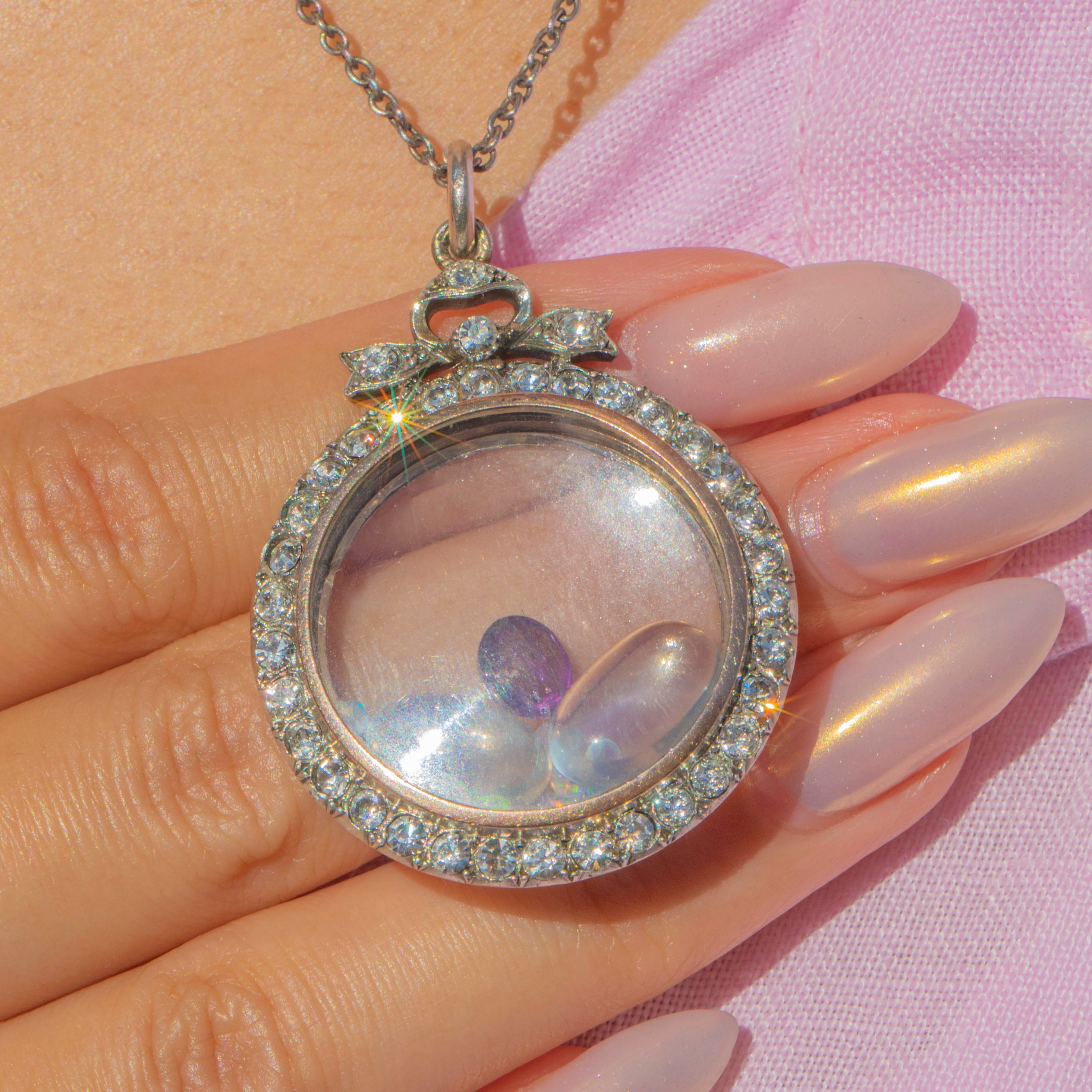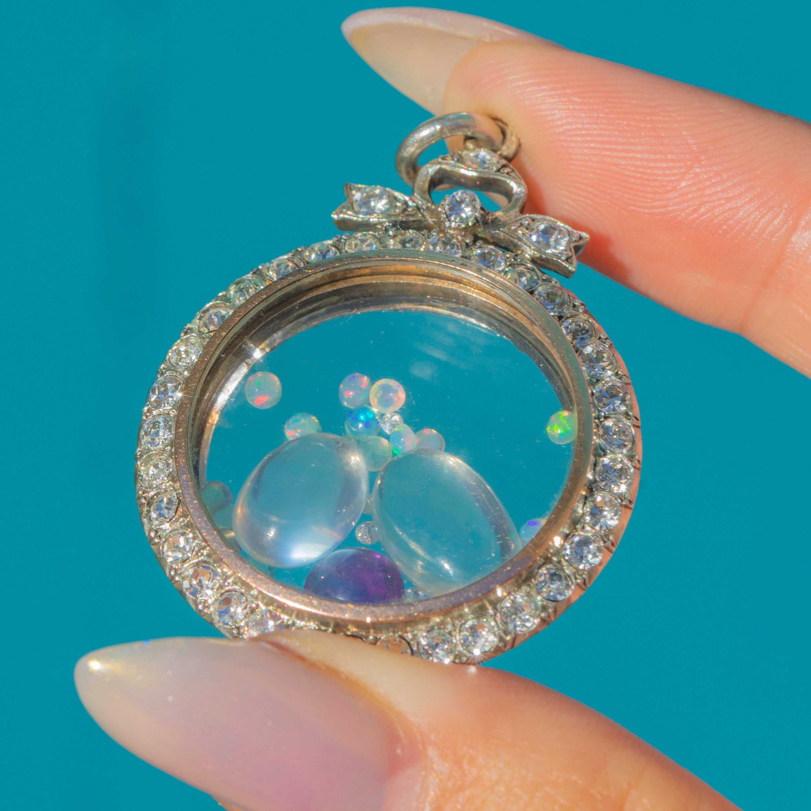 This Edwardian portrait locket is a finely crafted jewel, designed in Sterling Silver with a 9ct Gold border and set with bright white Paste gems. At the top sits a bow motif, accented with sparkling Paste stones, leading down into a circular locket with glass panels on both sides. Inside is a gorgeous selection of loose Moonstones, Opals and a vibrant Amethyst, creating a playful shaker locket.
