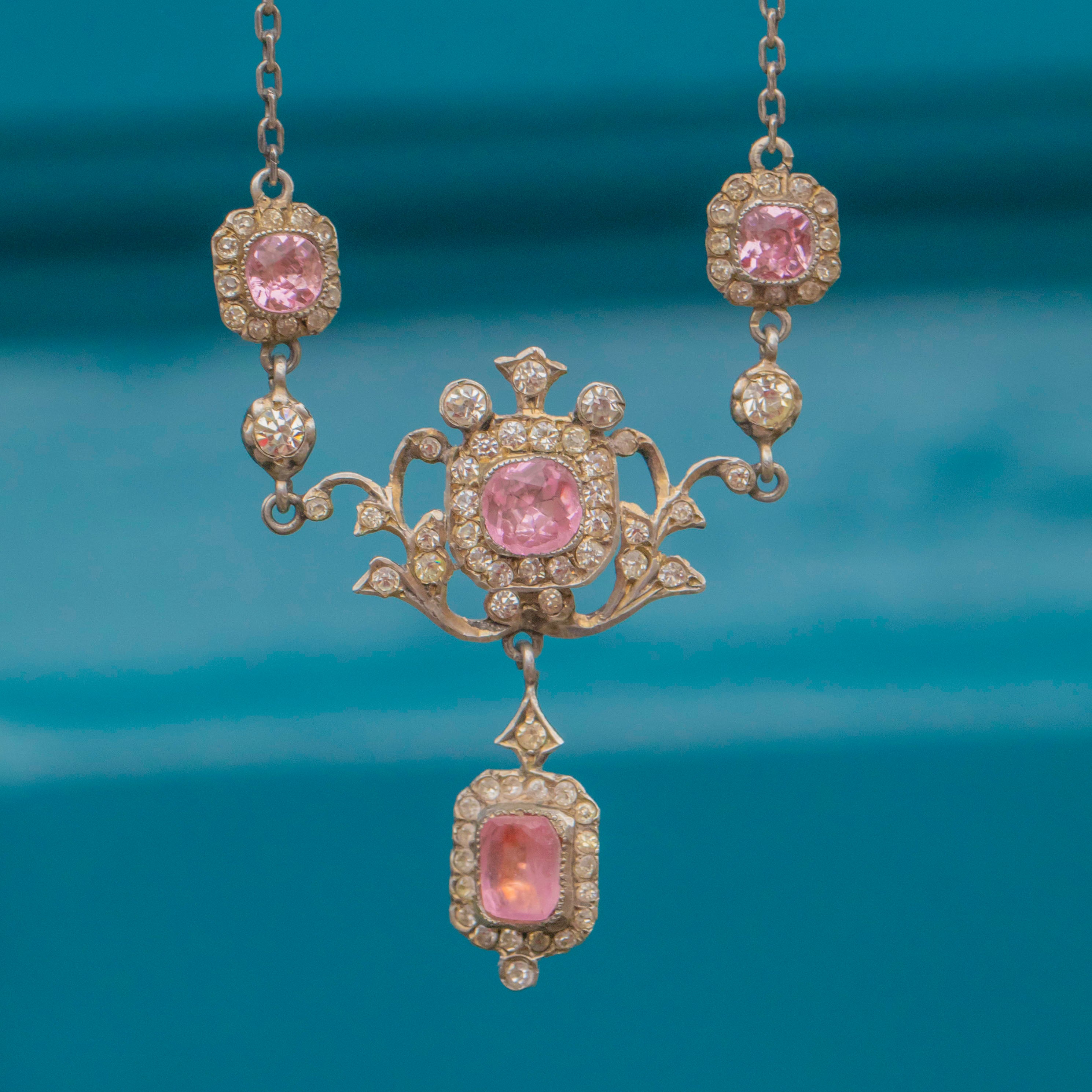 Edwardian Silver Pink Paste Lavalier Necklace
