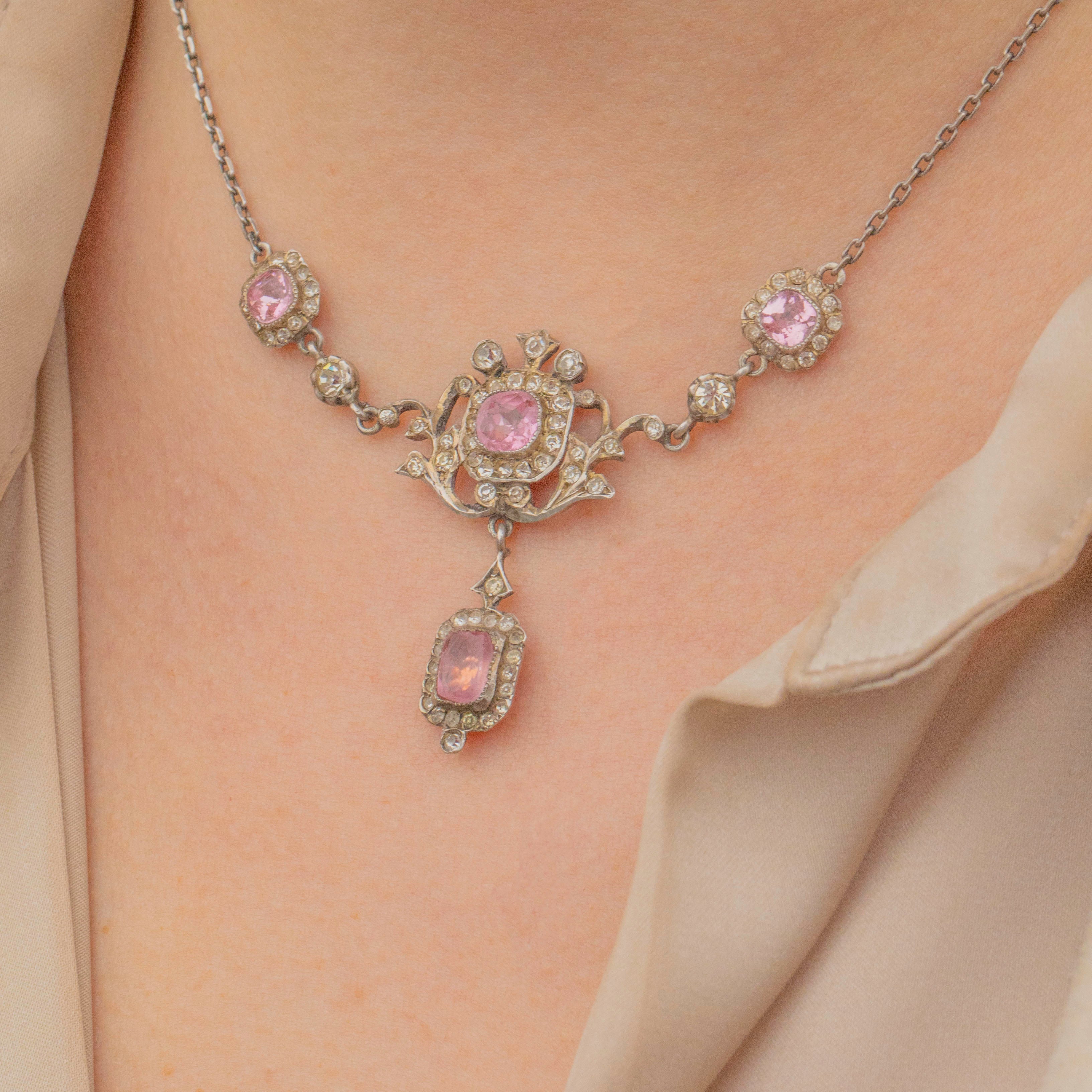 VERY GOOD: This Edwardian Silver pink Paste lavalier necklace is in very good condition. Her Pink Paste gemstones are bright with the most gorgeous baby pink hue. There is some discolouration to the White Paste, however, this is only truly noticeable under close inspection. The silver shows a natural patina, enhancing her Edwardian character, and the clasp is fully functional.