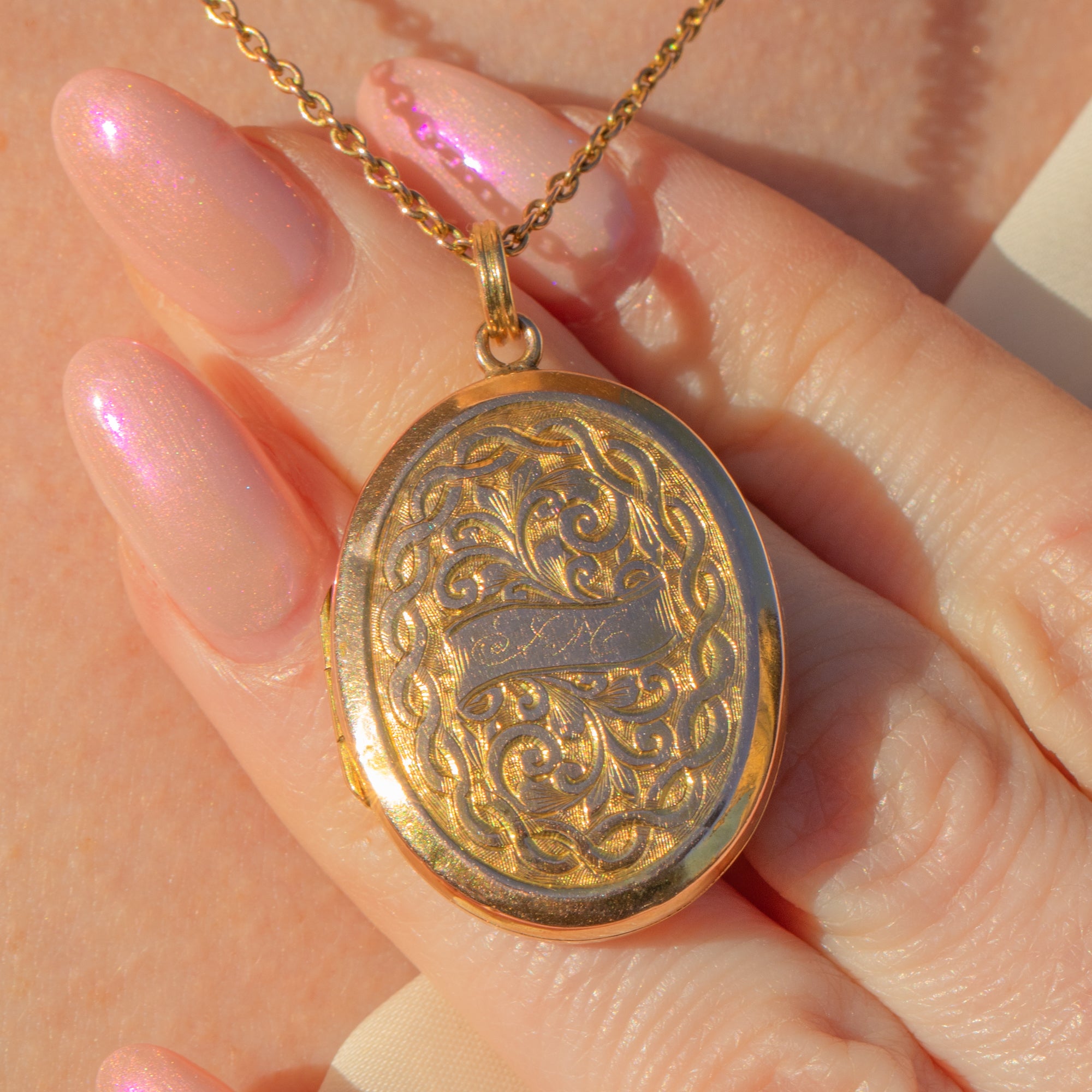 A classic Edwardian solid 9ct Gold engraved oval locket! This Edwardian locket is hallmarked to 1908, and has been thoughtfully engraved on both front and back.