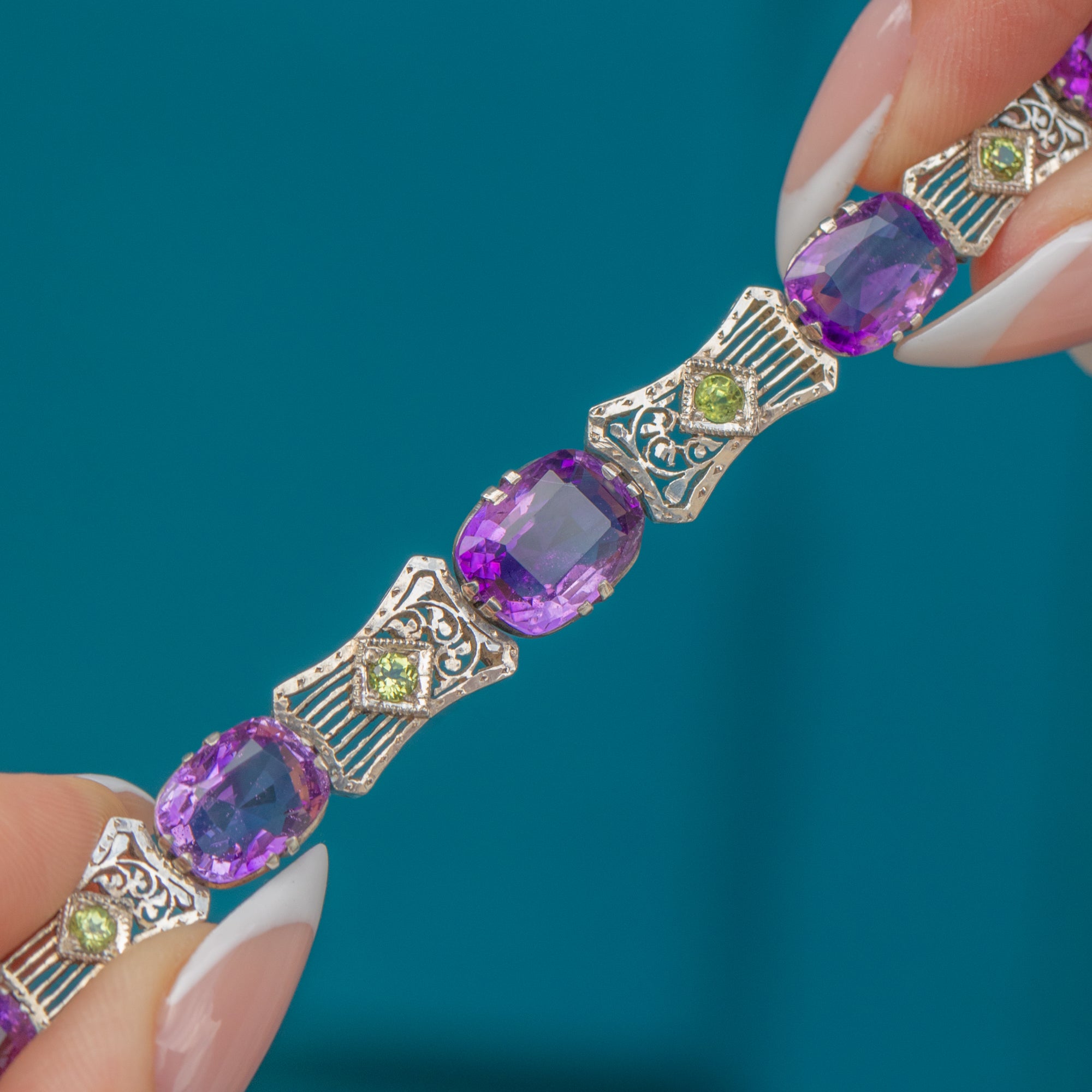 This Edwardian bracelet captures the spirit of the Suffragette movement with its vibrant palette of purple, green and white. Nine deep cushion-cut Amethysts form the focal point of the design, their rich violet hues complemented by fresh green Peridots and sparkling Silver links.