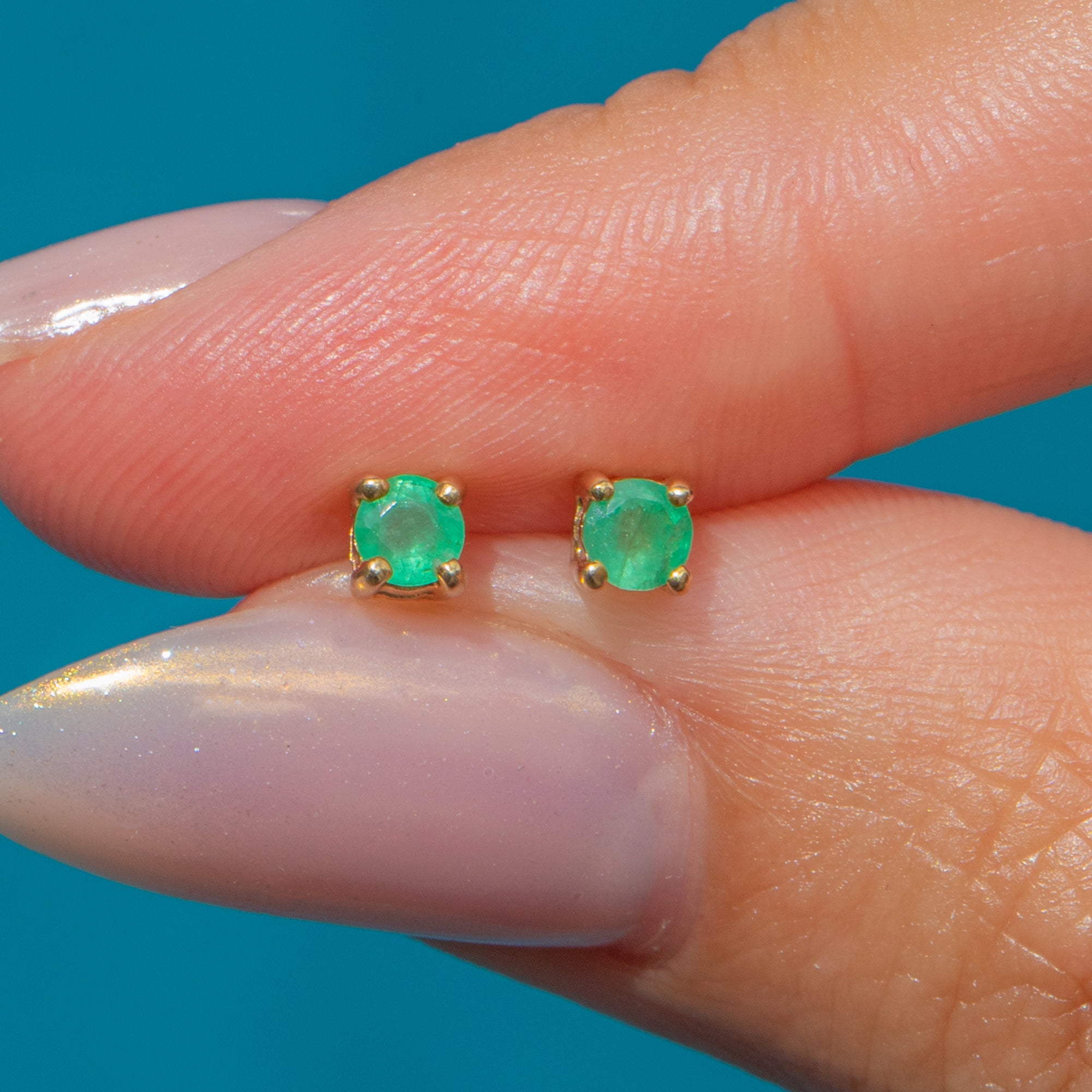 A pretty pair of Vintage Emerald stud earrings in 9ct Gold. The vibrant green Emeralds measure 3mm each, with a combined weight of approximately 0.20cts, held securely in classic claw settings that let the gemstones sparkle with natural charm.