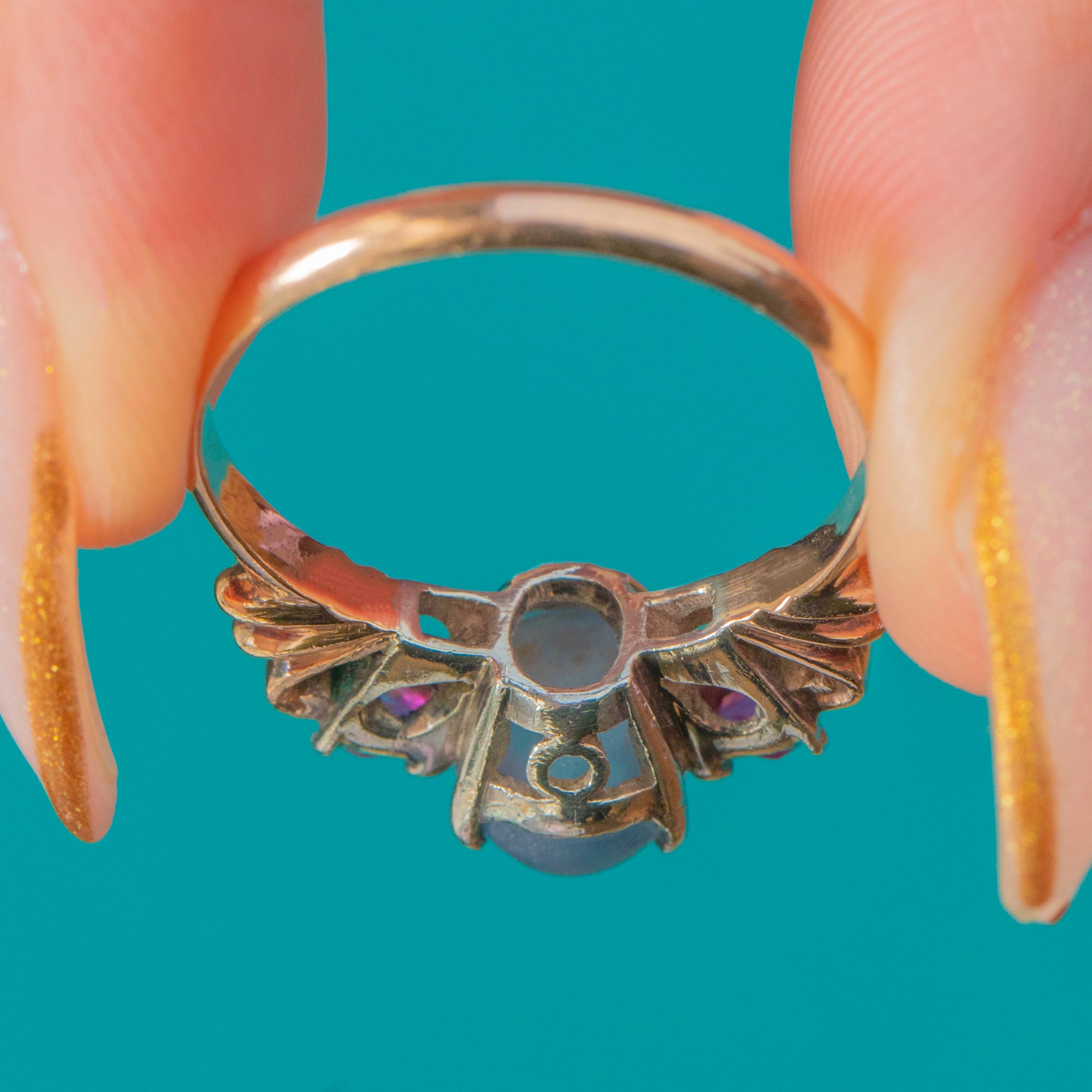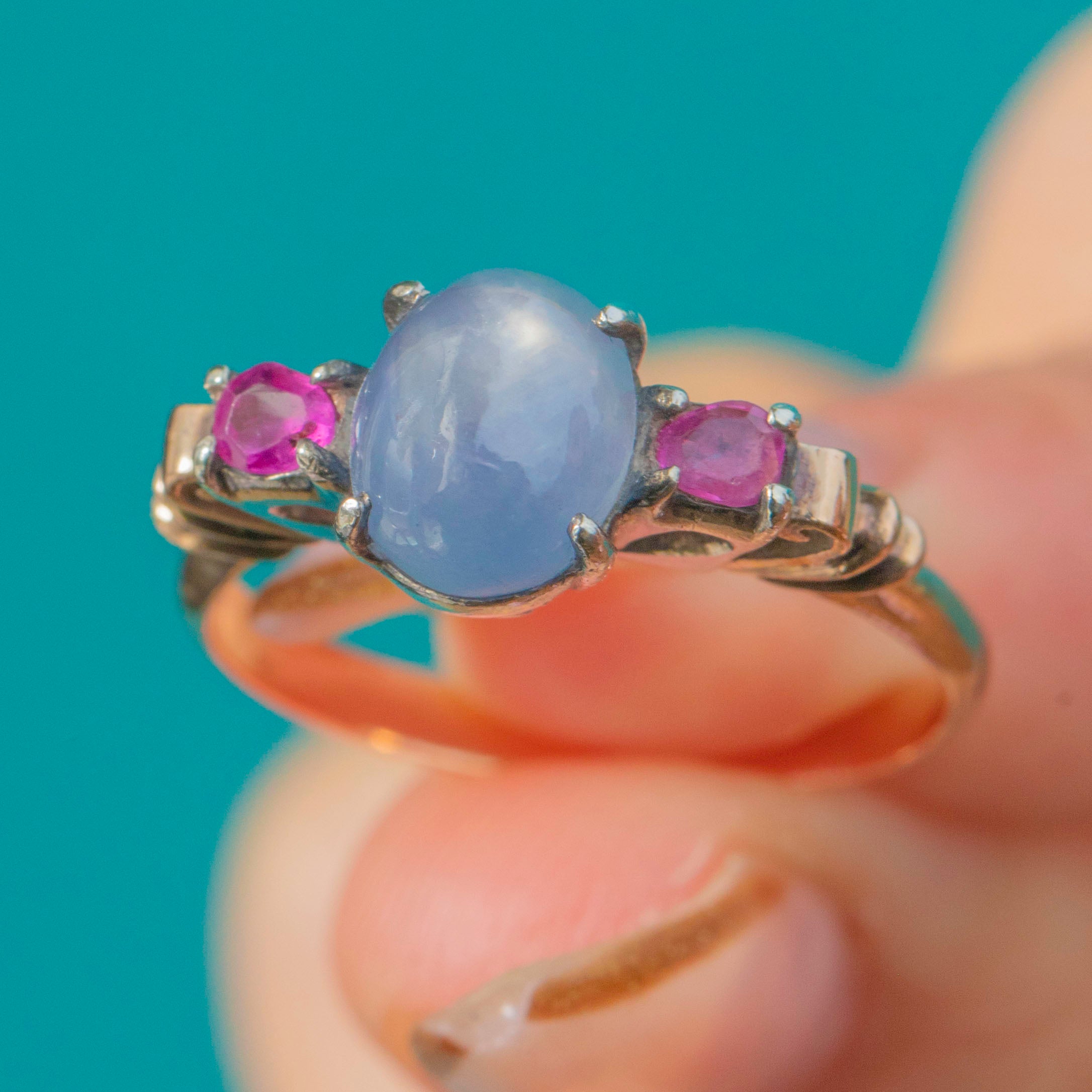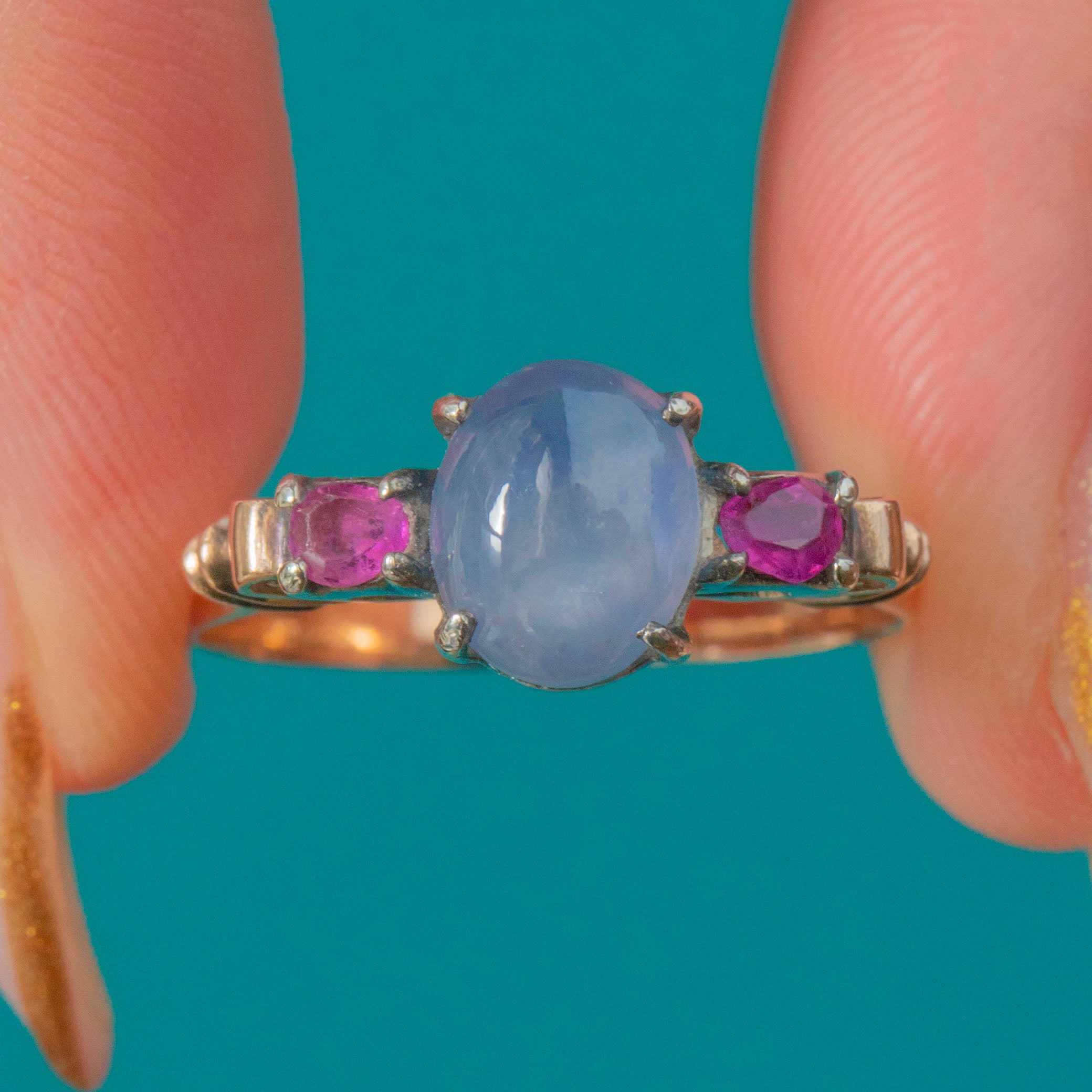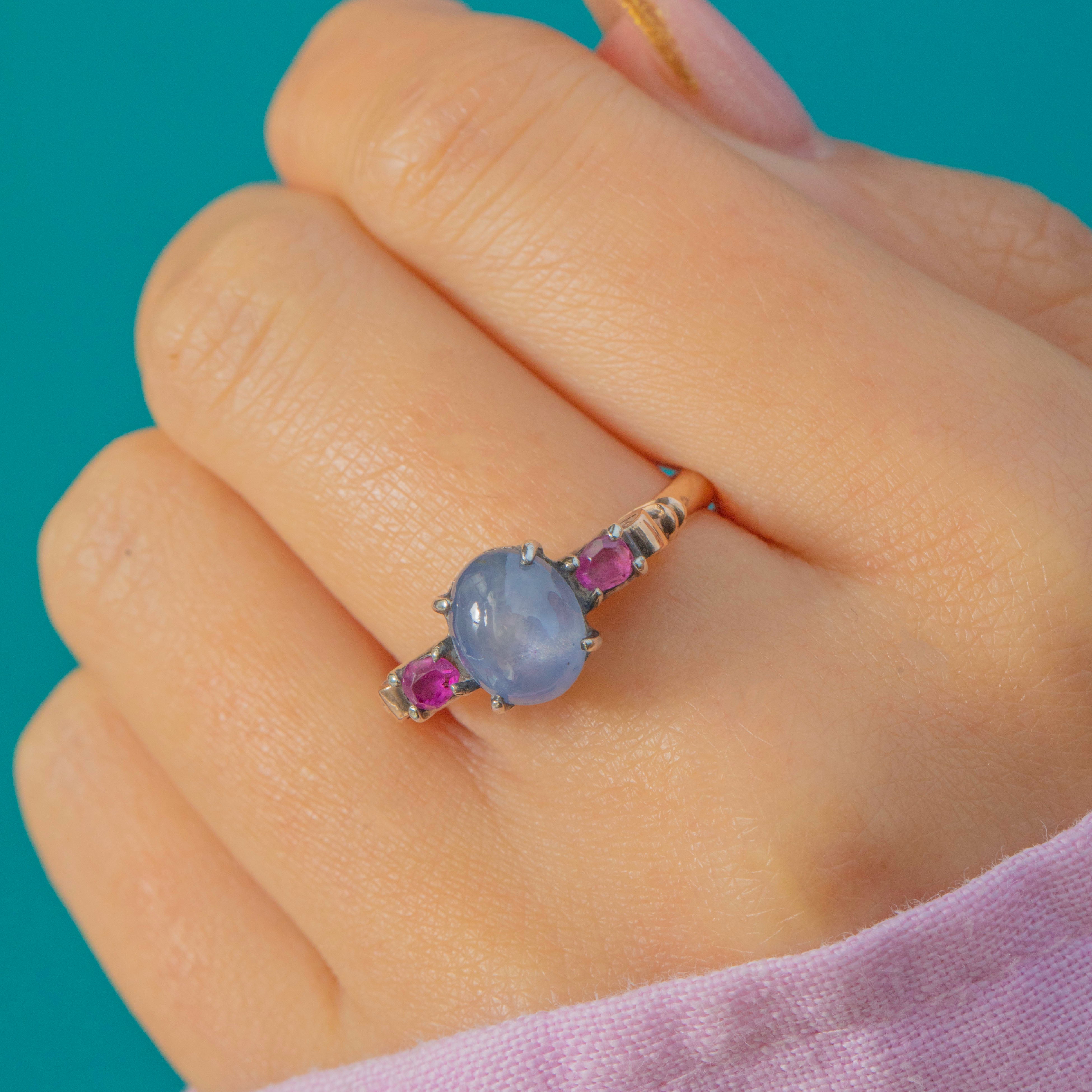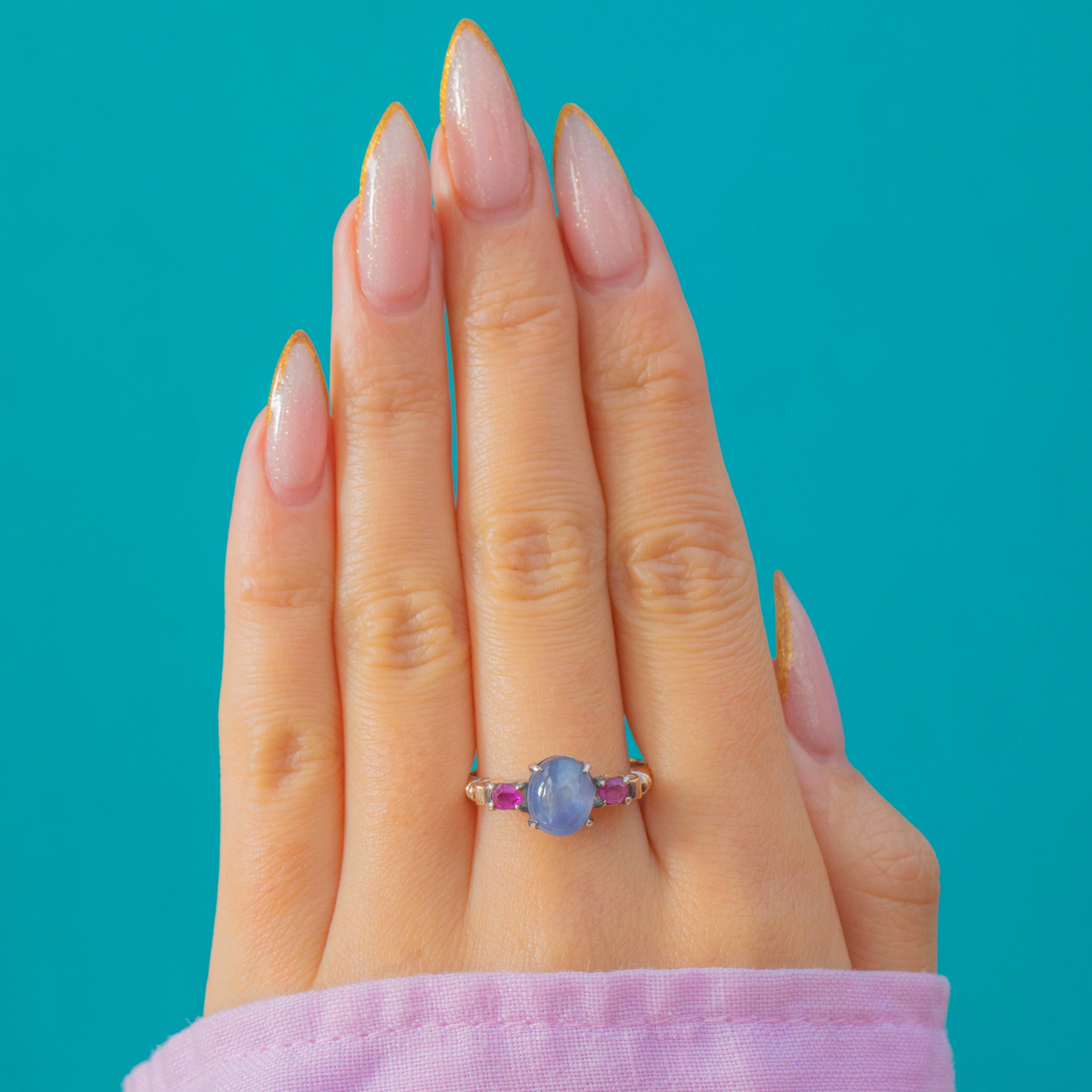 Light, comfortable and full of colour, it’s a unique vintage statement that wears effortlessly day-to-day, with the Star Sapphire adding a magical glow in natural light.