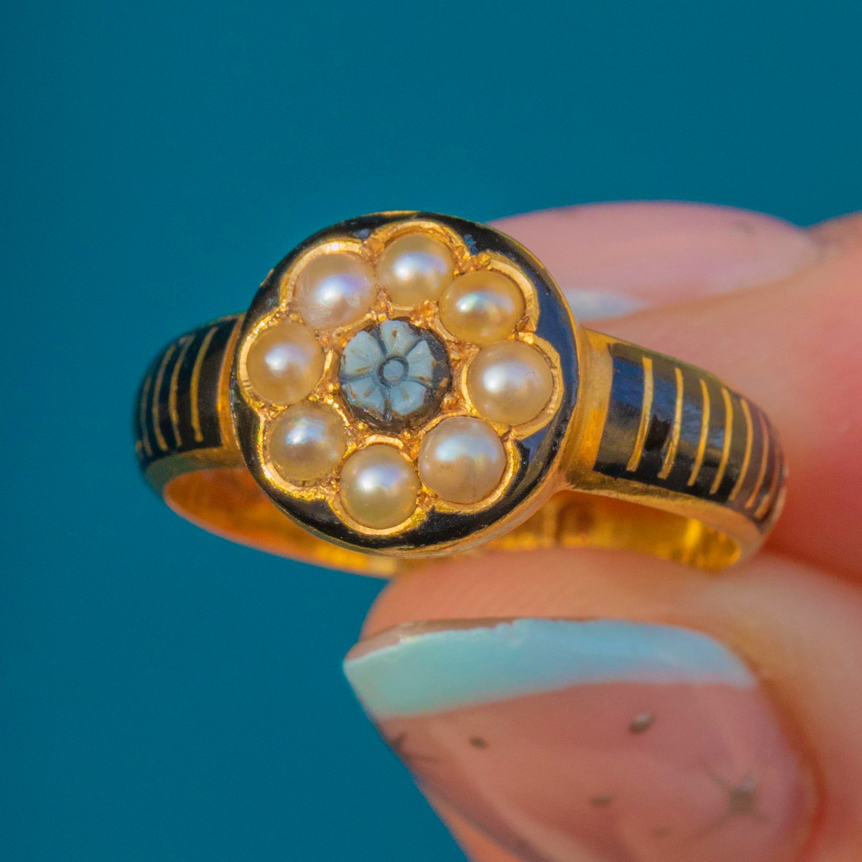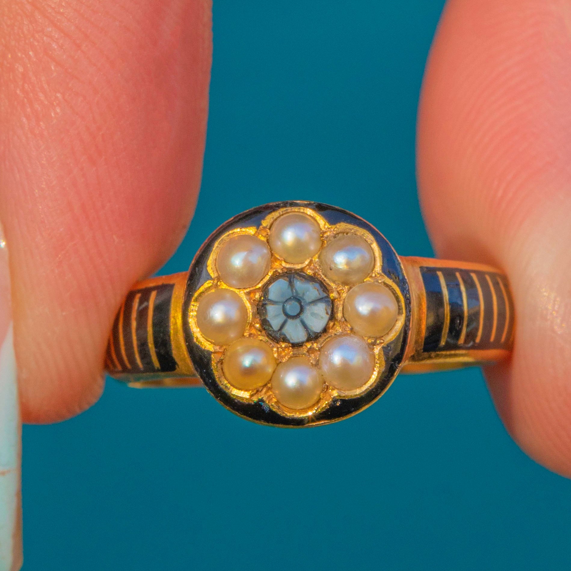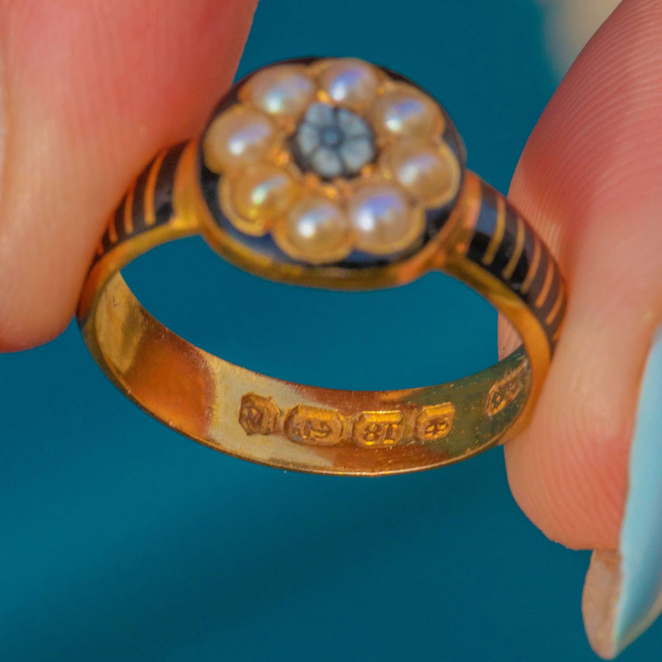 A striking find, this Victorian mourning ring is crafted in rich 18ct Gold with a delicate halo of creamy Seed Pearls encircling a central carved Agate forget‑me‑not. A glossy black Enamel border frames the cluster, lending beautiful contrast and a graphic, refined edge.