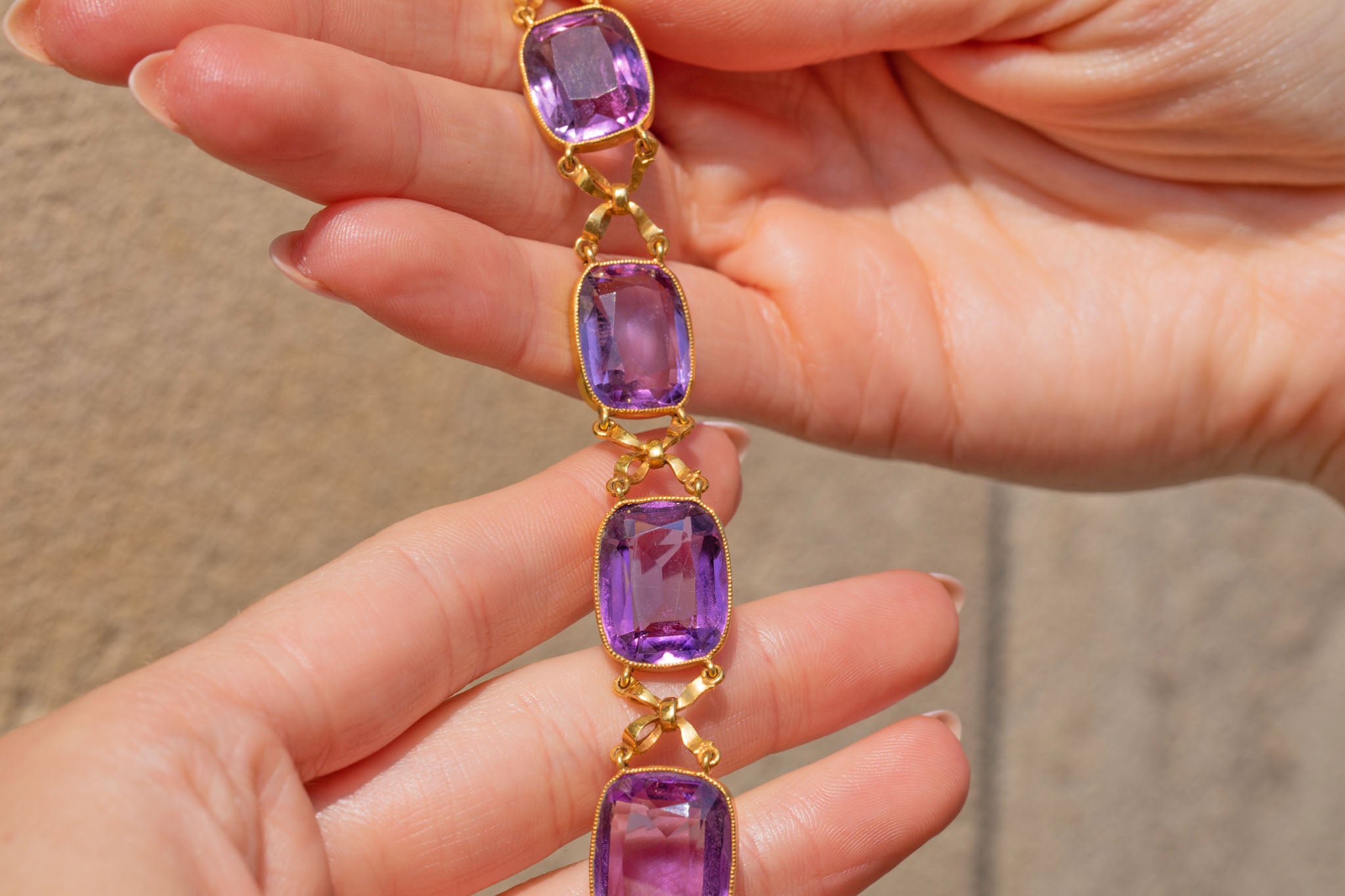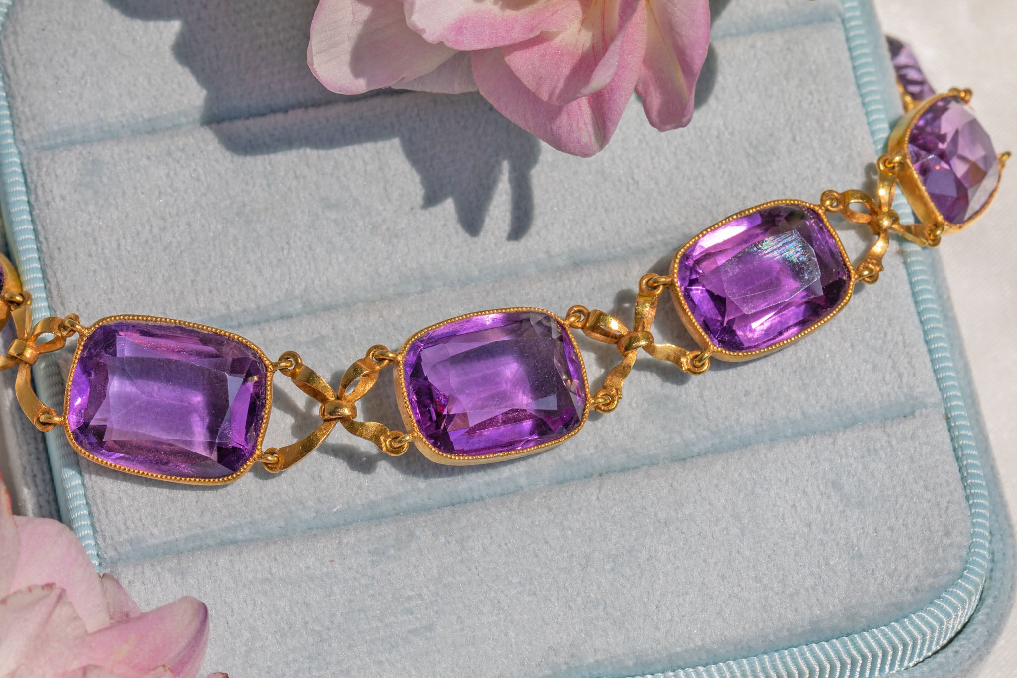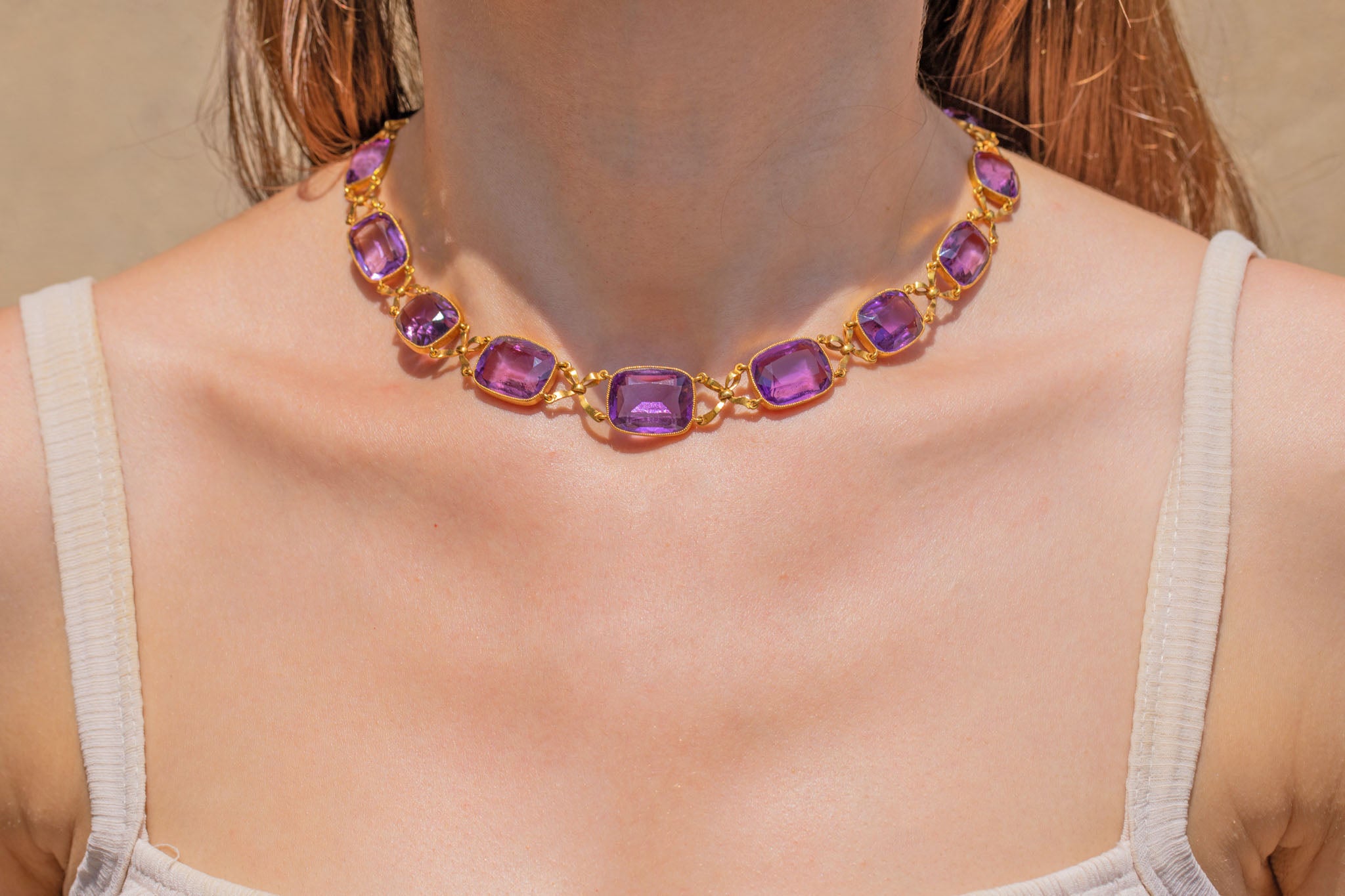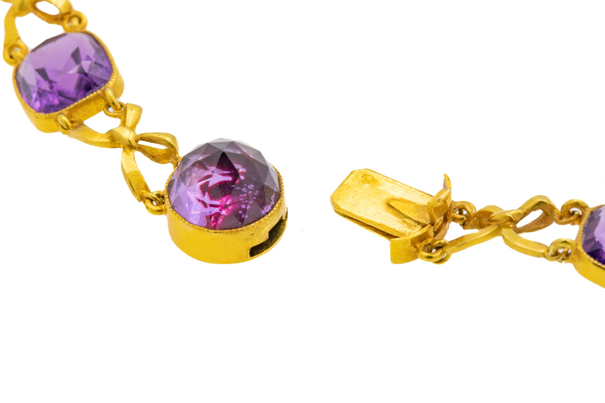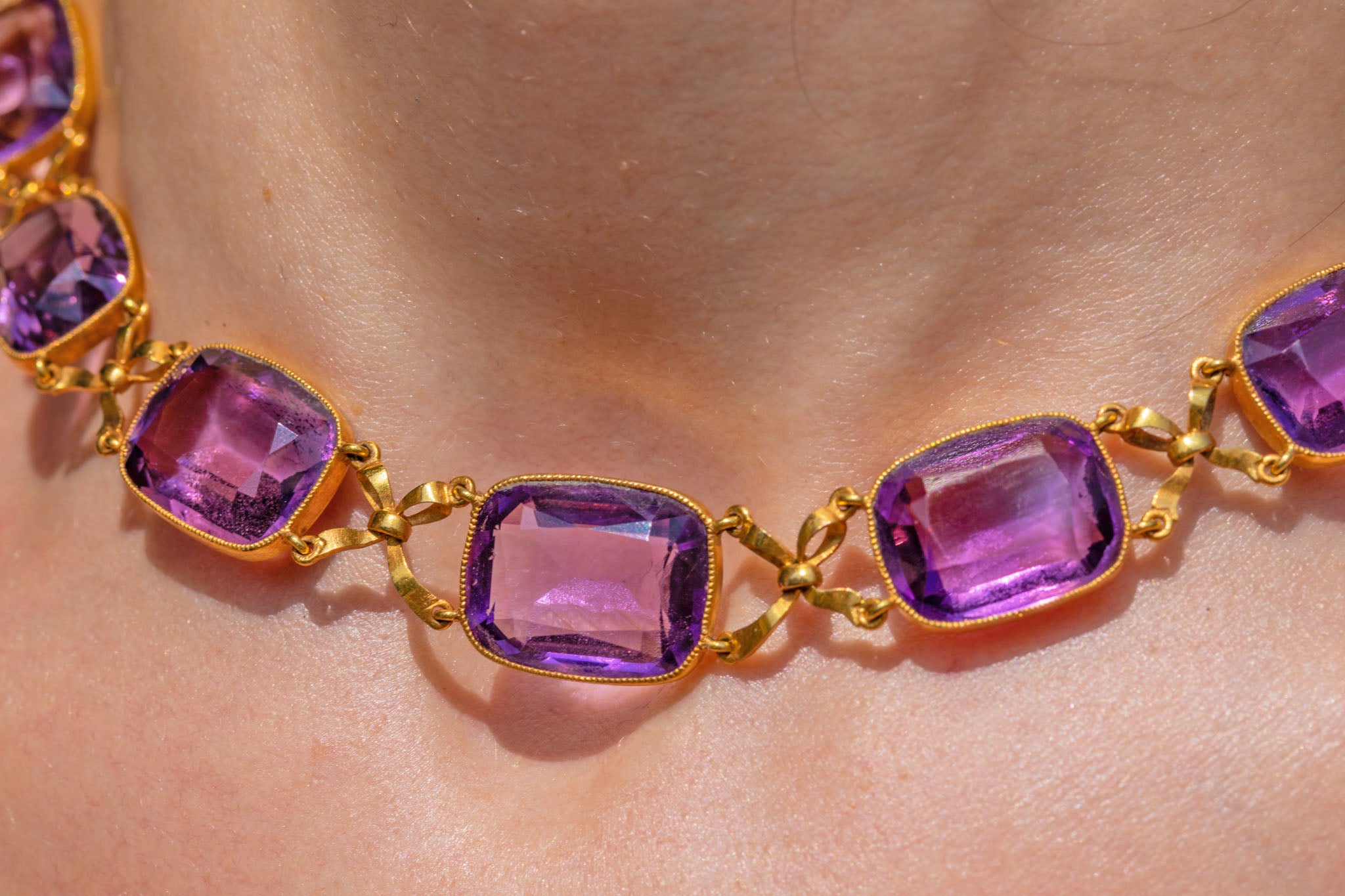 Fit for royalty, this French 18ct Gold Amethyst collar necklace is majestic in every way. Boasting a jaw-dropping 65.90ct of rich purple natural Amethysts, even her clasp is bejewelled with a beautiful foiled rose-cut Amethyst!