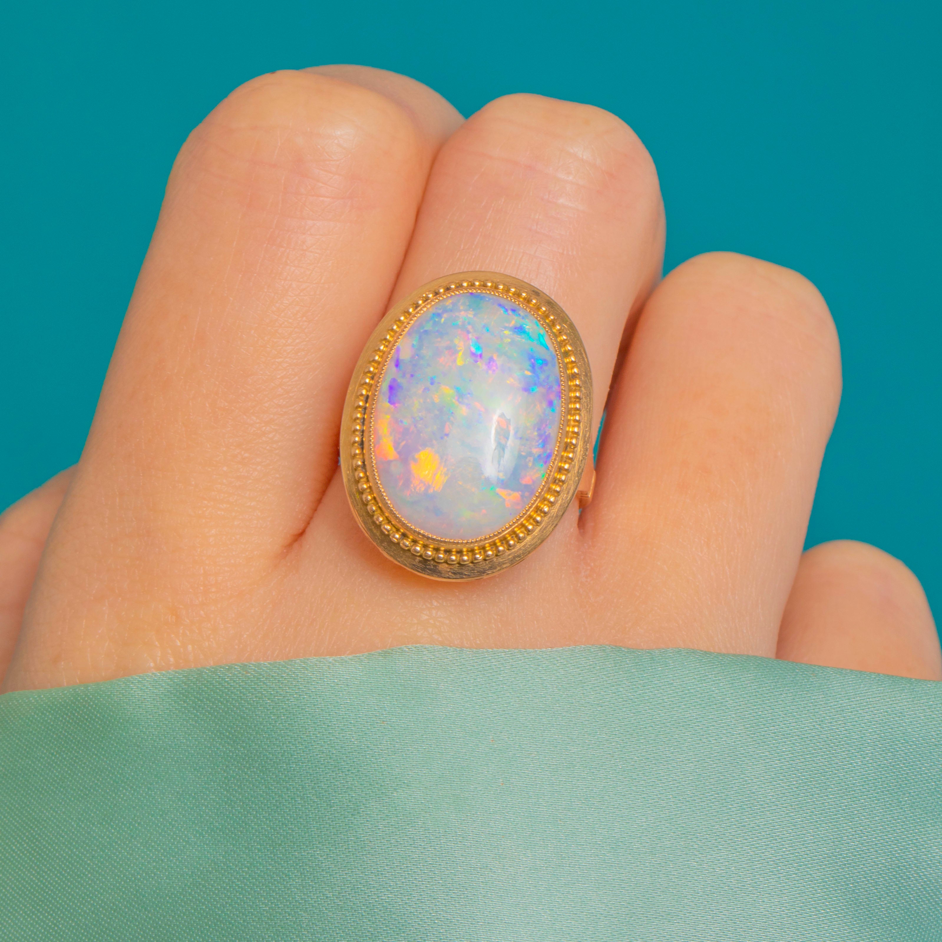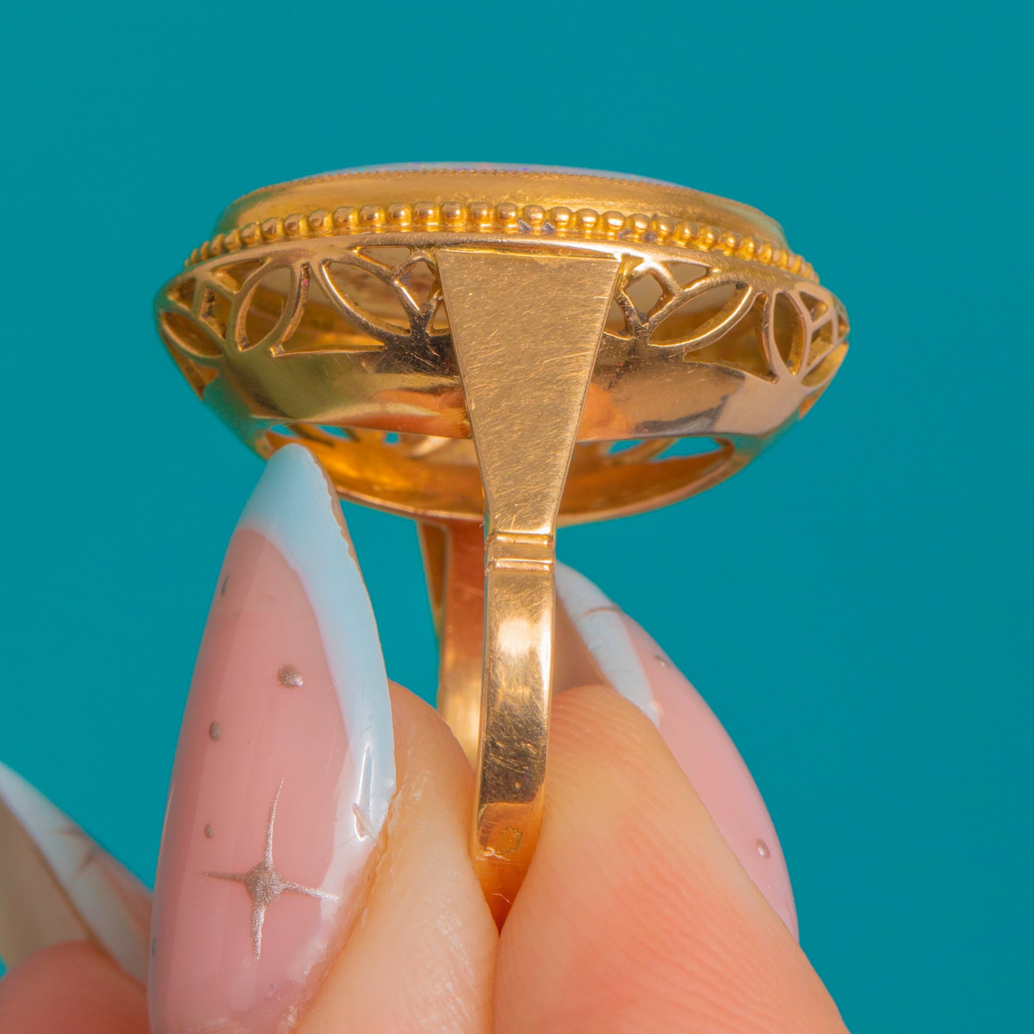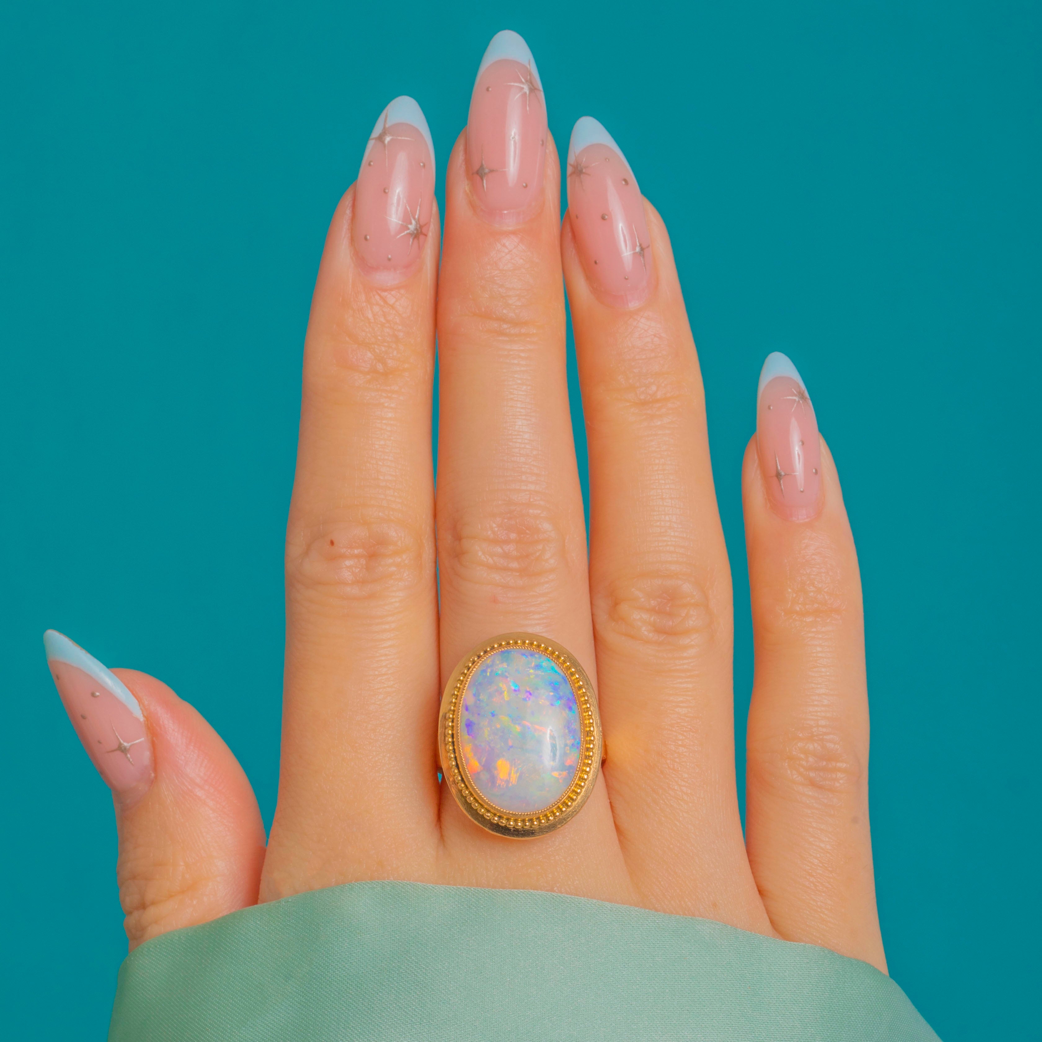 The Opal is cradled within a tall rub-over bezel framed by a refined beaded border. A pierced foliate gallery and elegant split shoulders bring lightness and grace to the statement head, flowing into a smooth, comfortable shank. Mid-Century Vintage, she has a chic, softly ornate design with a beautiful presence on the hand.