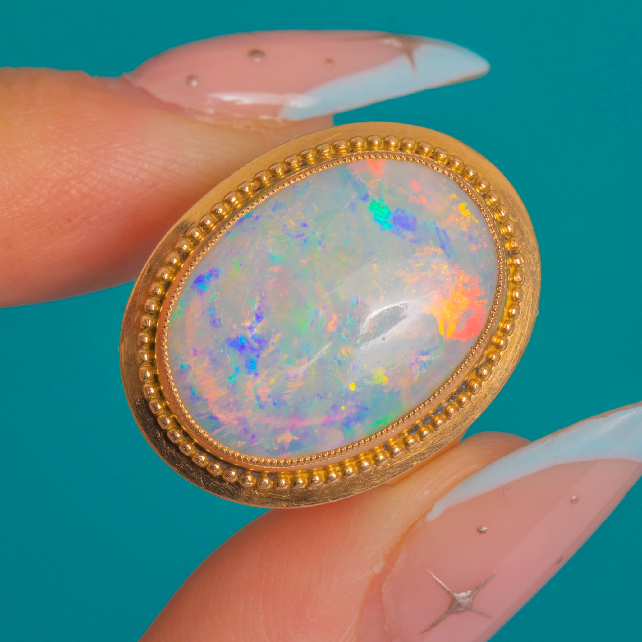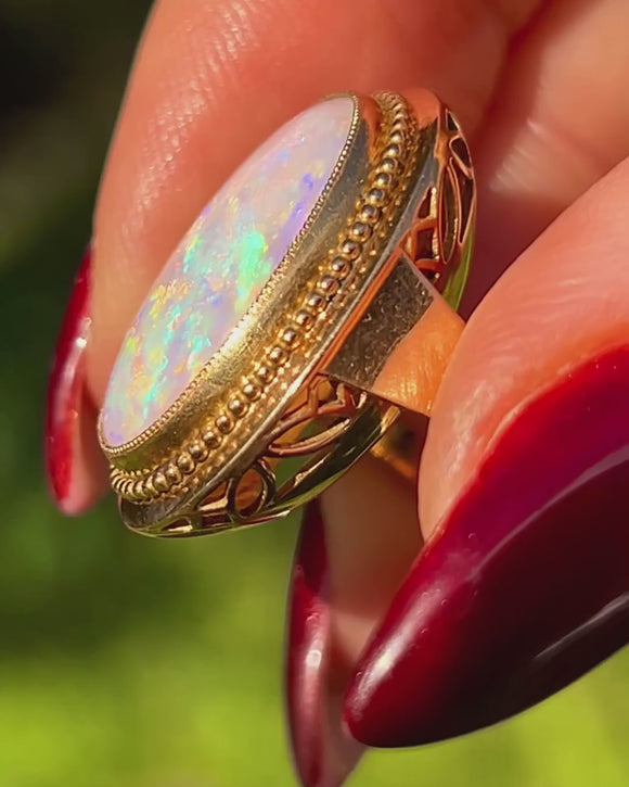 EXCELLENT: The Opal is smooth and bright with no chips, cracks or crazing visible. The Gold setting and beaded milgrain are crisp with only light surface wear, and the pierced gallery and shank are clean and well-preserved.