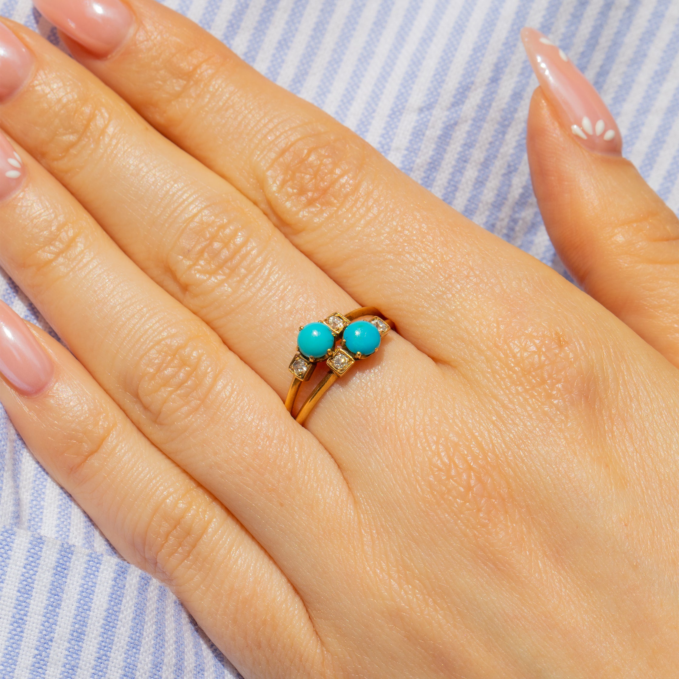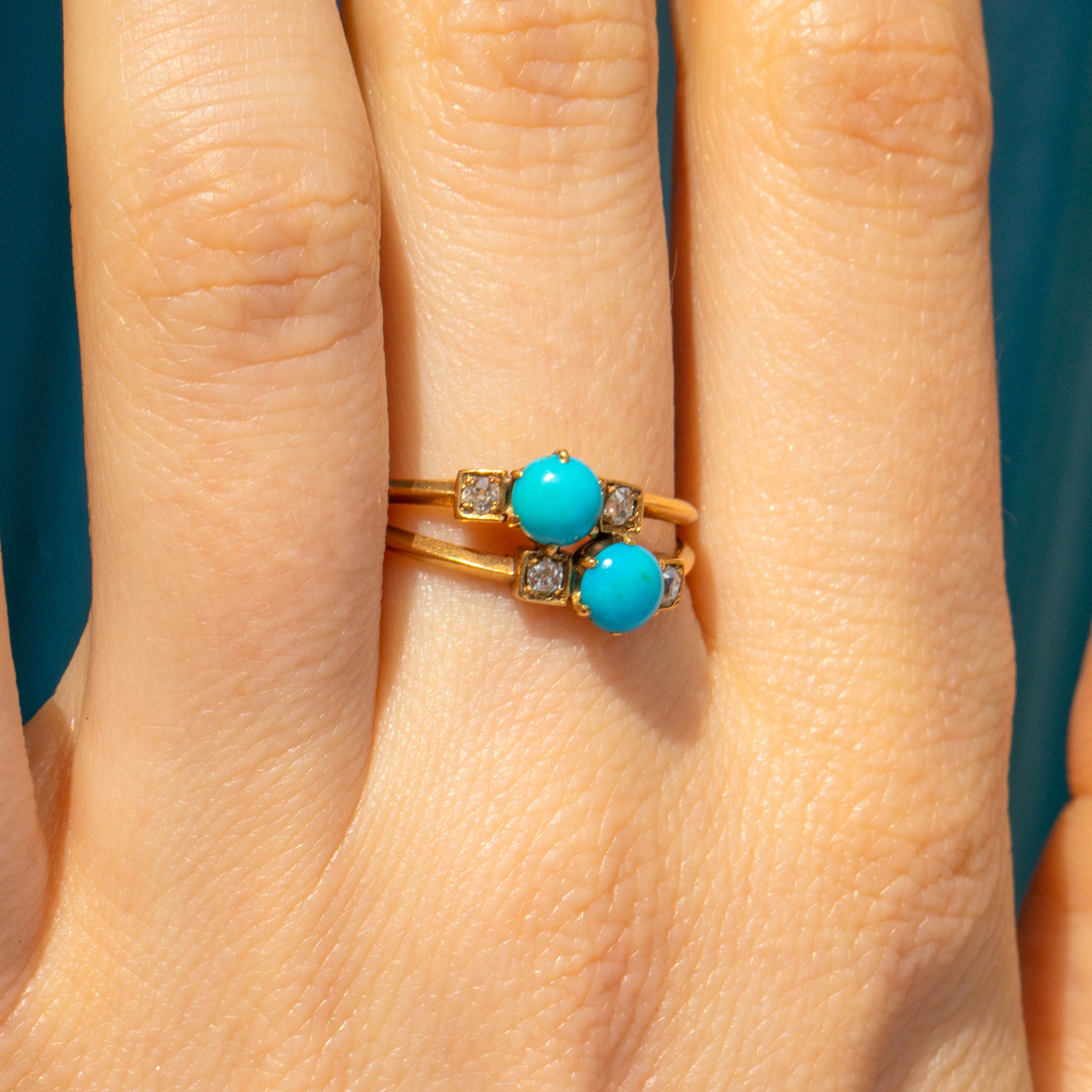 The Turquoise cabochons possess that highly desirable Robin's egg blue hue, and accompanied by twinkling antique Diamonds, this unique Gold ring is stamped with a French Eagles head on the outside of the band to ensure she'll bring that 'je ne sais quoi' to your ring stack!