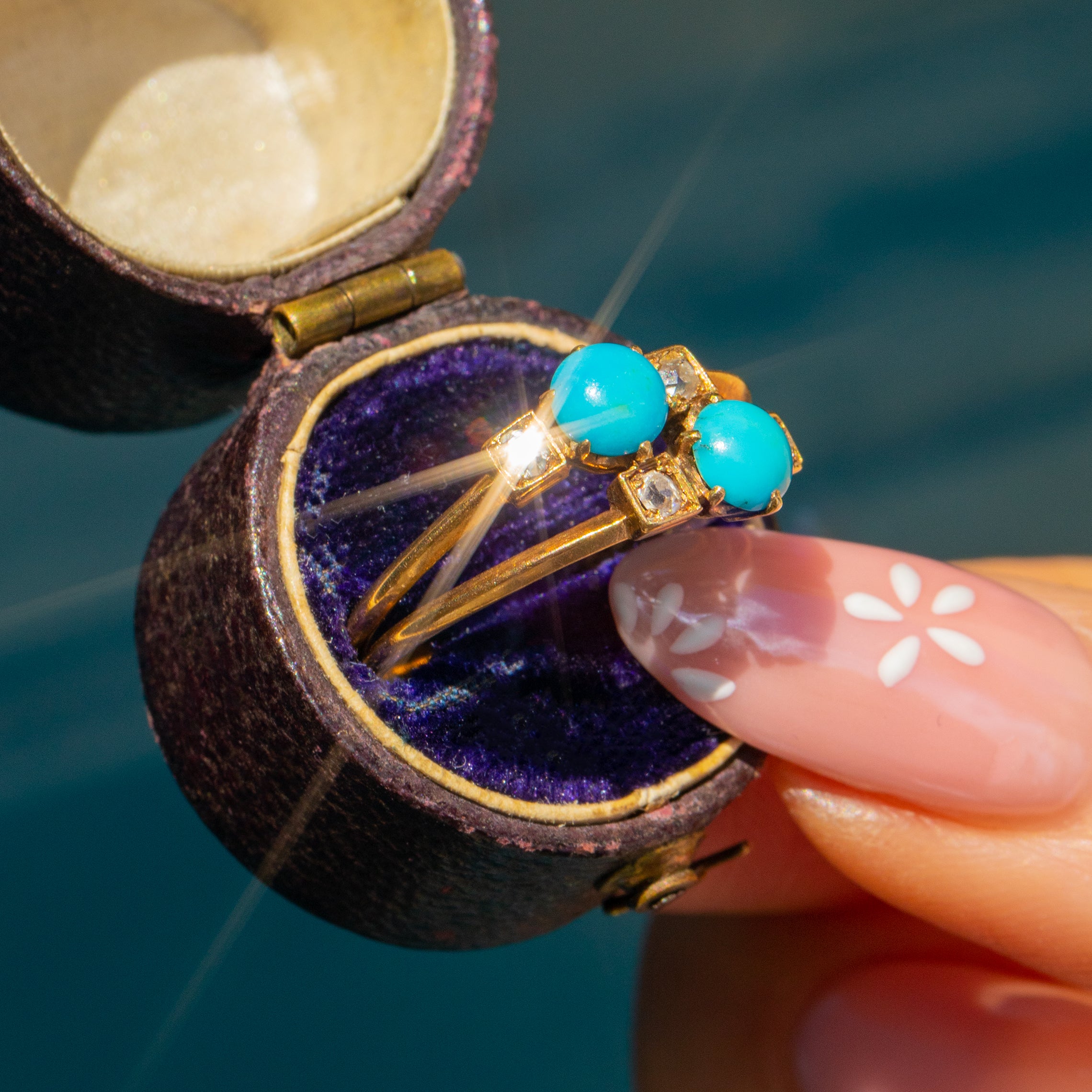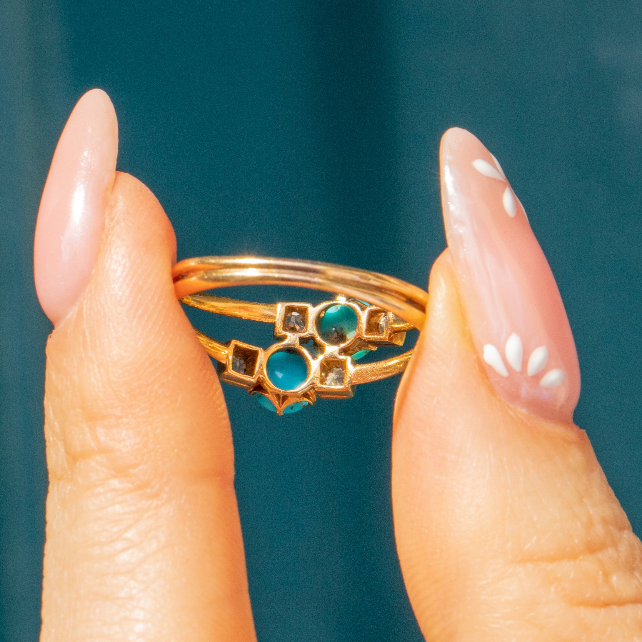 MATERIALS: Tests as 18ct Gold, Turquoise, Old-Mine Cut Diamond.