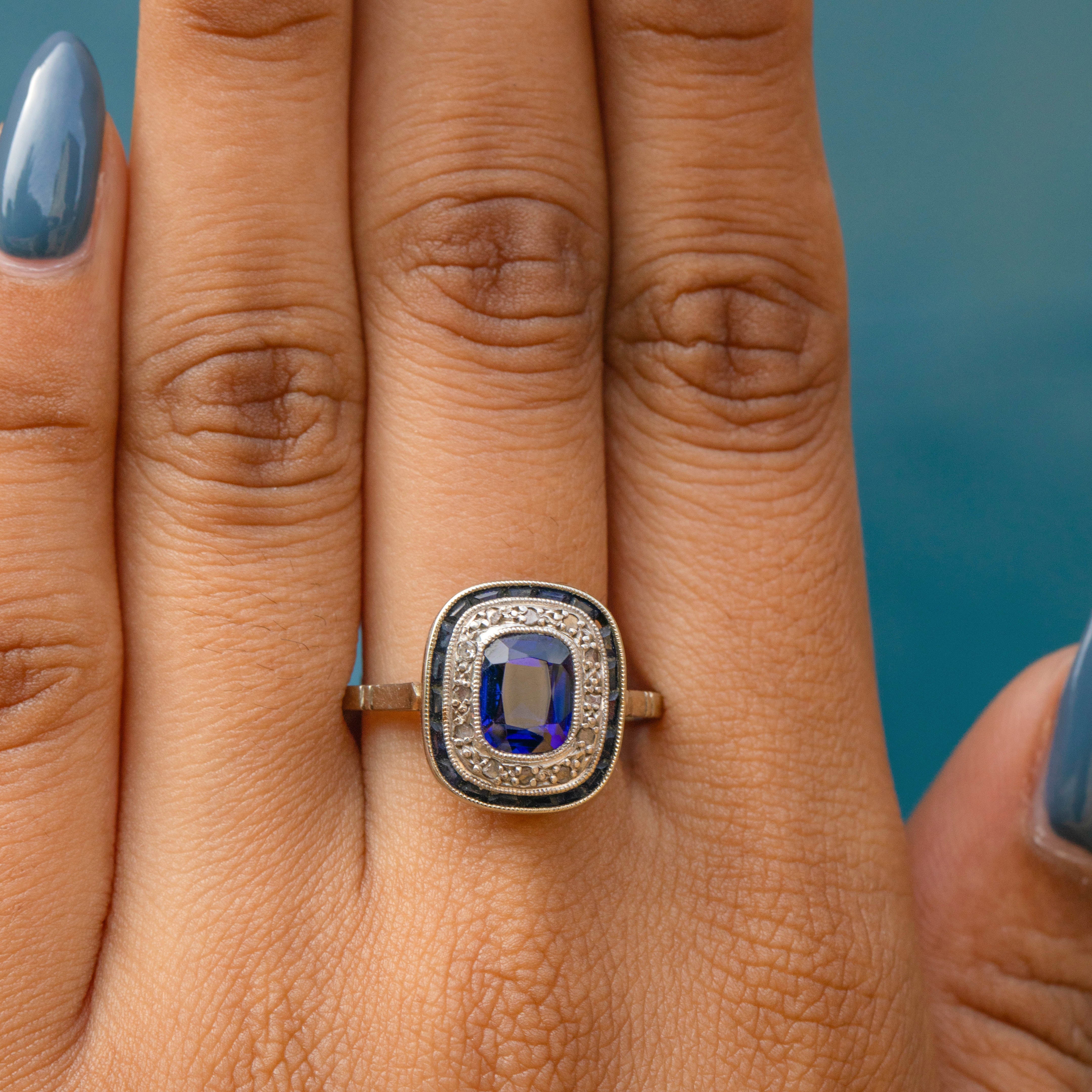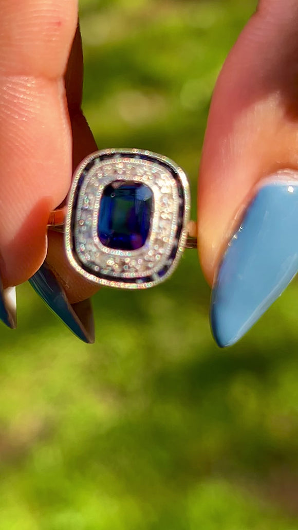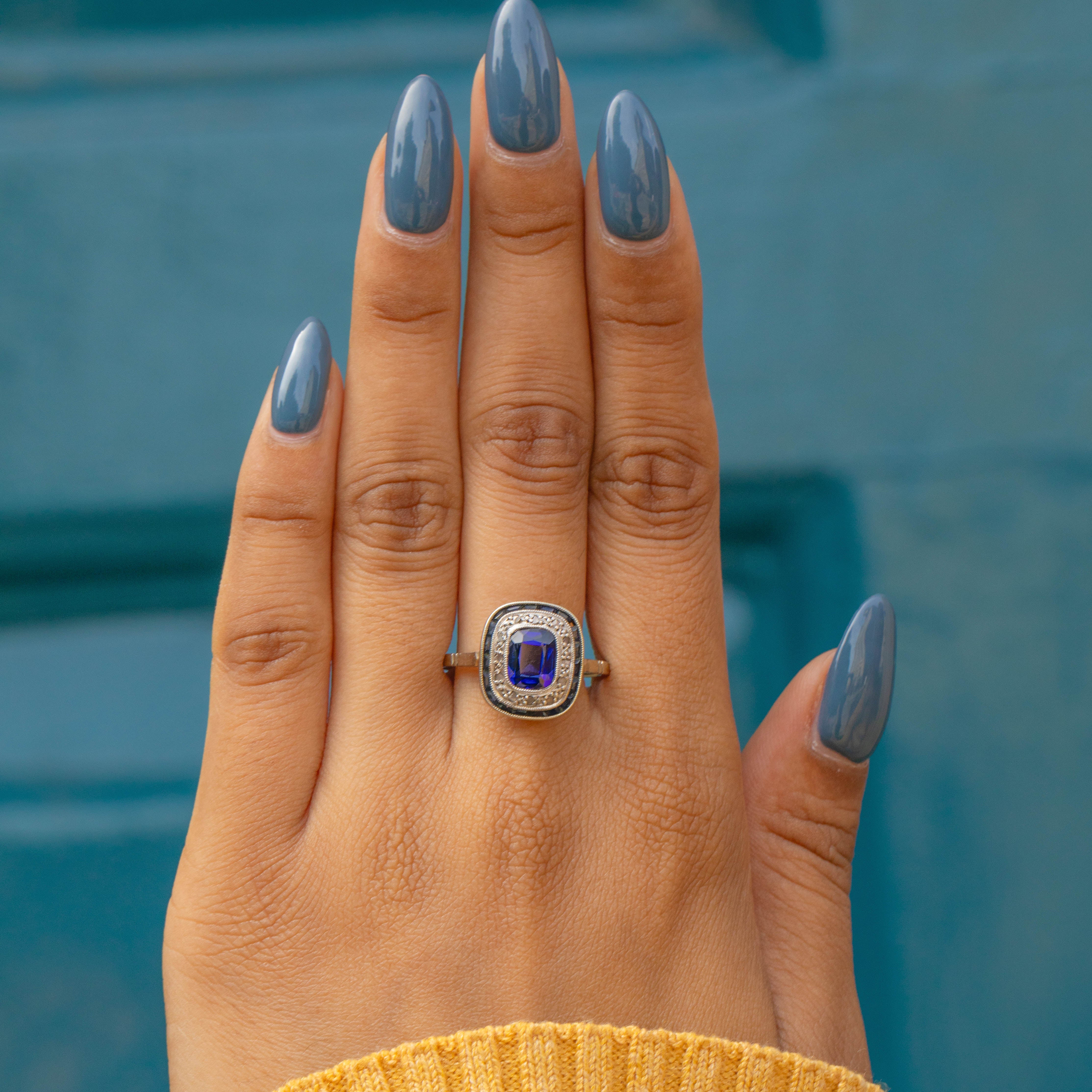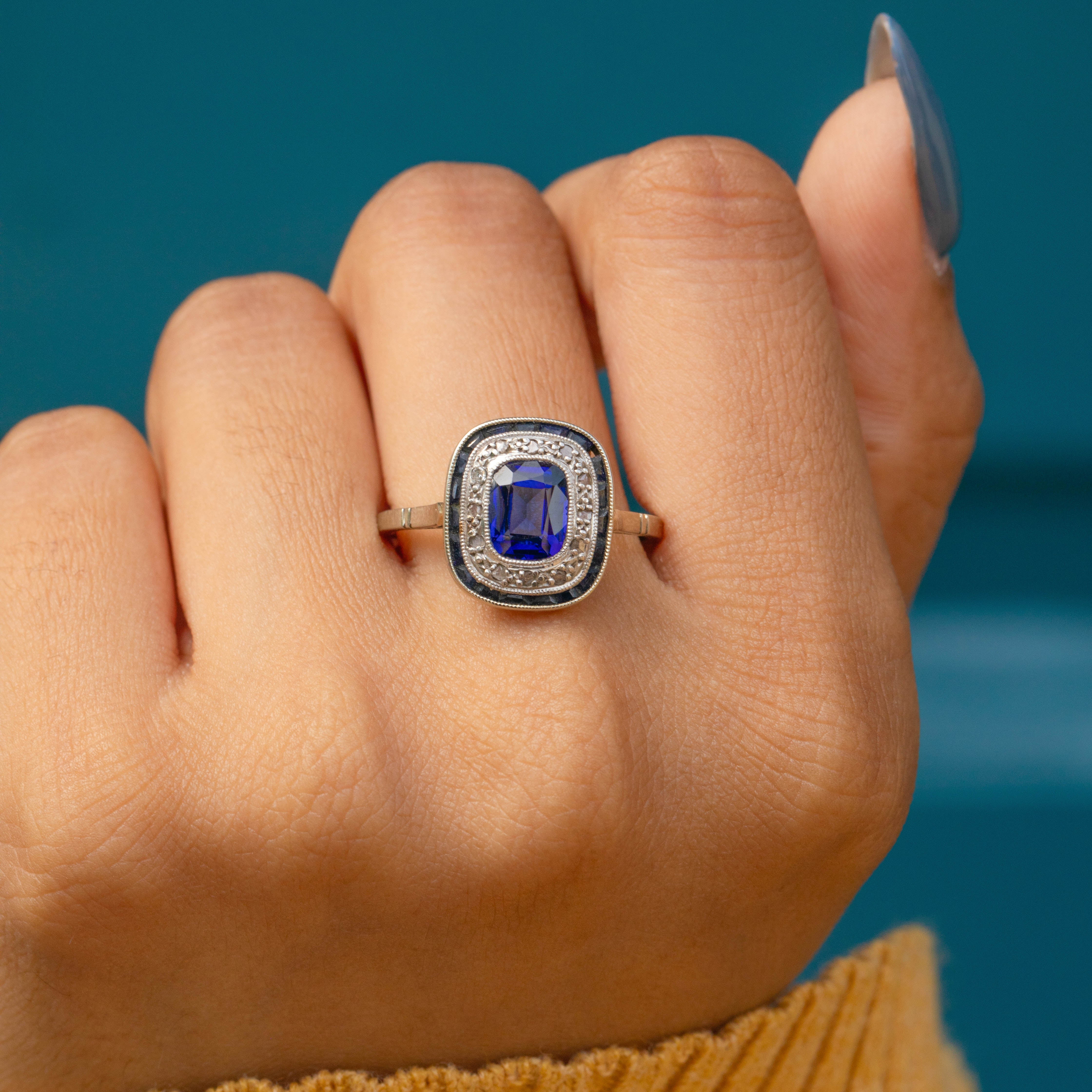 Whether you are looking for a unique engagement ring or simply love to wear resplendent jewels, this French Art Deco 18ct Gold Sapphire Diamond cluster ring has got you covered!