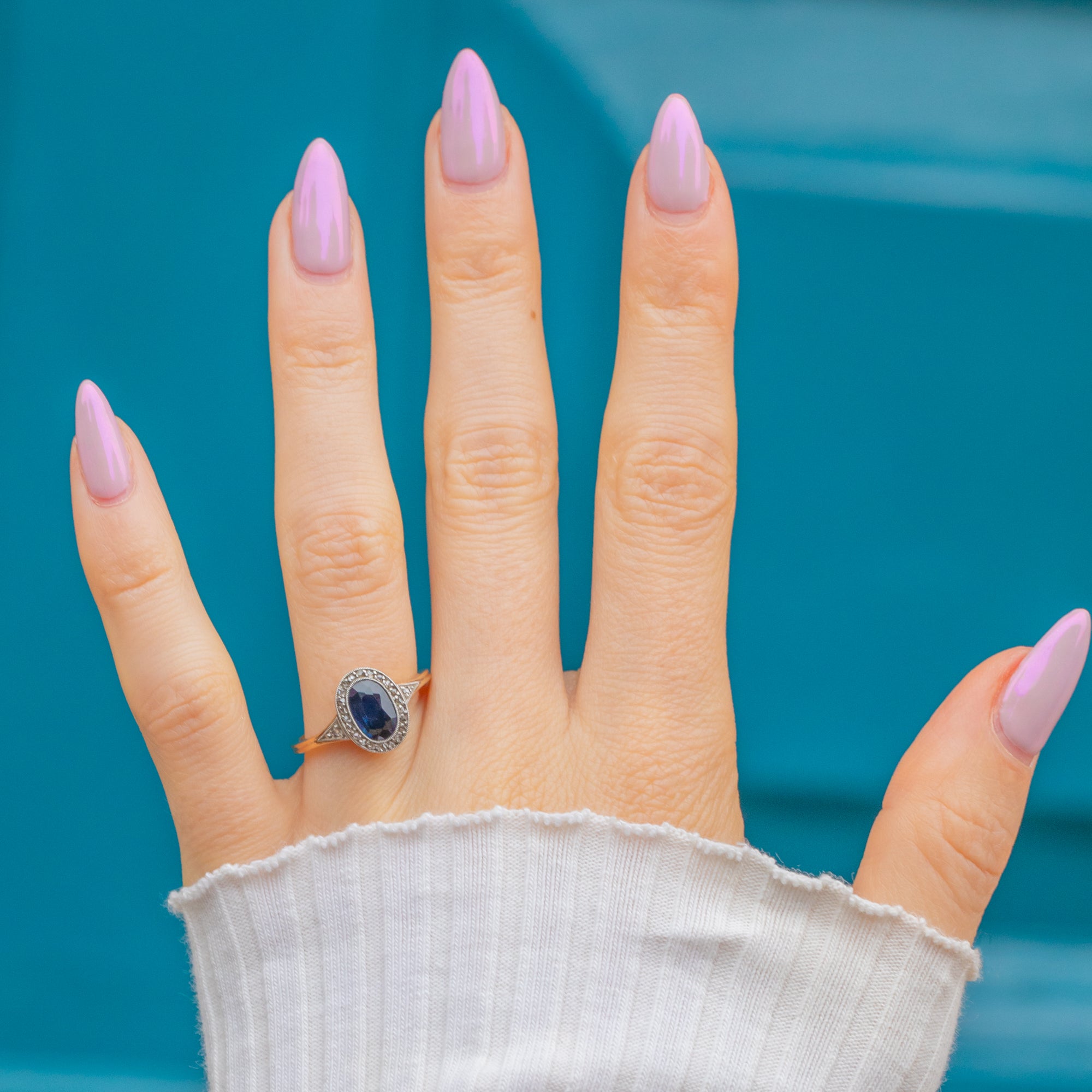 A beautiful French Art Deco cluster ring showcasing the impeccable quality and refined design typical of early 20th-century French jewellery. A dramatic, inky-blue natural Sapphire, of approximately 1.50cts, takes centre stage within a Platinum halo of twinkling Diamonds, all finely millegrain-set for that subtle, elegant shimmer the French are so well known for.