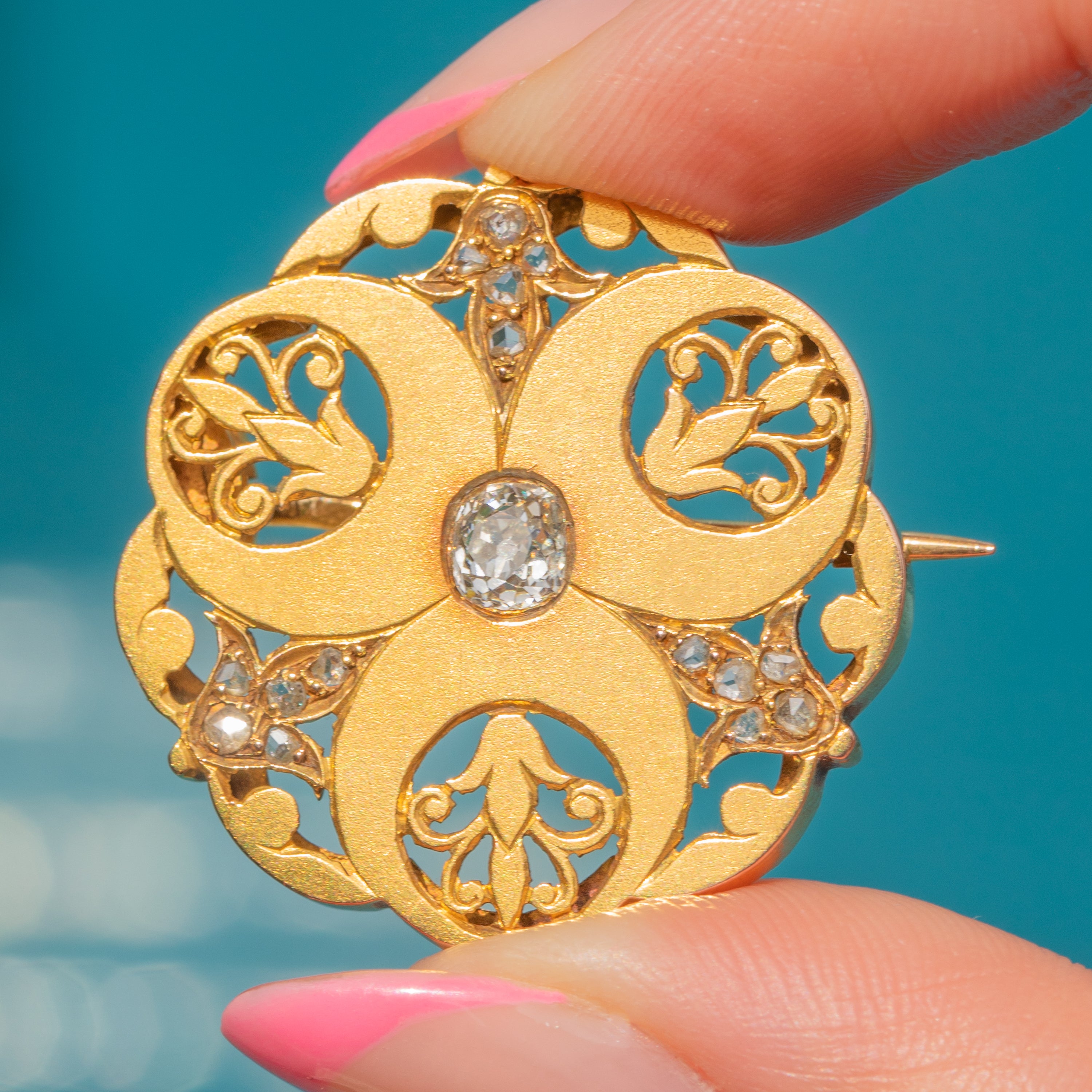 VERY GOOD-EXCELLENT: This French Art Nouveau 18ct Gold old-mine-cut Diamond openwork brooch is in superb condition. The Gold is radiant with a lovely satin finish, and the details are defined with no signs of wear. The Diamonds are all present and securely set, and the central old-mine-cut Diamond is nice and bright. The Gold shows some minor areas of discolouration on the back of the brooch, though this won't be visible while the brooch is worn. The pin is robust and sturdy, allowing you to wear this French antique Diamond brooch with absolute confidence!