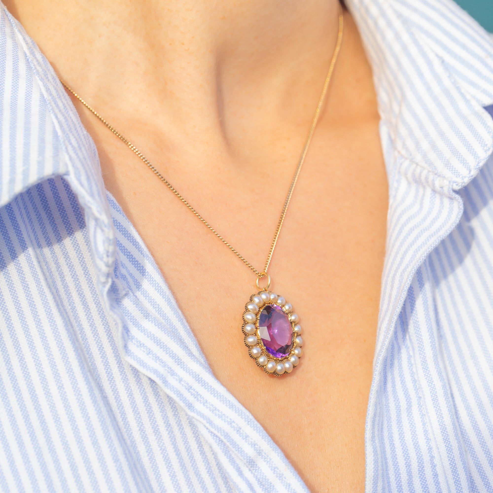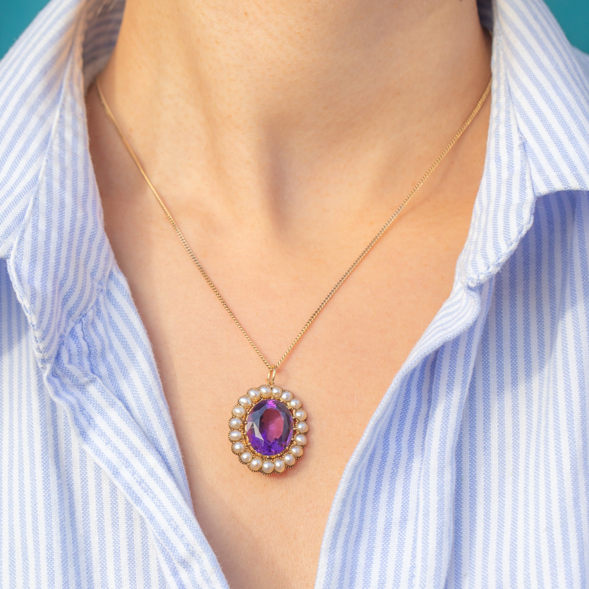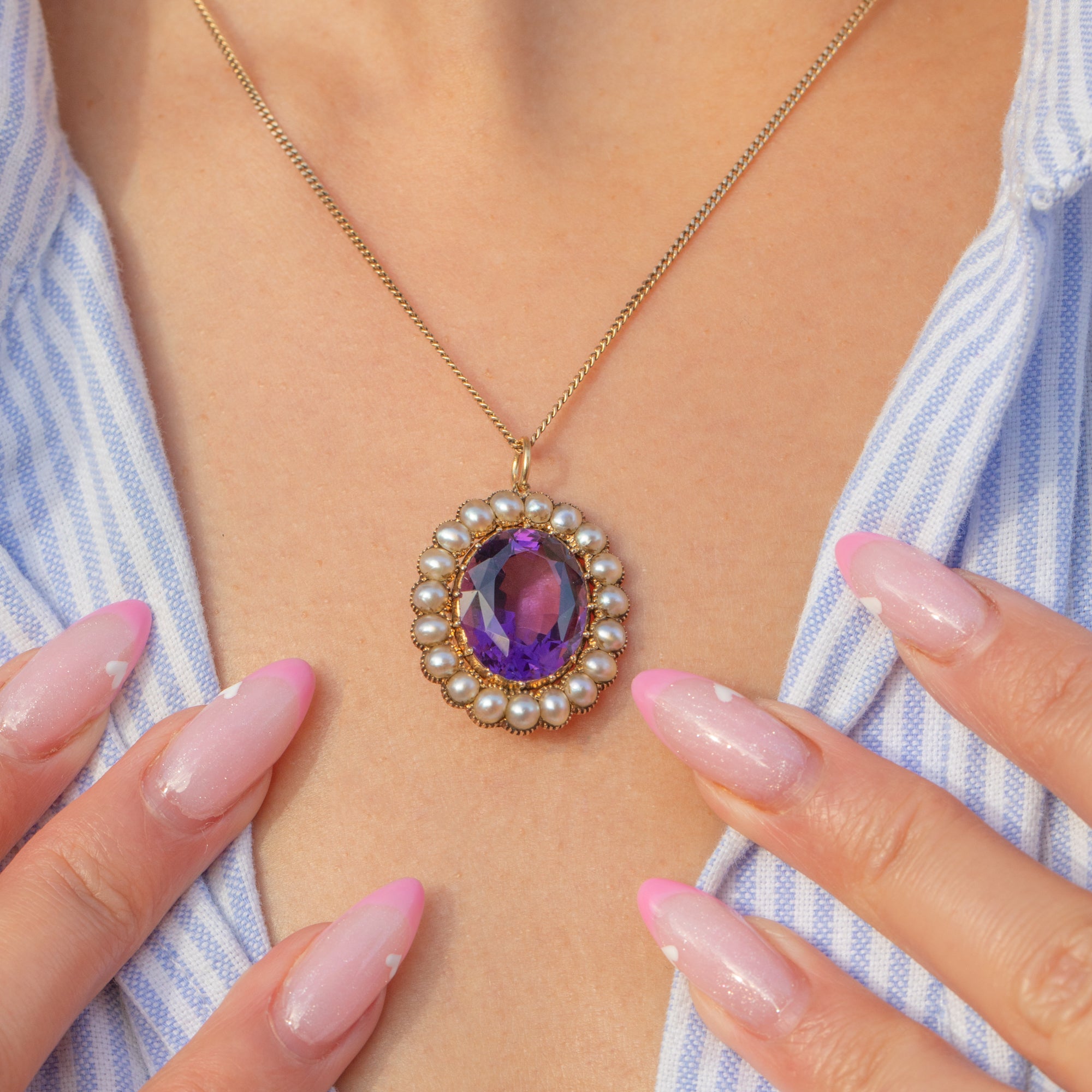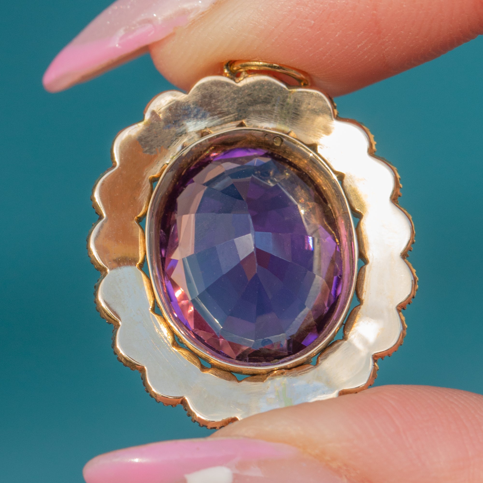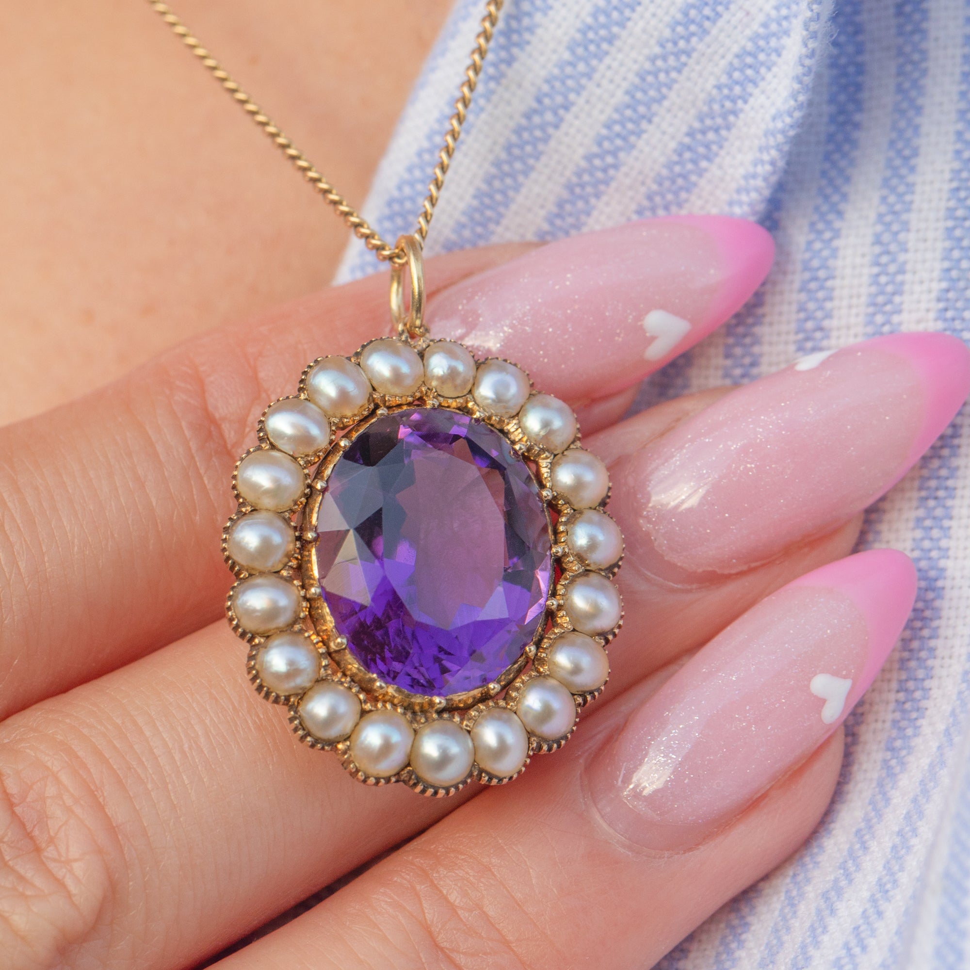 This enchanting Georgian charm is crafted in rich 15ct Gold and set with a glowing natural Amethyst framed by creamy Pearls. The 2.90ct Amethyst displays a soft violet hue and beautiful clarity with only minute natural inclusions, characteristic of antique hand-cut stones.