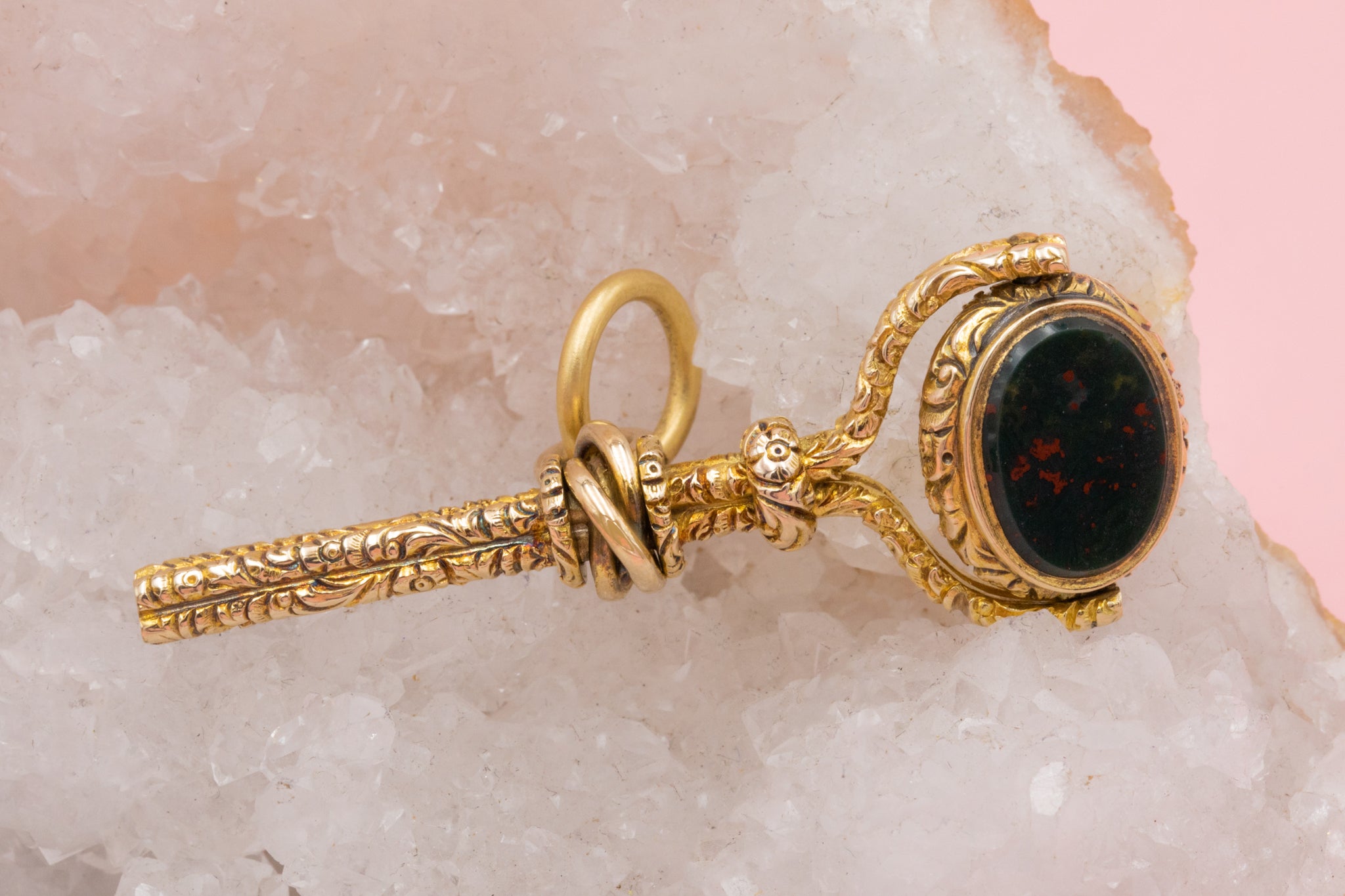EXCELLENT. This Georgian 15ct Gold fancy swivel fob watch key pendant is in excellent condition. The 15ct Gold remains in great nick throughout, with the repoussé design fully intact. The gemstones are securely set, and the swivel mechanism is in fine working order. The jump-ring is also securely attached for your peace of mind!