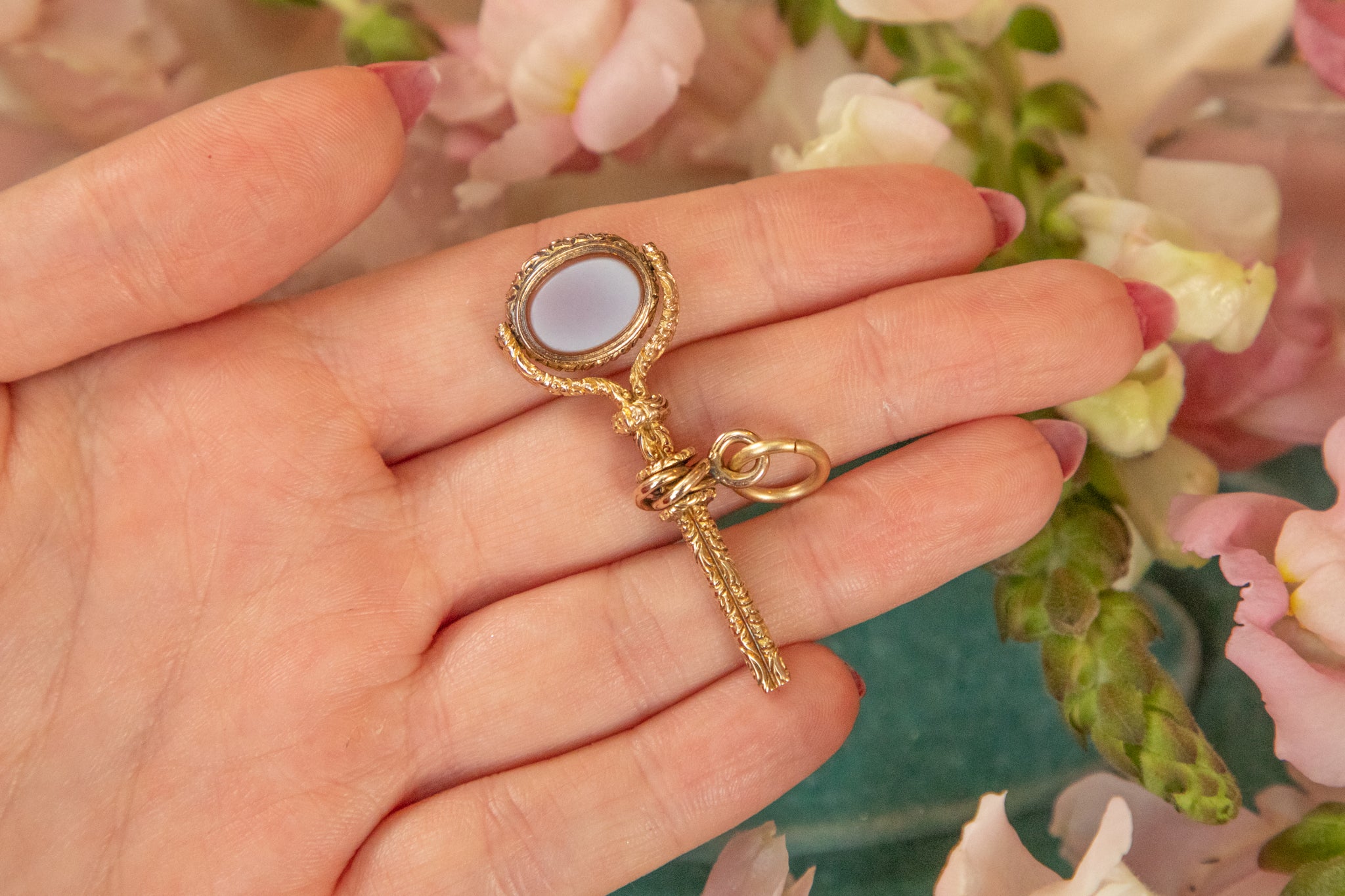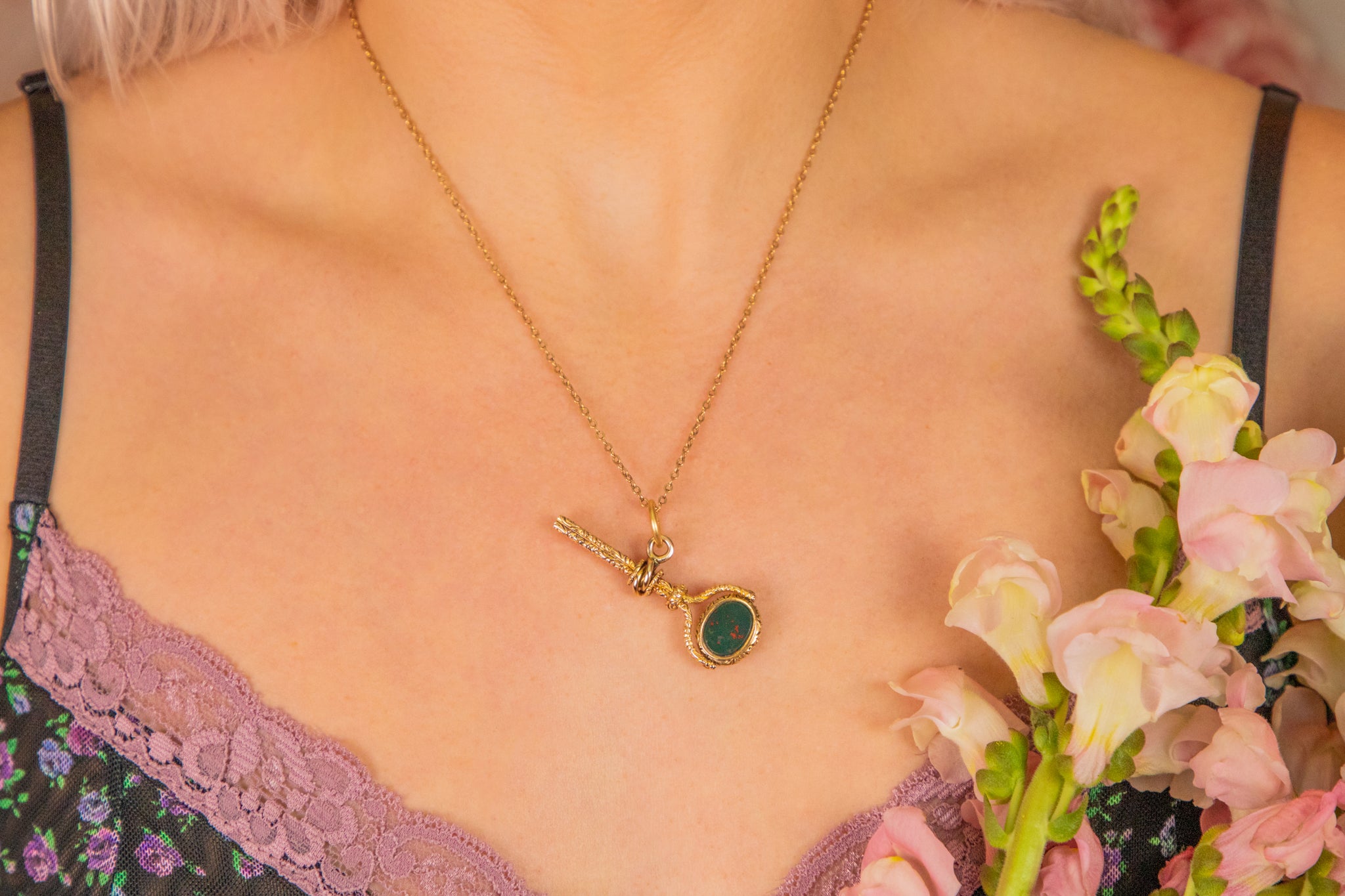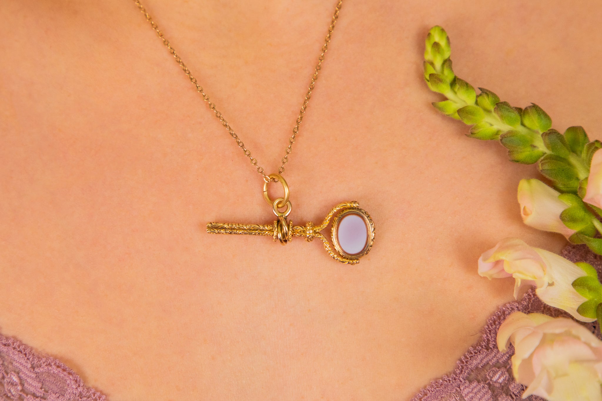 We adore the contrast of lilac and burnt orange Agate against the forest green Bloodstone. You can even swivel her around depending on your mood! She will hang from a Gold chain at a lovely angle, adding a glamorous dose of Georgian charm to any necklace stack.