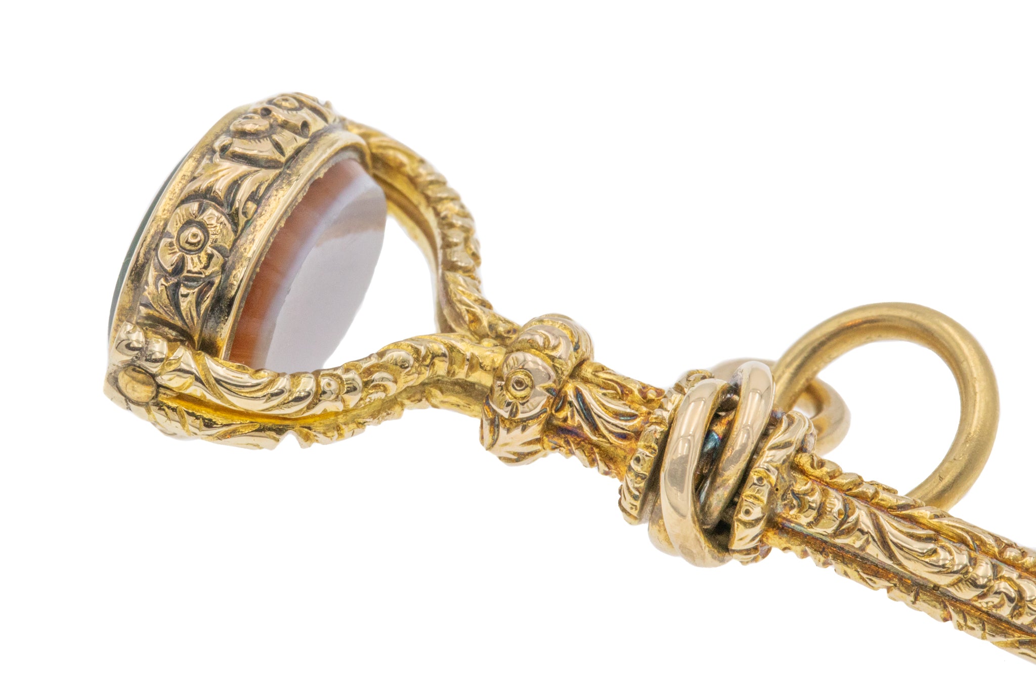 A gorgeous Georgian 15ct Gold fancy swivel fob watch key pendant. From her wonderful Gold repoussé to her sumptuous knotted bale, this pendant has enough components to keep you interested for a lifetime!