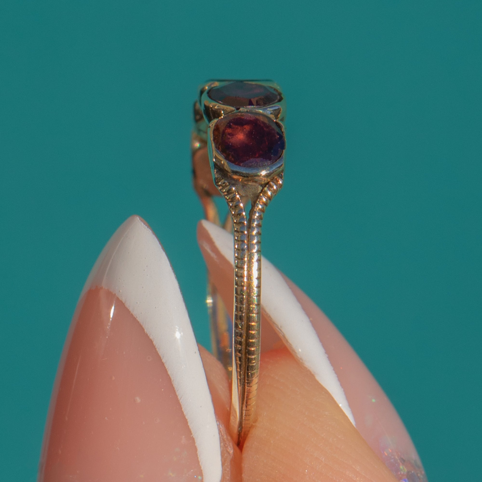 A beautiful Georgian five-stone ring set with glowing flat-cut Garnets, each displaying that rich, berry-red tone so beloved of the era. The gemstones are closed-back and foiled, enhancing their colour and giving the ring that unmistakable antique luminosity.