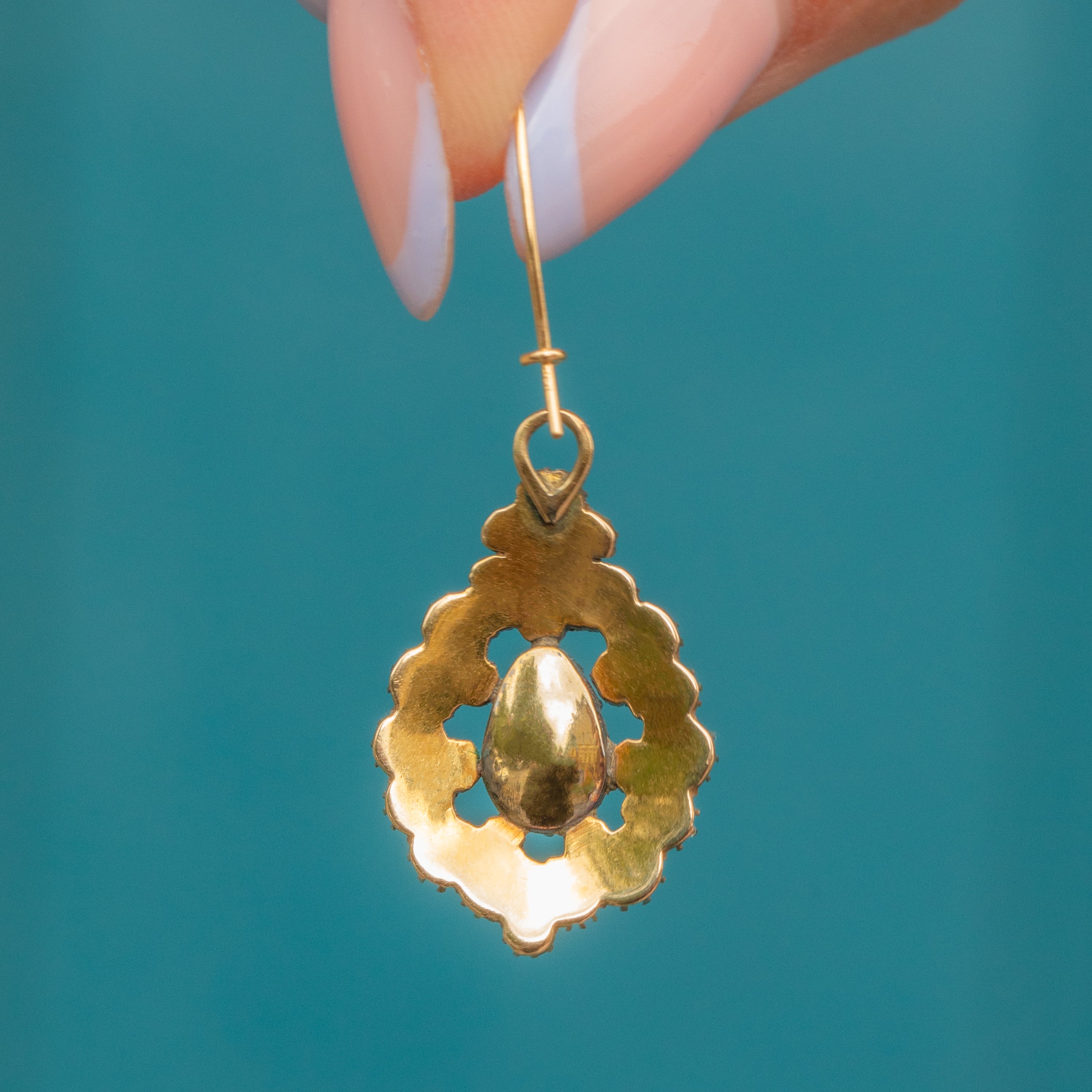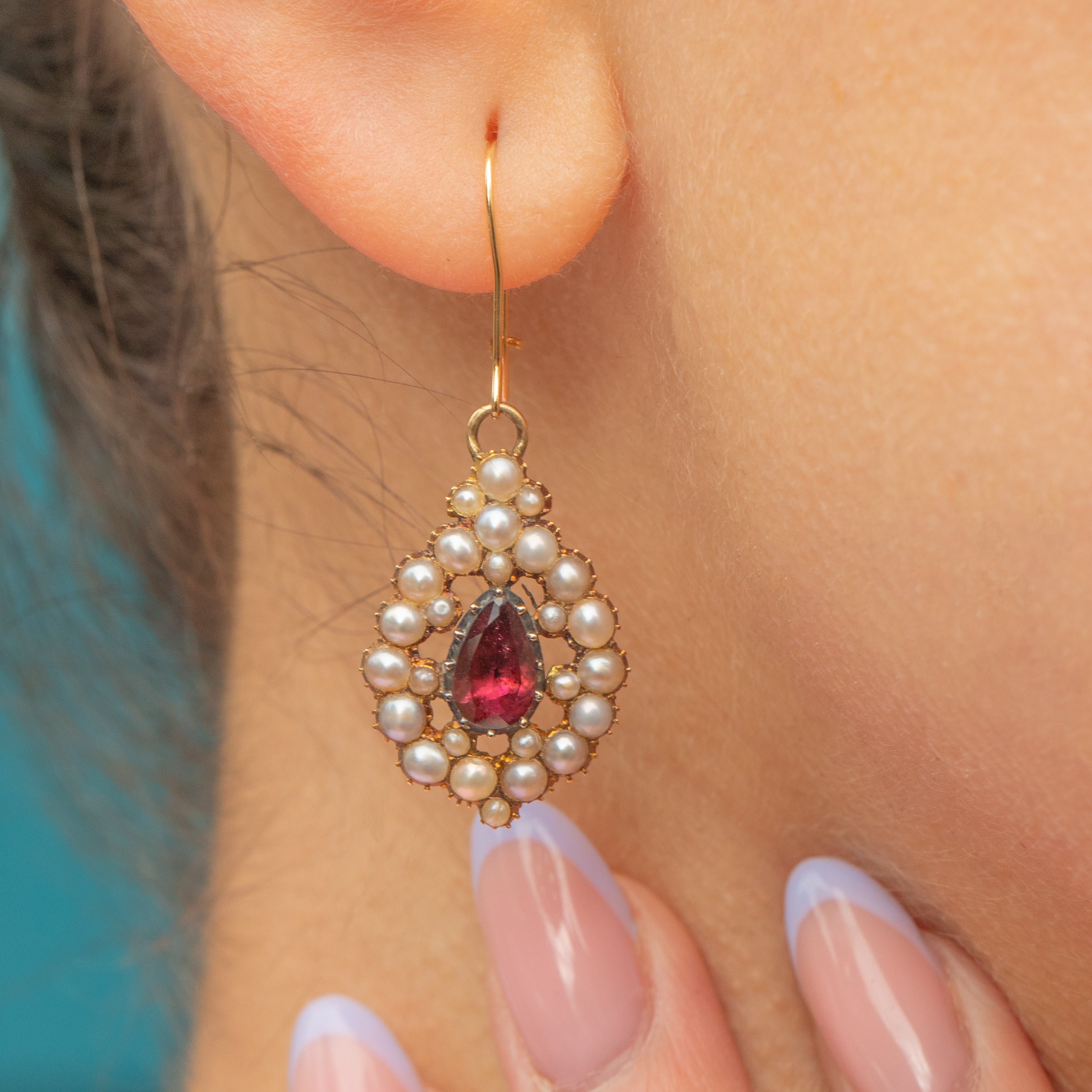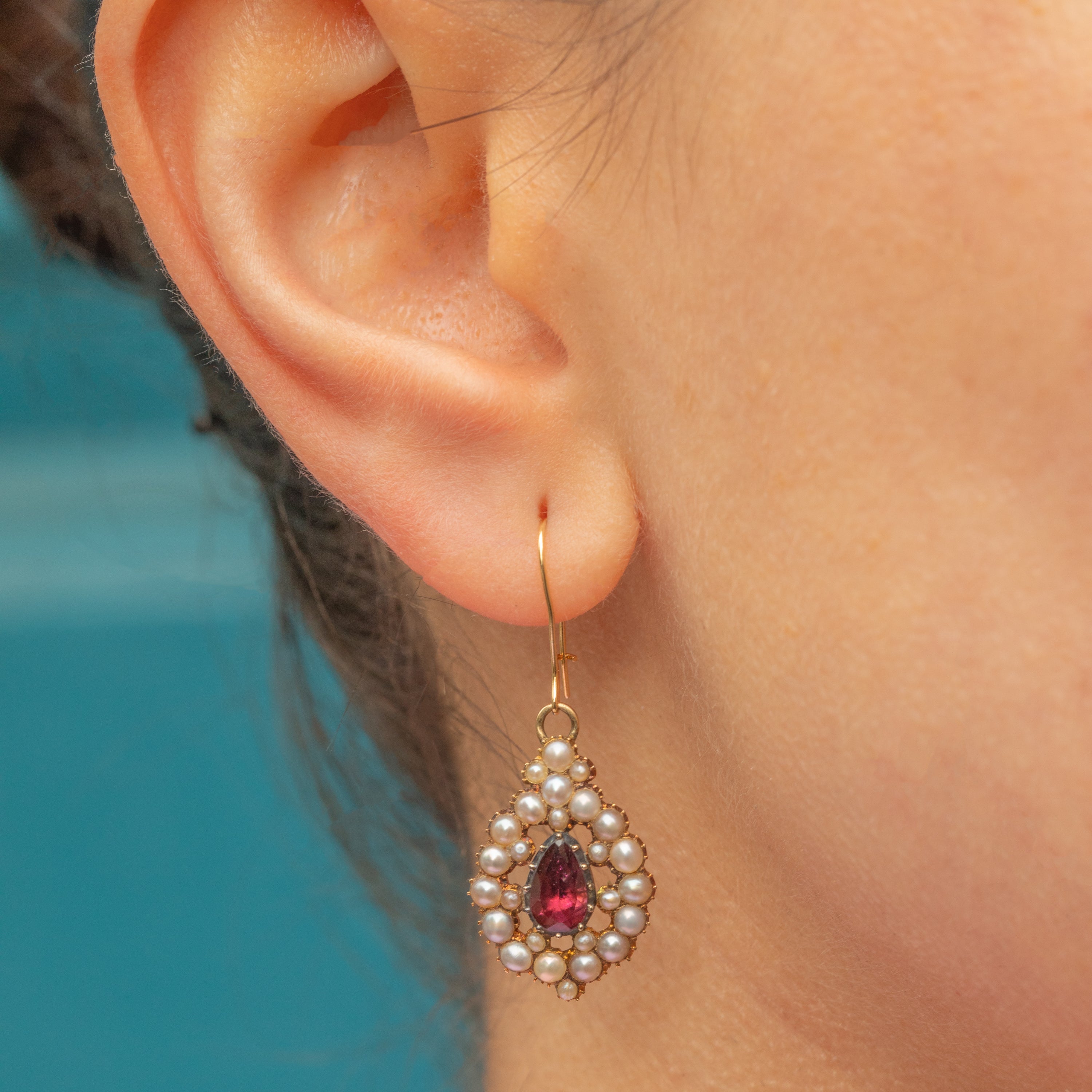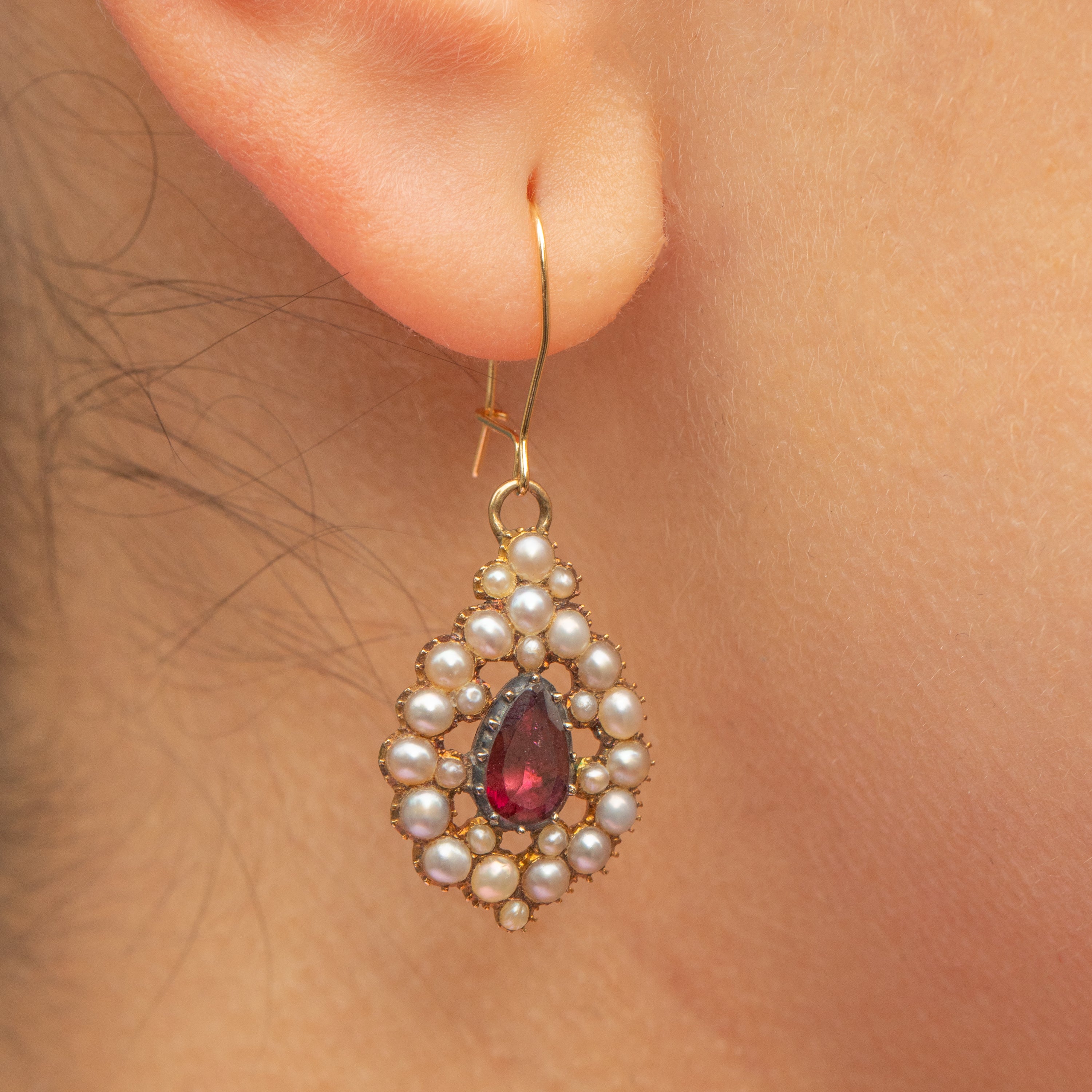 Crafted from buttery 15ct Gold, with later added 18ct Gold hooks, these antique earrings are packed with Georgian luxury, featuring a cluster of iridescent Pearls surrounding a juicy berry-red pear drop Garnet.