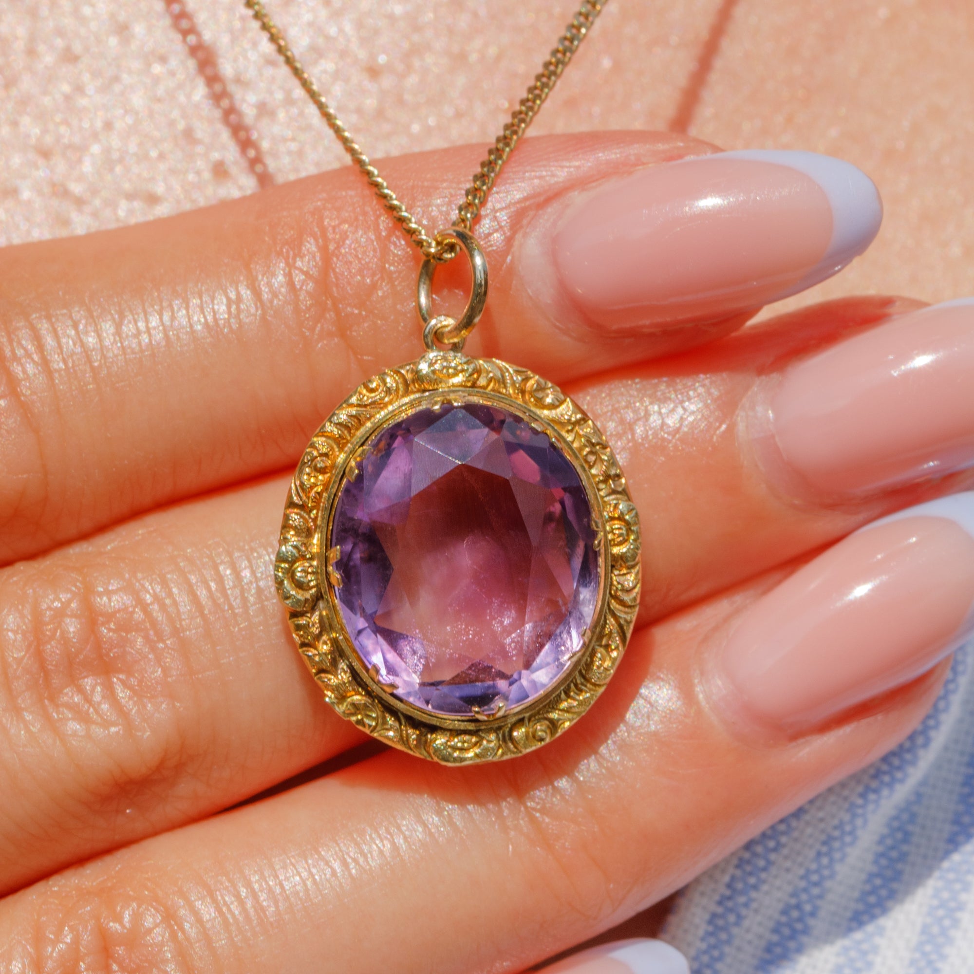 This Georgian 18ct Gold chased Amethyst pendant radiates antique charm!