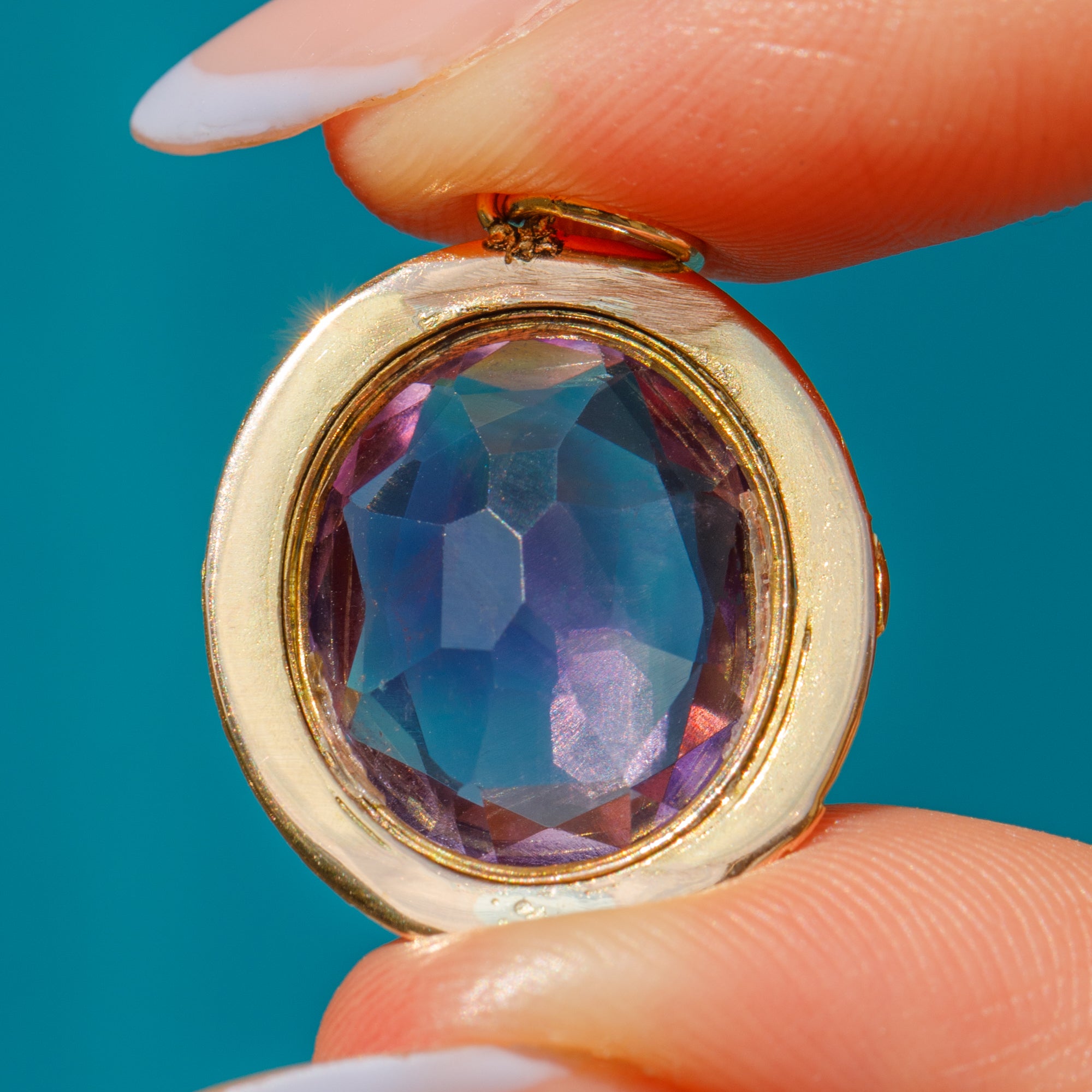 VERY GOOD-EXCELLENT: This Georgian 18ct Gold chased Amethyst pendant is in great condition. The Amethyst is radiant, faceted beautifully and free from any scuffs or scratches. There are some very minor signs of wear and spots of discolouration to the Gold, though this is expected with age. With a securely soldered jump ring, you can wear her with utmost confidence.