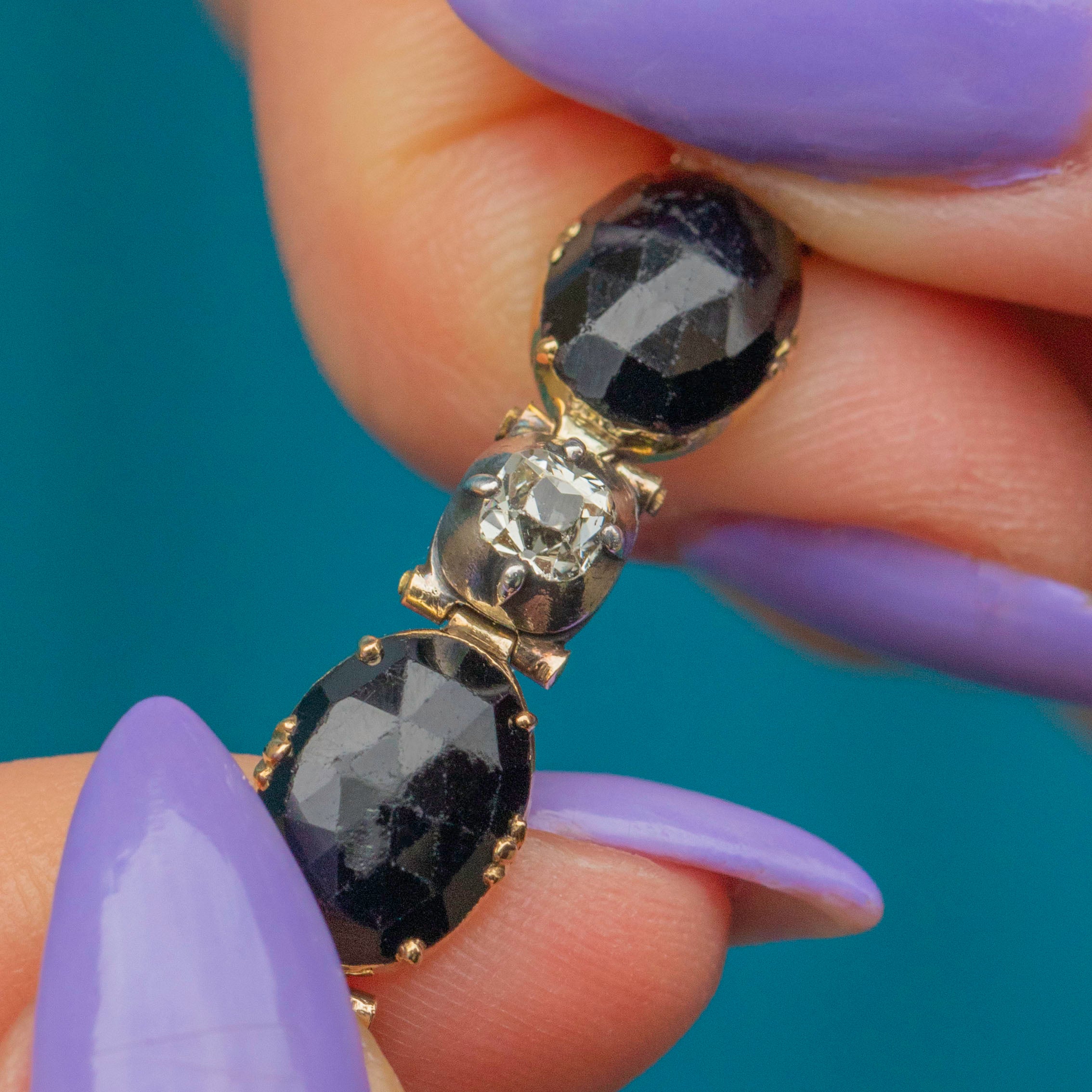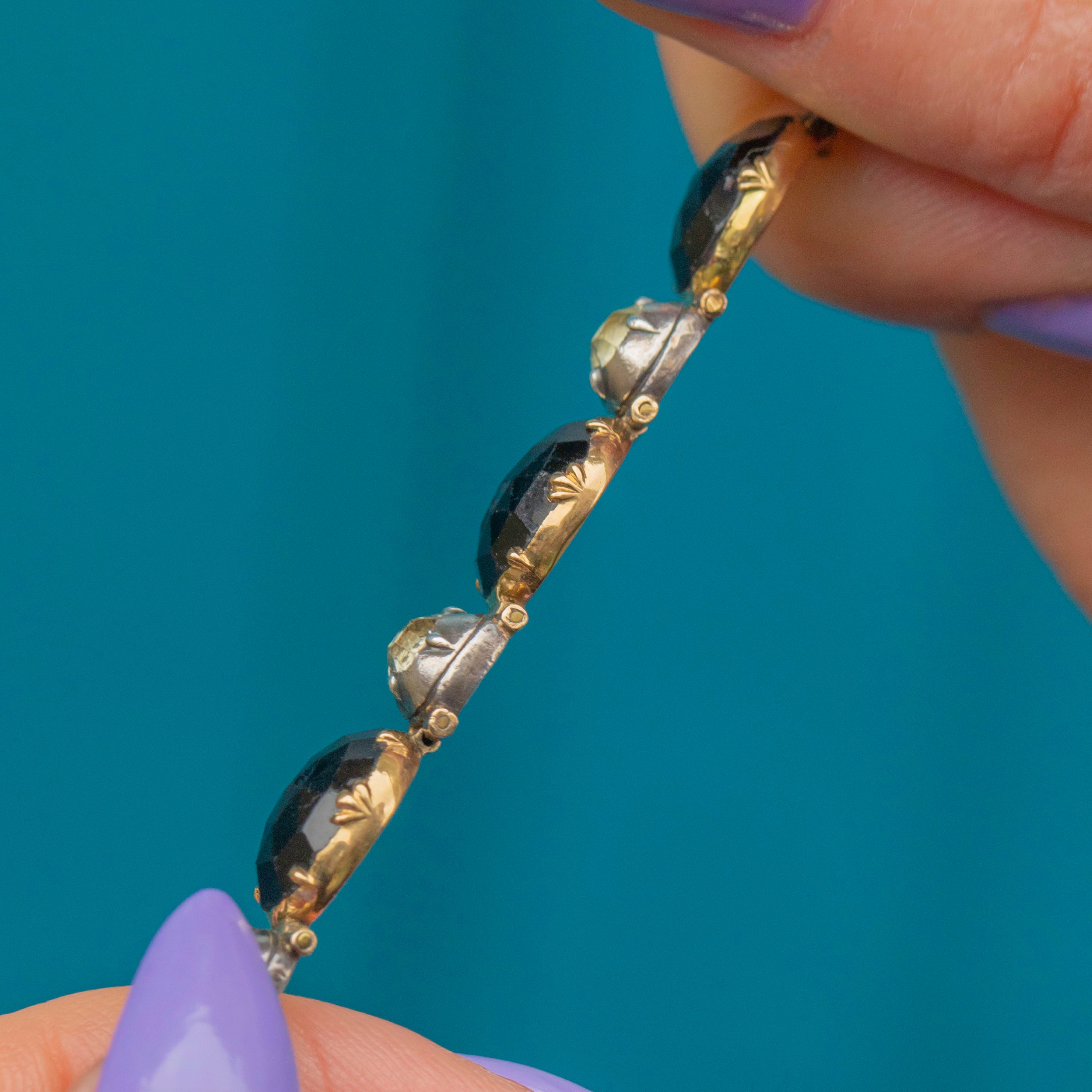 VERY GOOD: This stunning Georgian 18ct Gold French Jet bracelet is in very good condition. The gemstones are all present and securely set, with only some minor fleabites commensurate with age. The Gold is bright and buttery, and the Silver is lustrous with a light patina accrued over the years, adding to its antique charm. With each link securely connected and the clasp in fine working condition, you can wear this Georgian bracelet with absolute confidence!