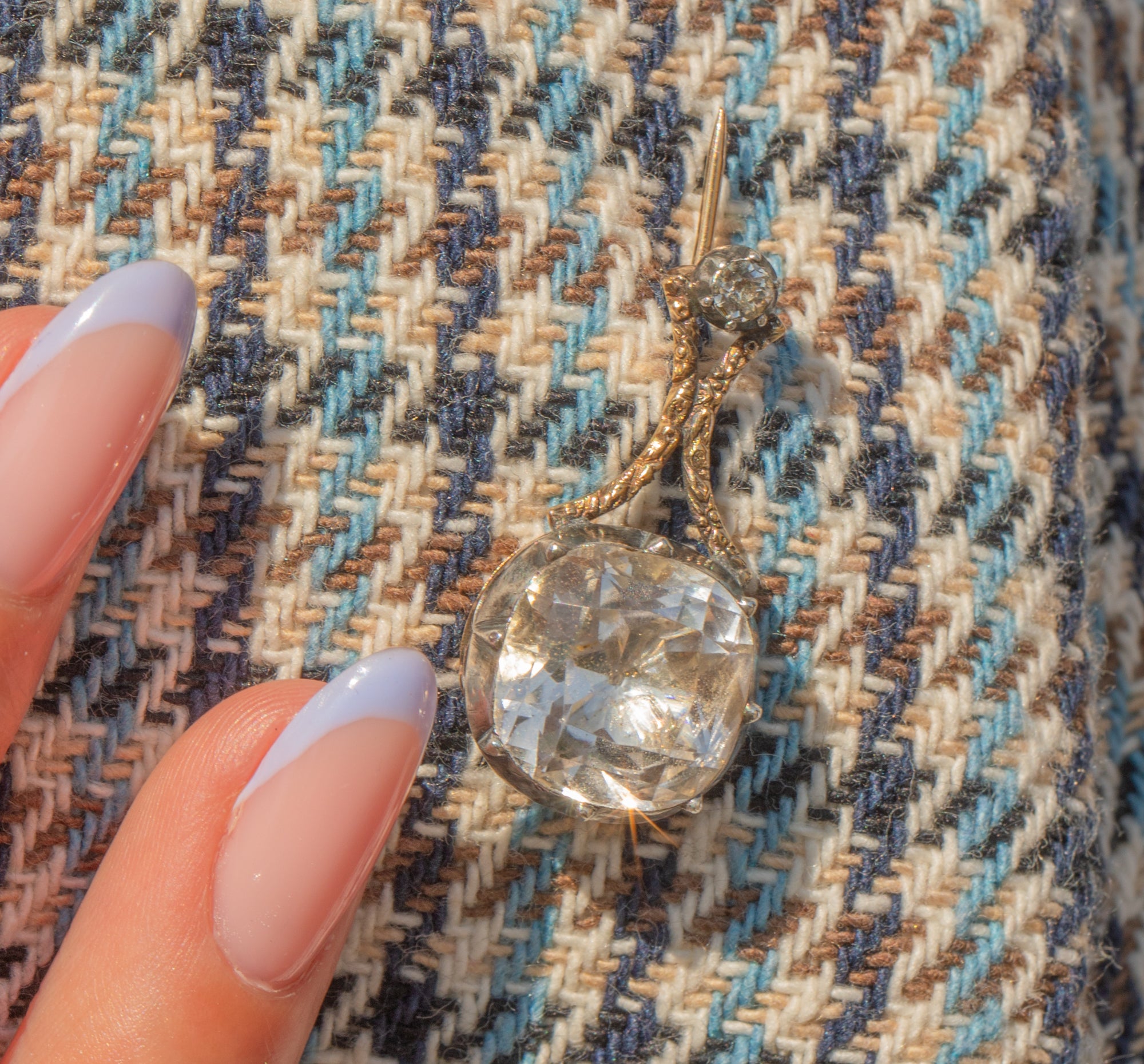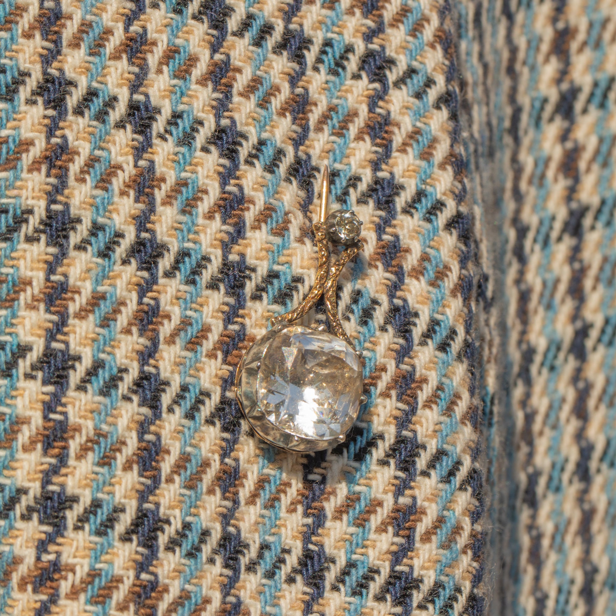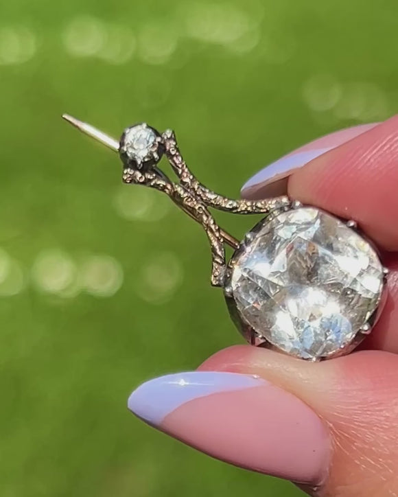 VERY GOOD-EXCELLENT: This Georgian 18ct Gold Rock Crystal Halley's Comet brooch is in wonderful condition, which is no mean feat when considering its impressive age. The Rock Crystals are bright with no signs of wear, and held securely within their collet settings. The Silver has accrued a light patina, enhancing the brilliance of the gems. There are some mild signs of surface wear throughout, but none that detract from the overall impact of the piece. With a robust pin, you can confidently wear this phenomenal Georgian Halley's Comet brooch!