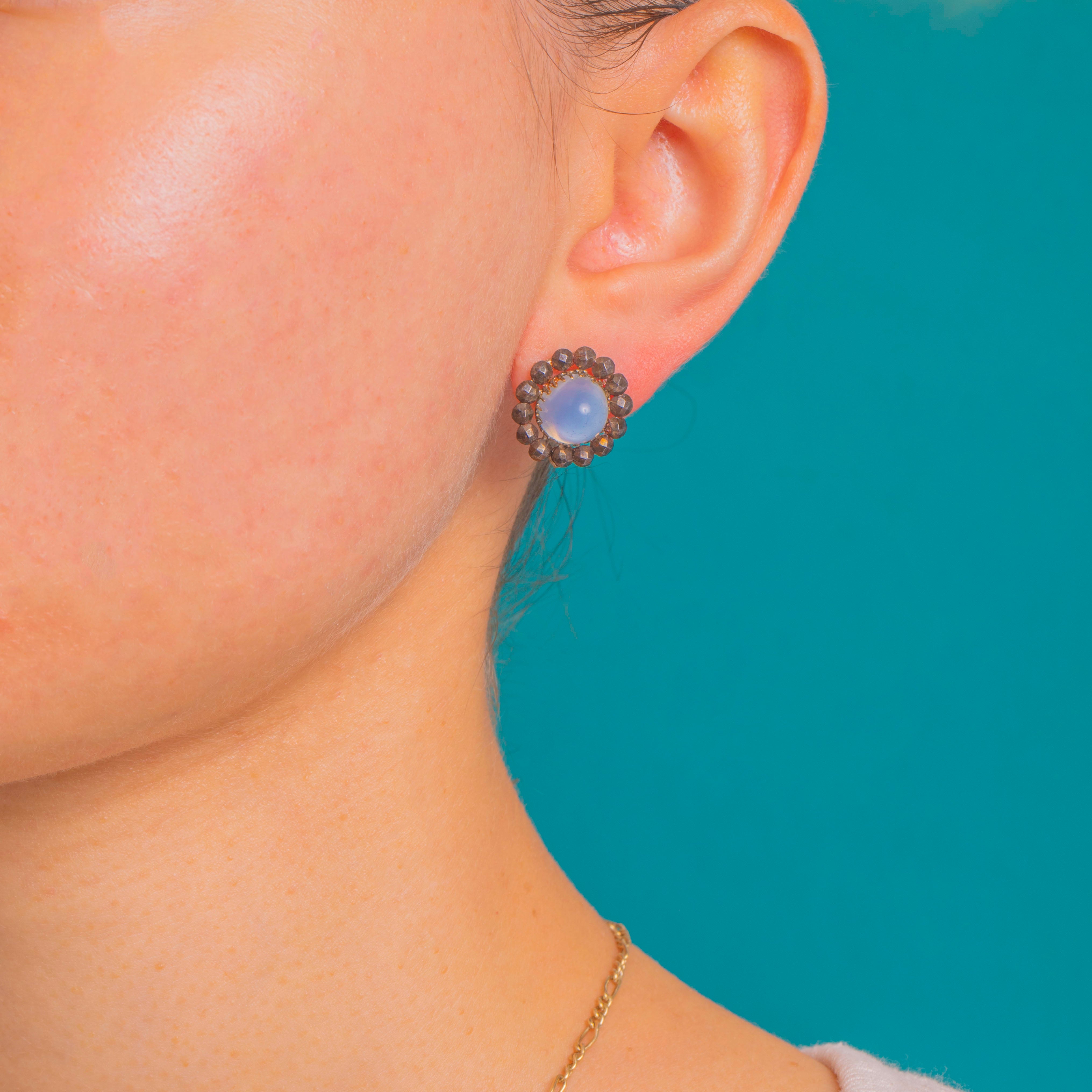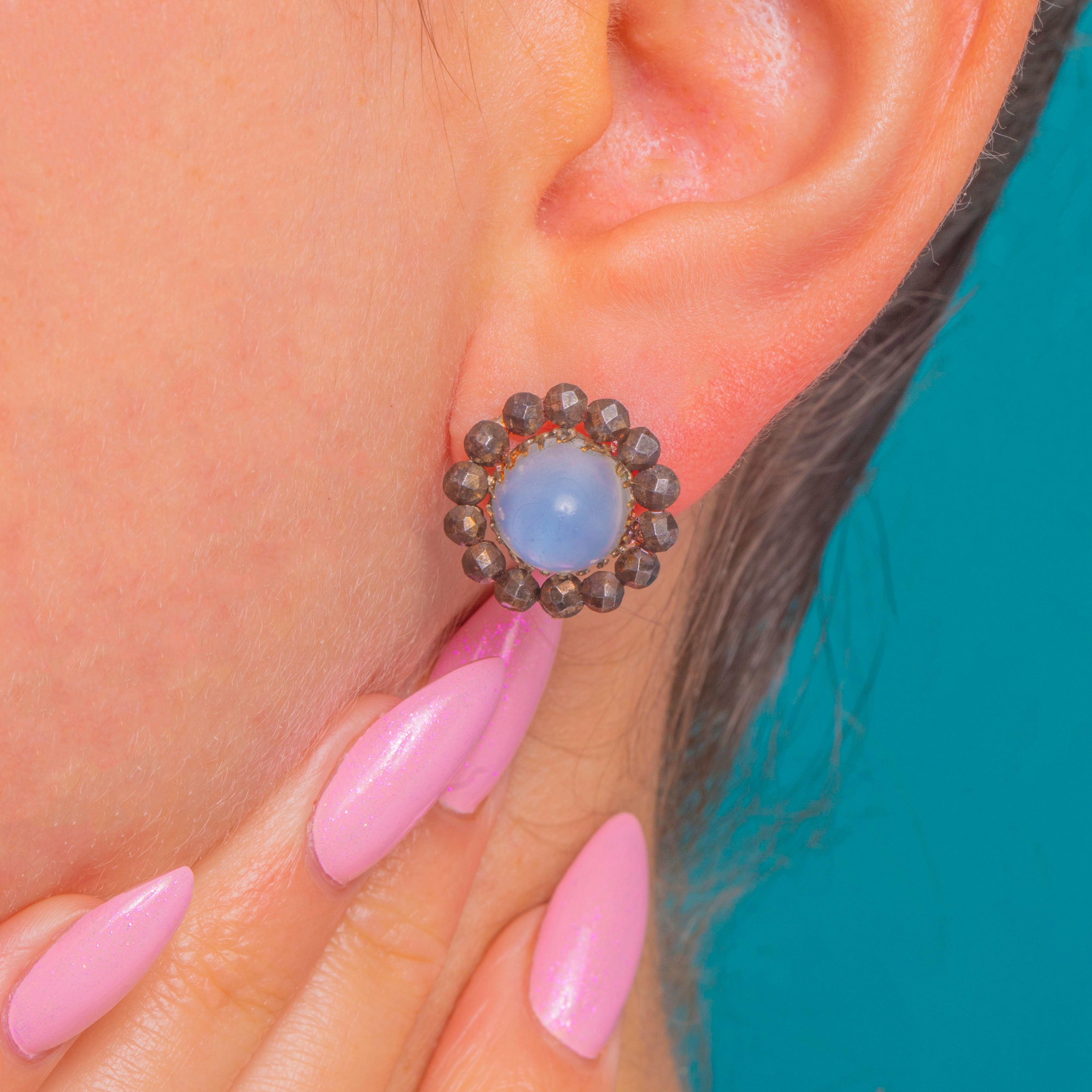 Cool sky-blue meets antique sparkle in these characterful cluster studs. Each earring centres a Blue Chalcedony sugarloaf cabochon, its softly domed glow encircled by a halo of scintillating Georgian Cut Steel. The contrast of pale blue against gunmetal facets creates a refined rosette that catches the light with every turn.